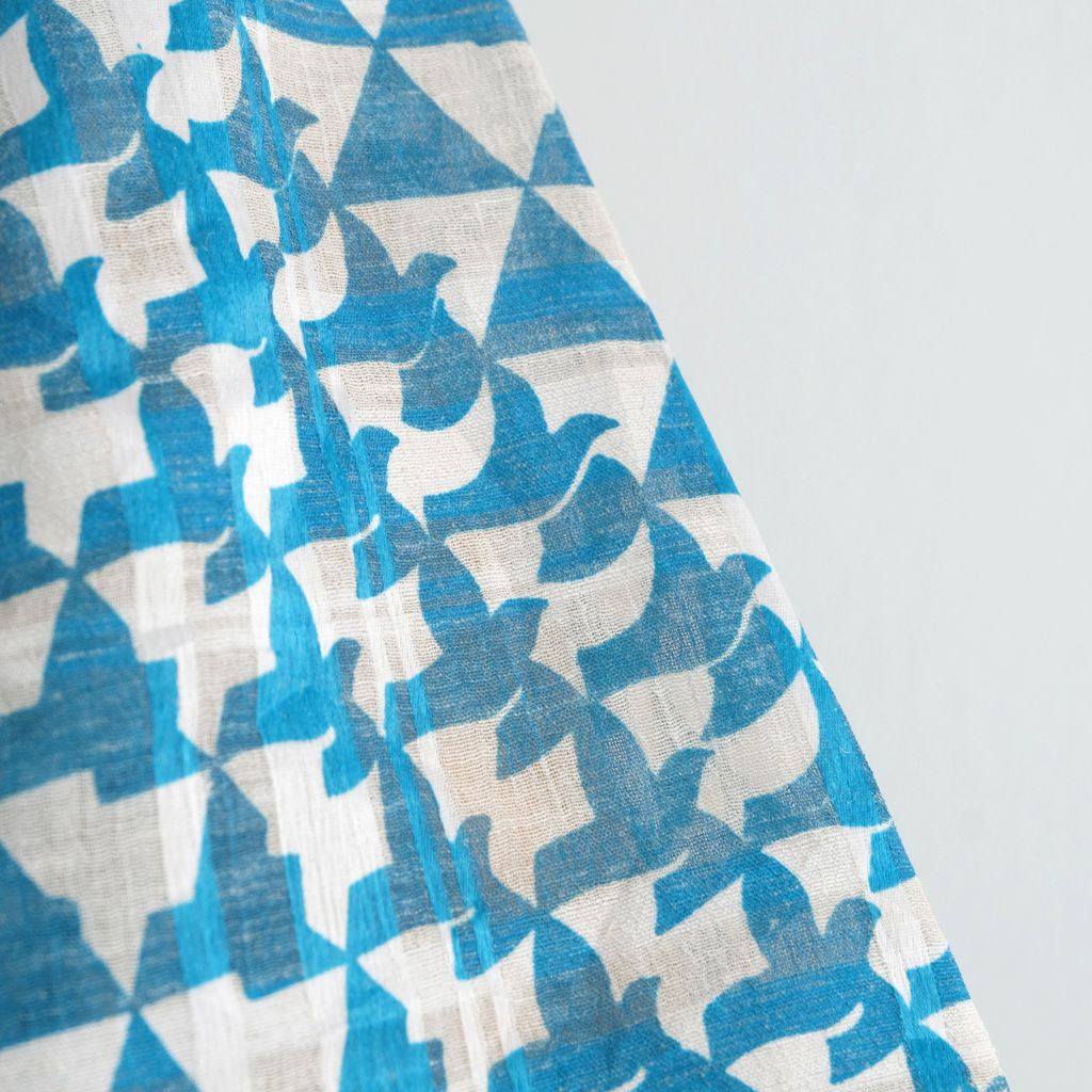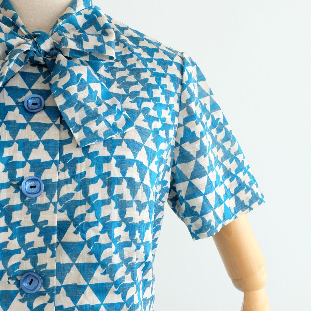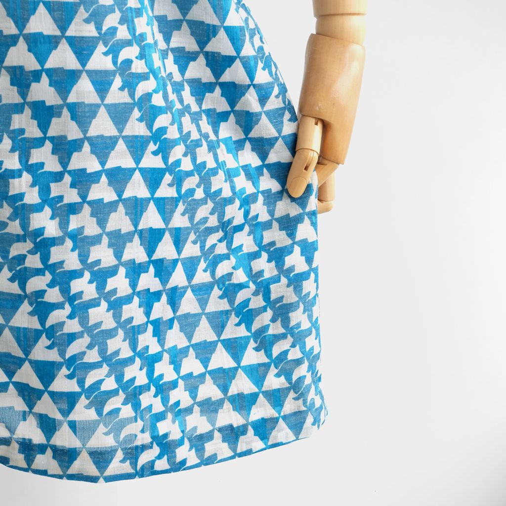 Circa 1960s. Cream white shift dress with repetitive blue graphic.