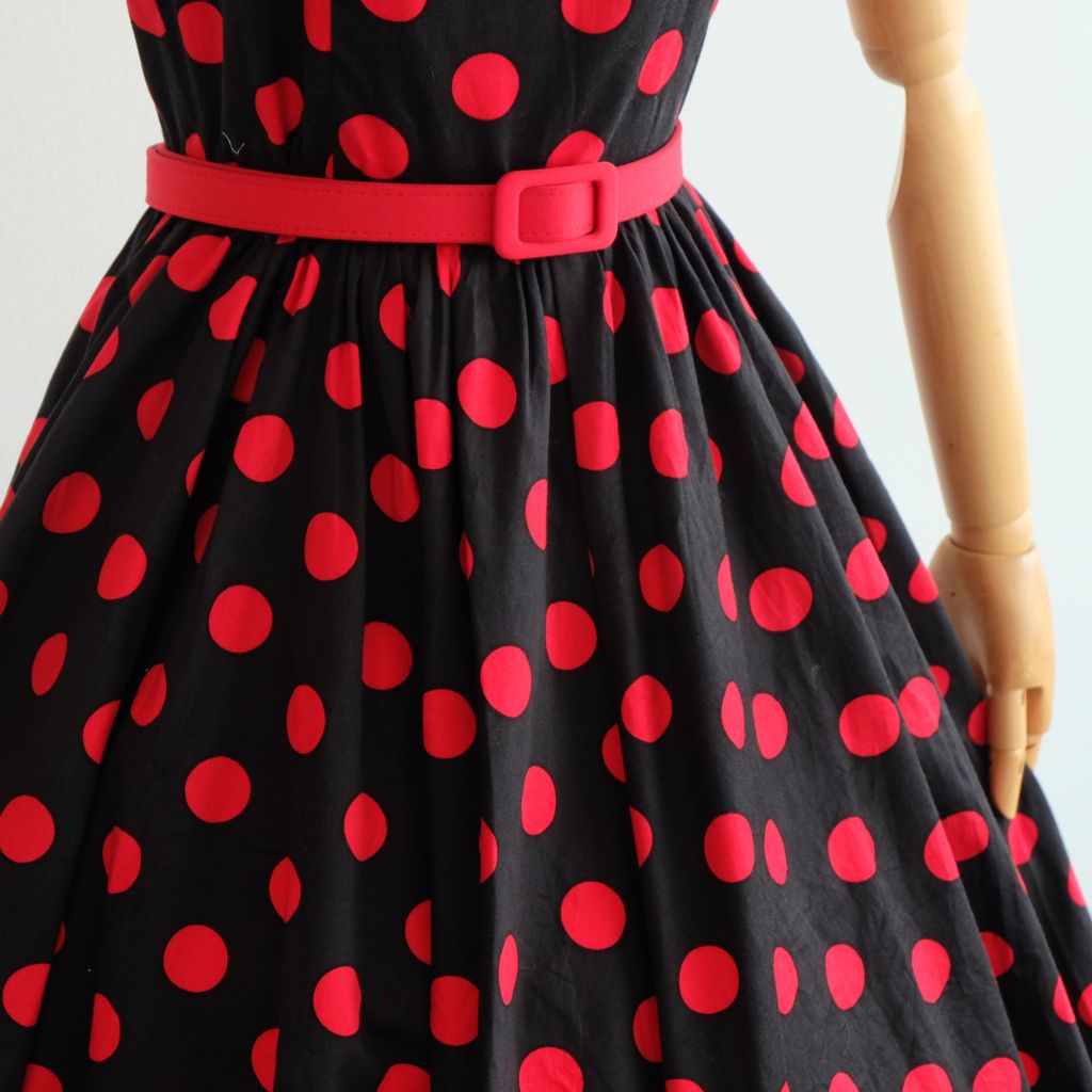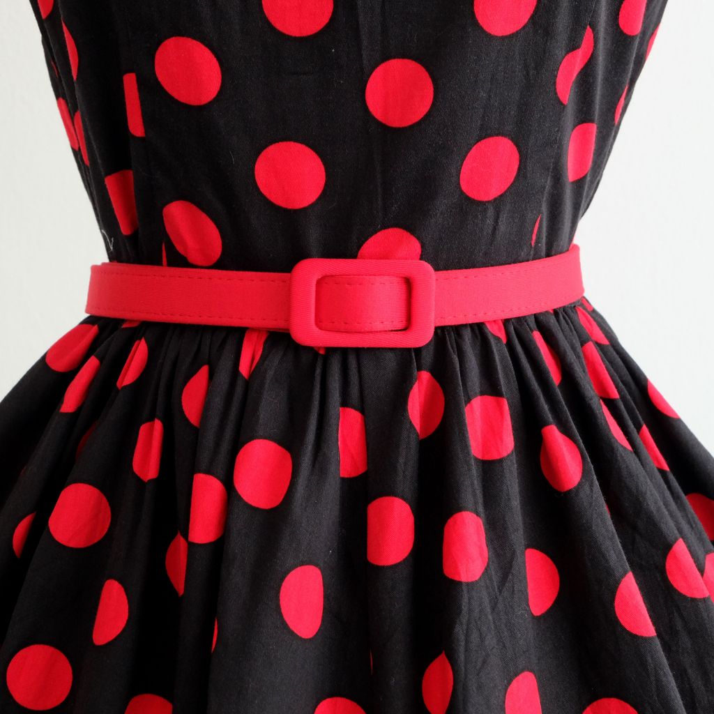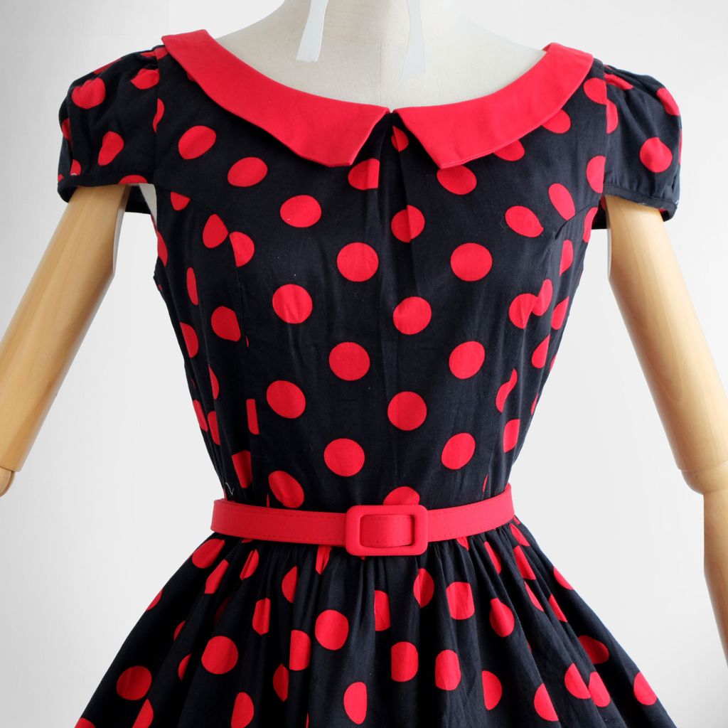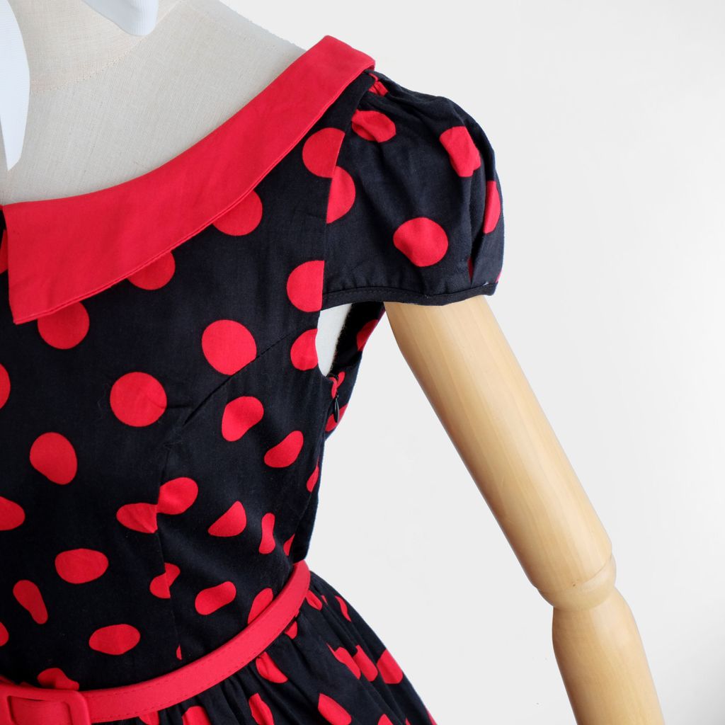 50s inspired pin up swing dress.  Peter pan collar neckline. Cap sleeves. Size zip closure. Beautiful full circle dress. Fitted waist. Cotton fabric. Belt not included.