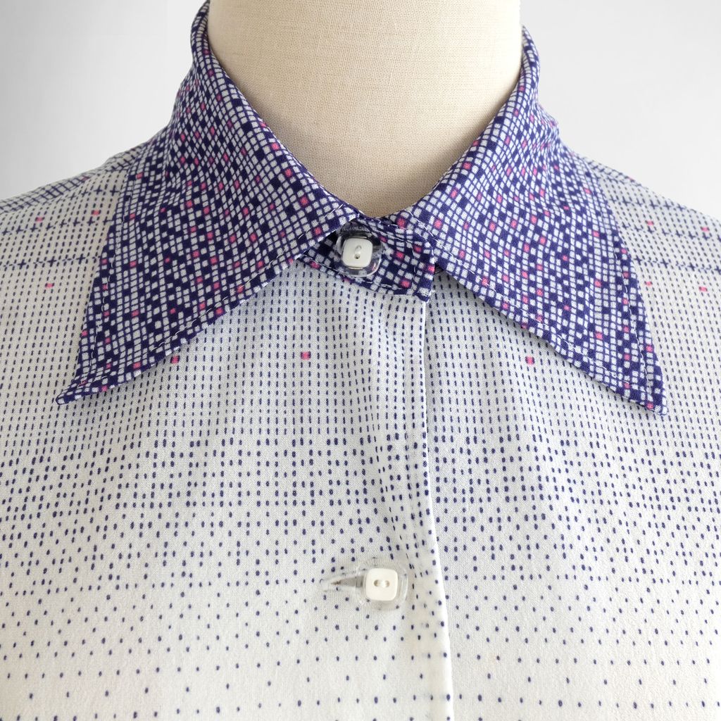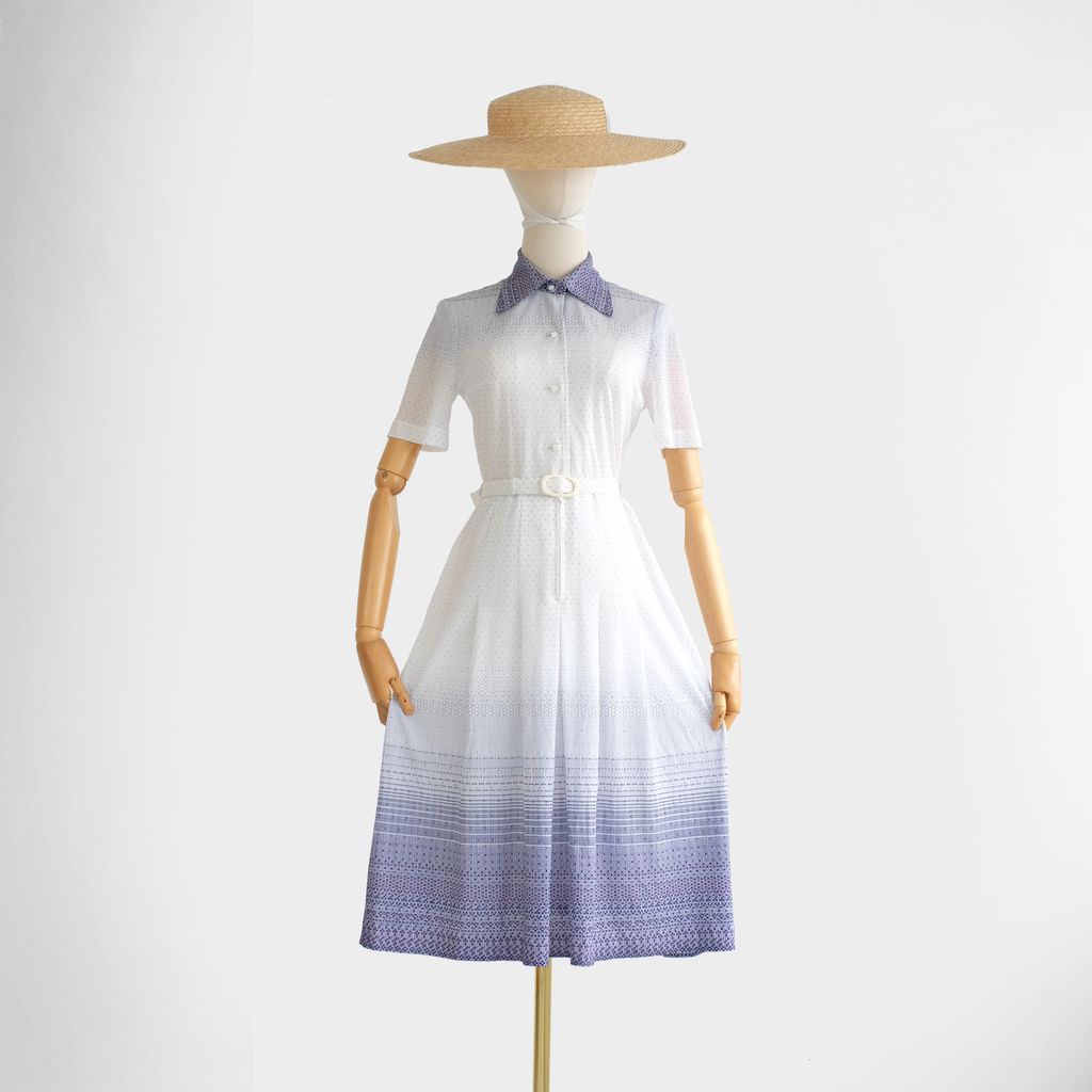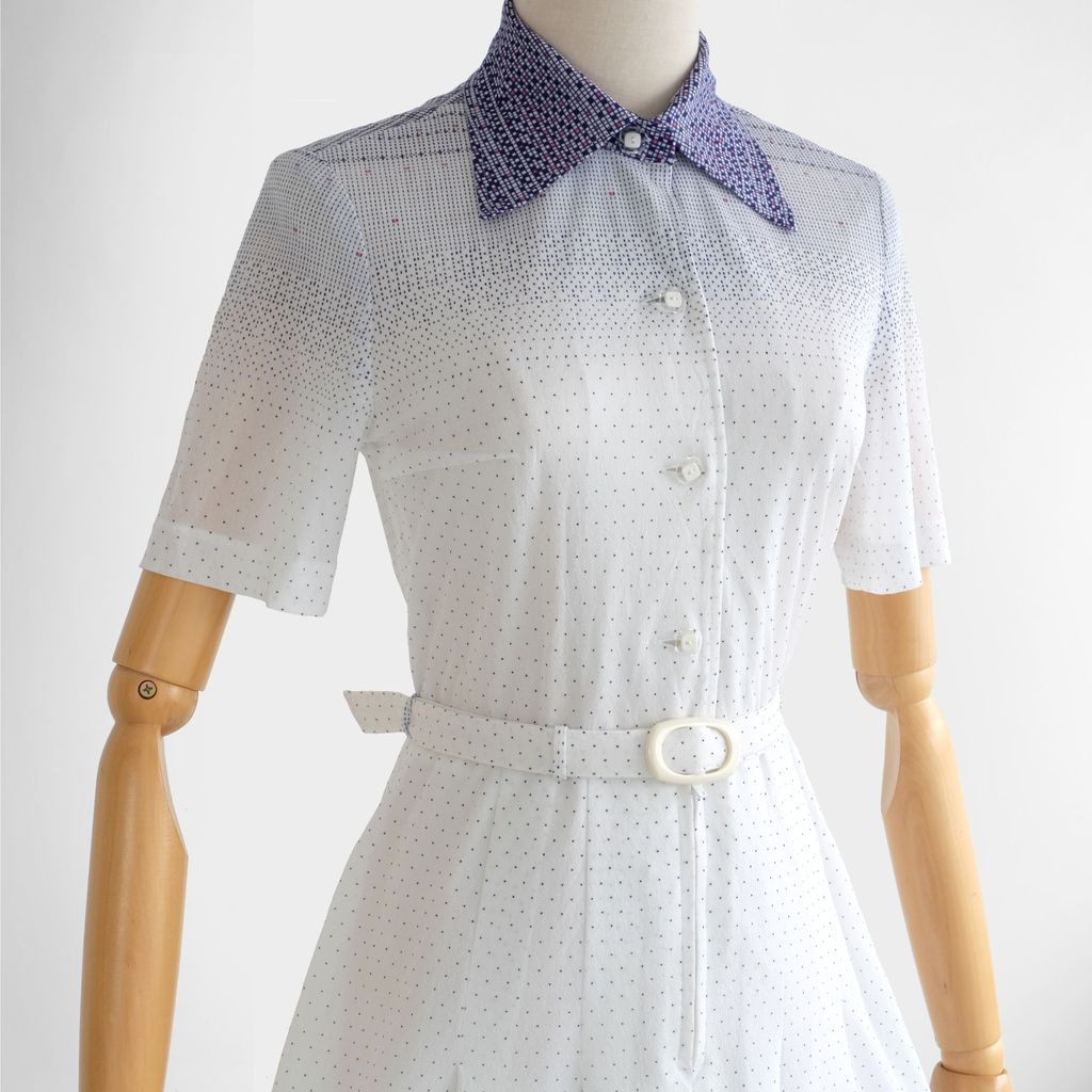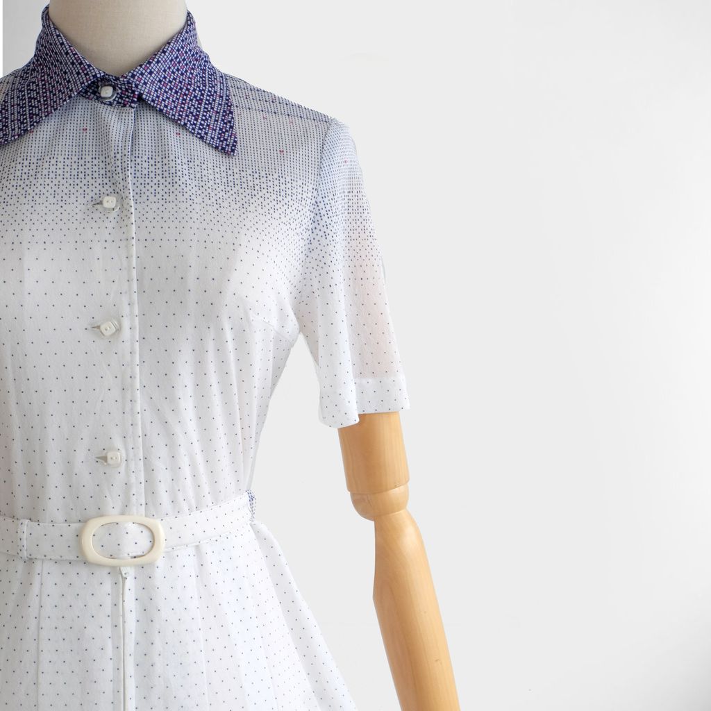 Front buttons closure.  Fitted waist with zip closure. Top unlined, bottom lined. Matching belt included. Polyester crepe fabric.