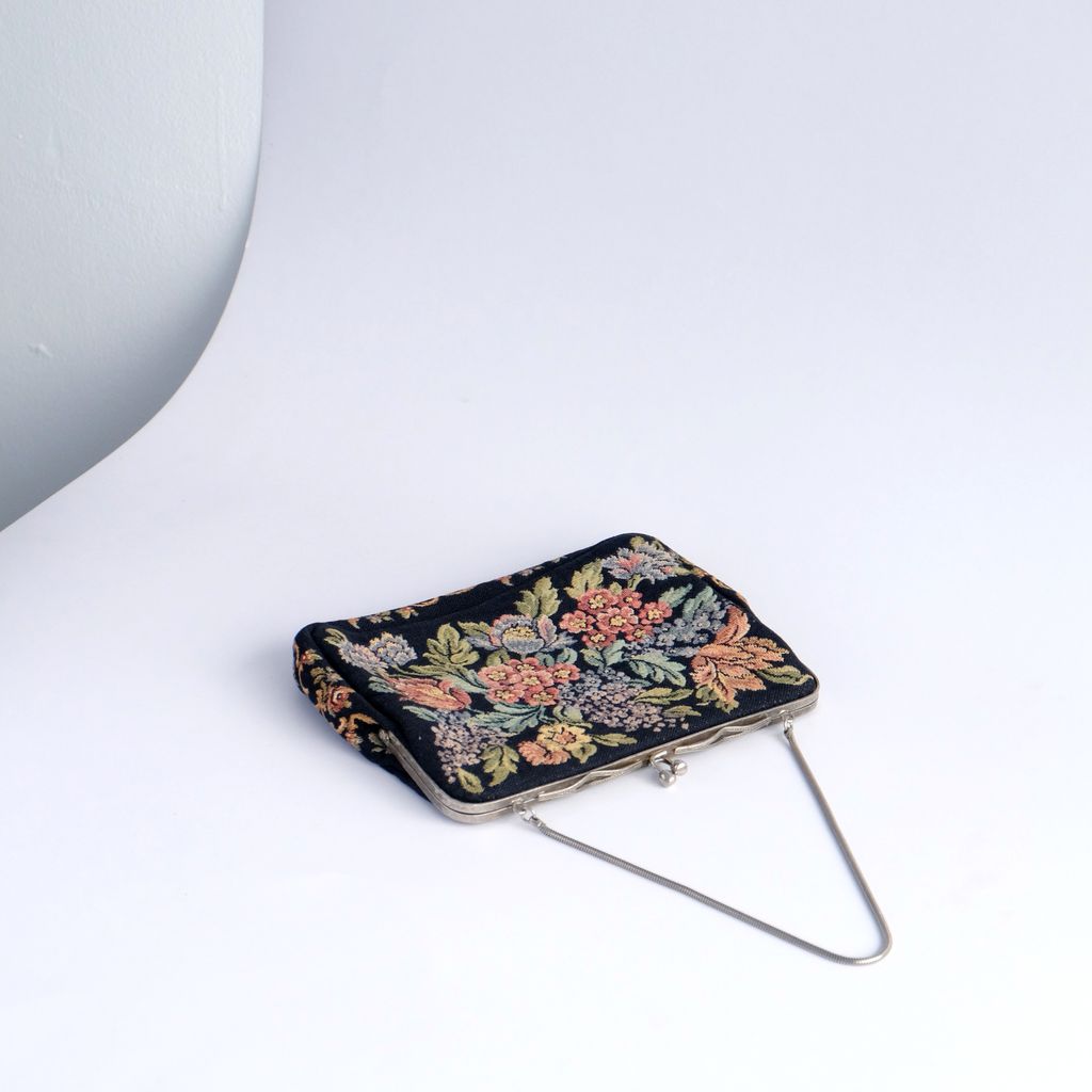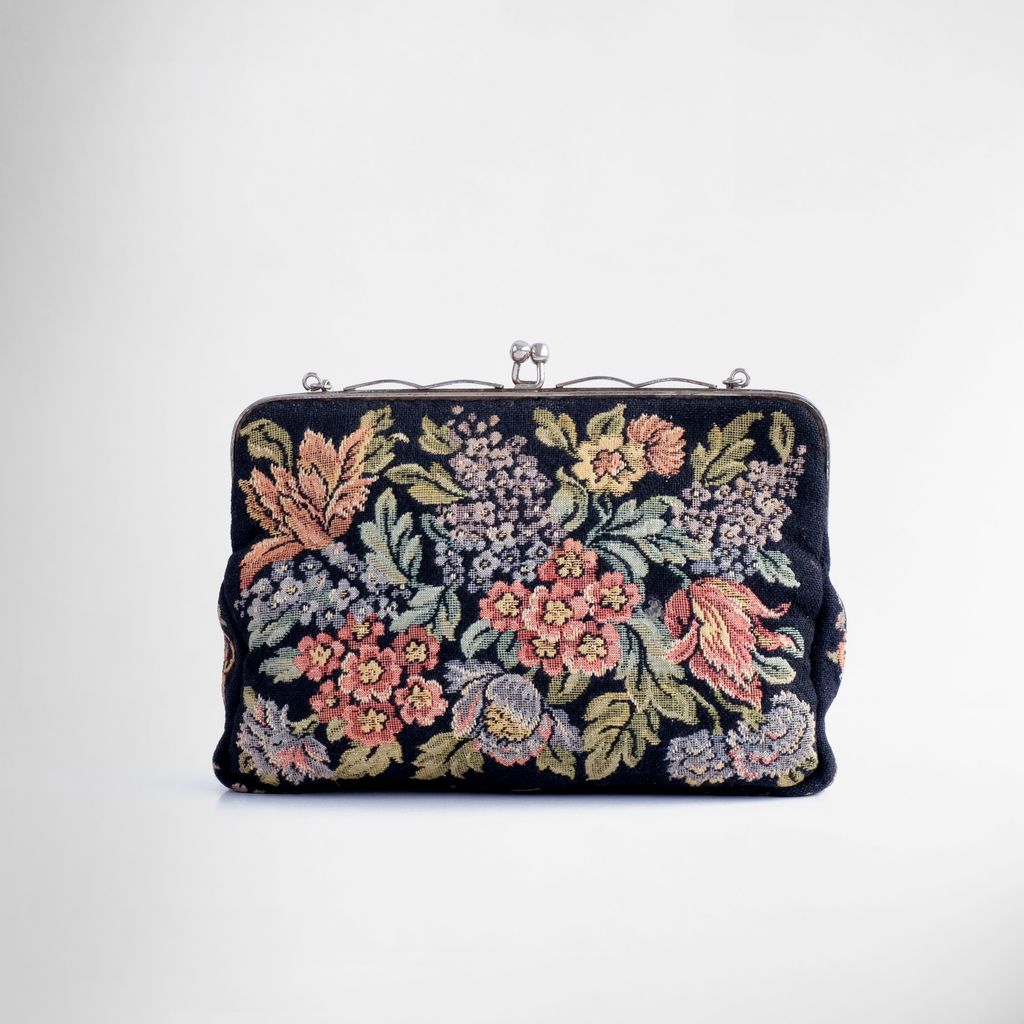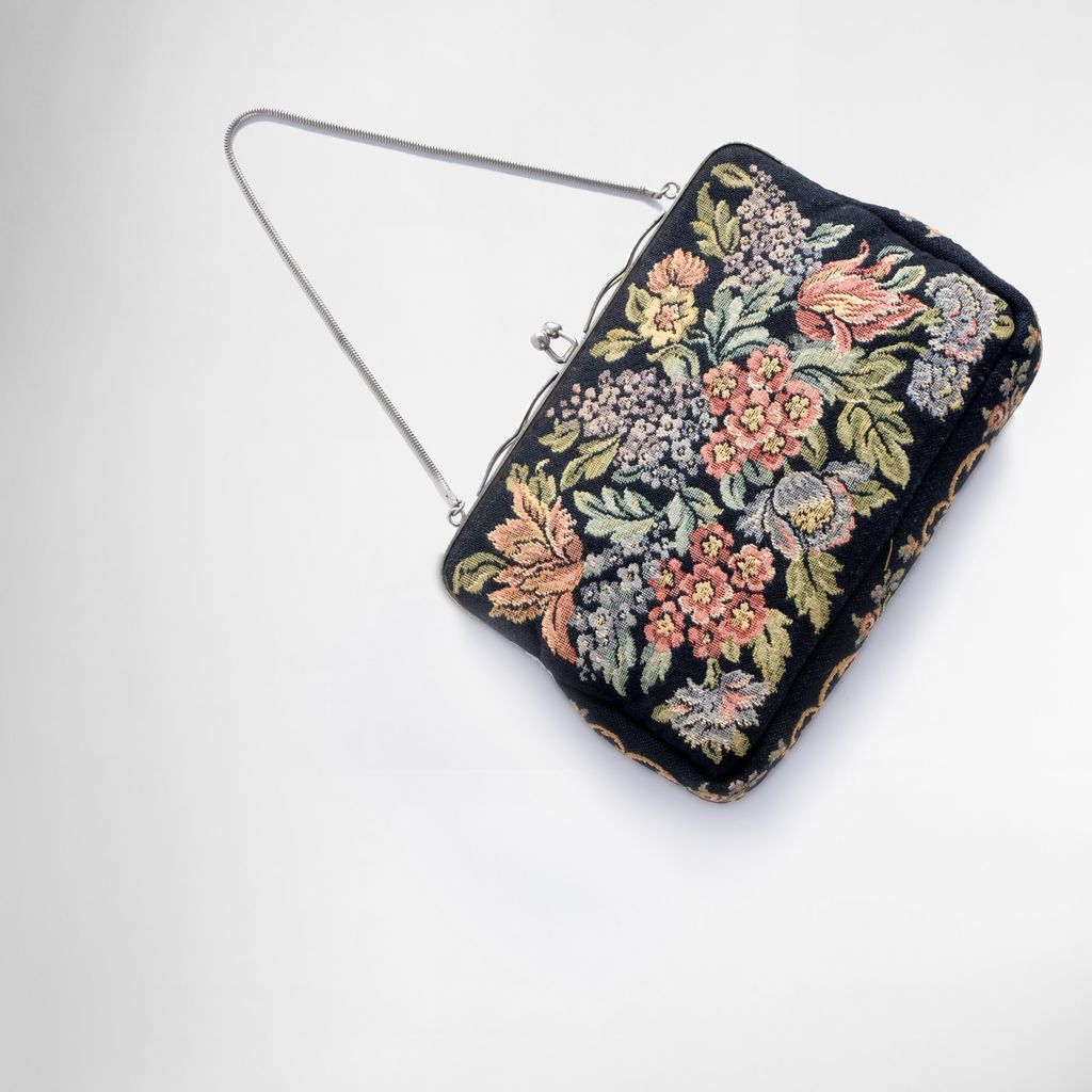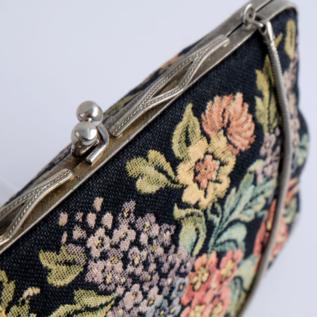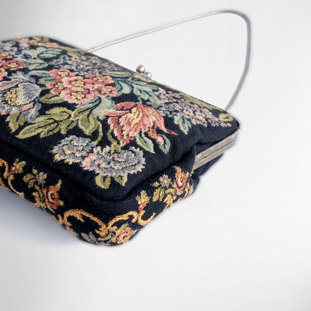 Embroidered tapestry bag with multi-color florals design. Comes with inner small pocket. This vintage bag includes a sliver metal strap with kiss closure. The gusset with flowers on a black ground. Can used as a shoulder bag. Perfect for any occasions or as a gift. Roomy enough for your phone and other modern essentials.