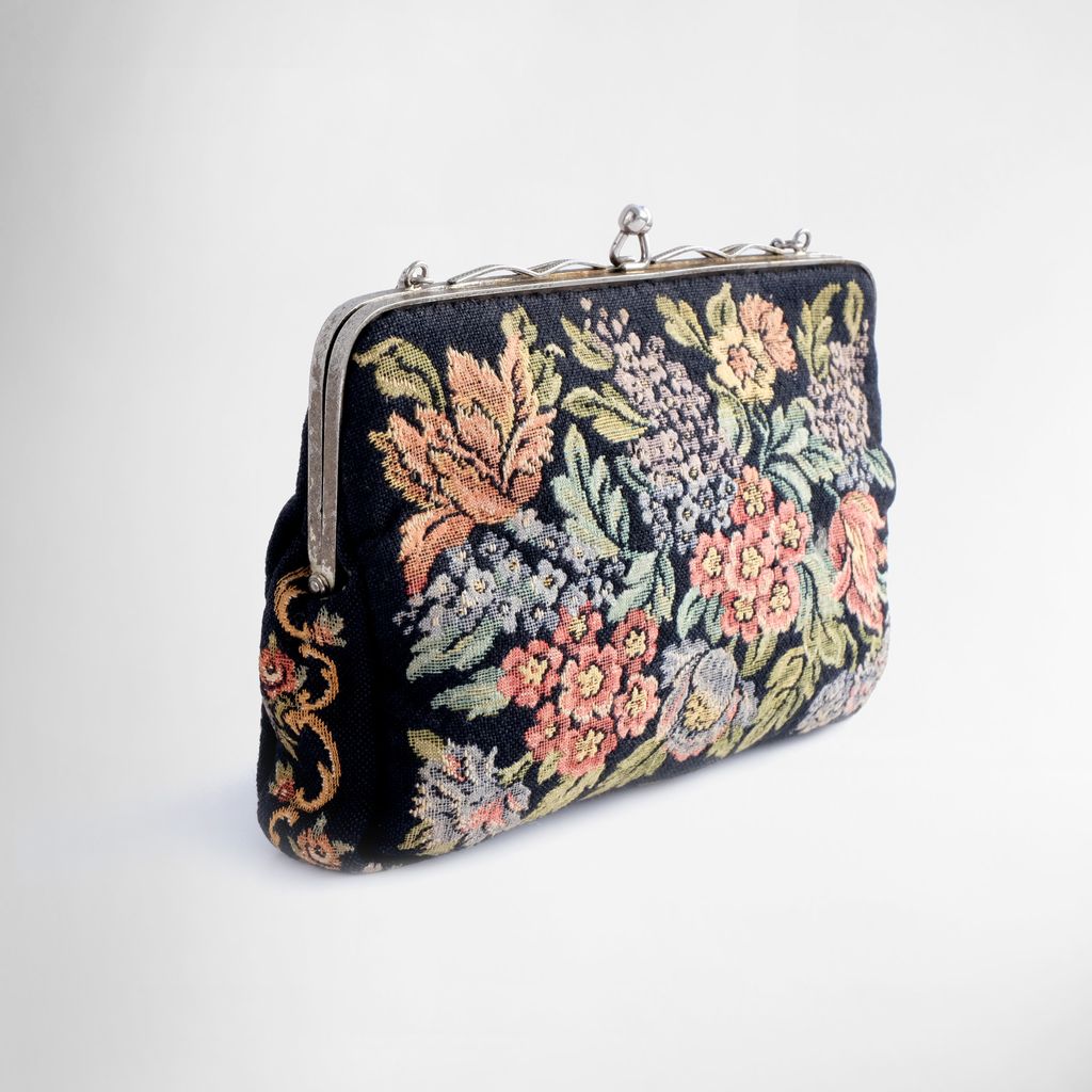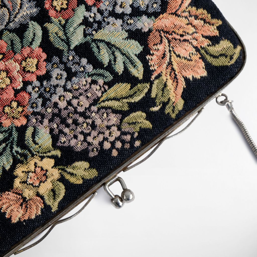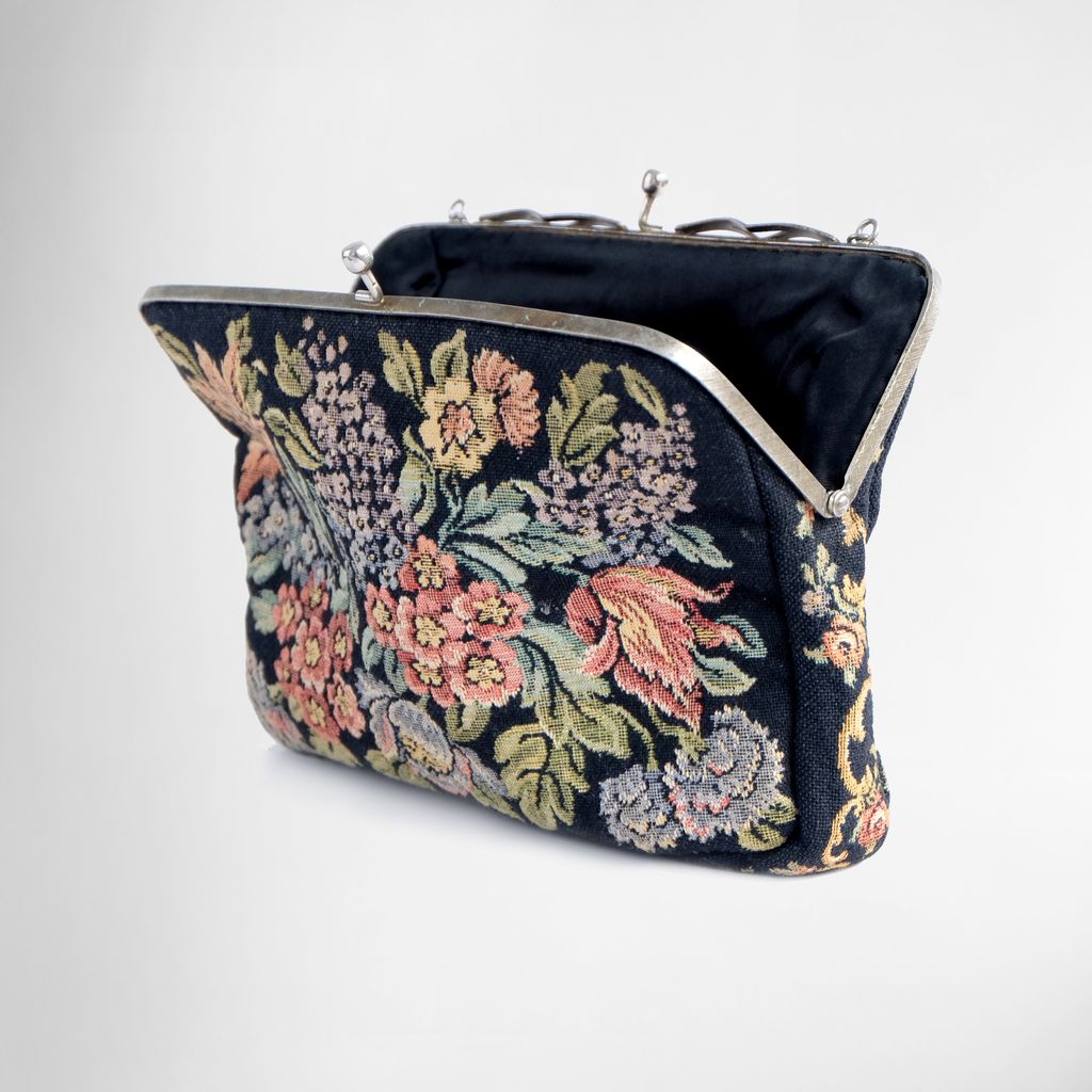 Circa 1950s. Stunning vintage black floral tapestry evening bag.
