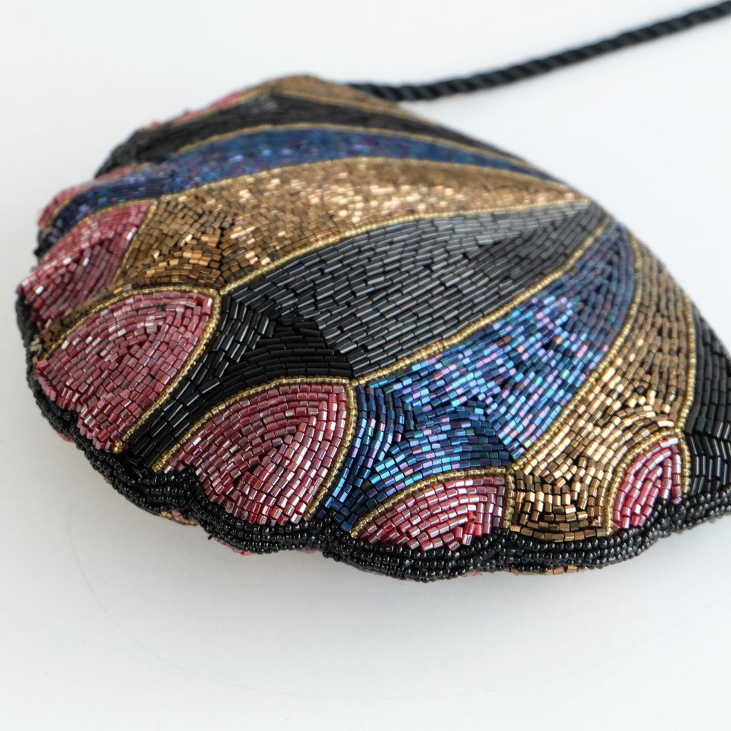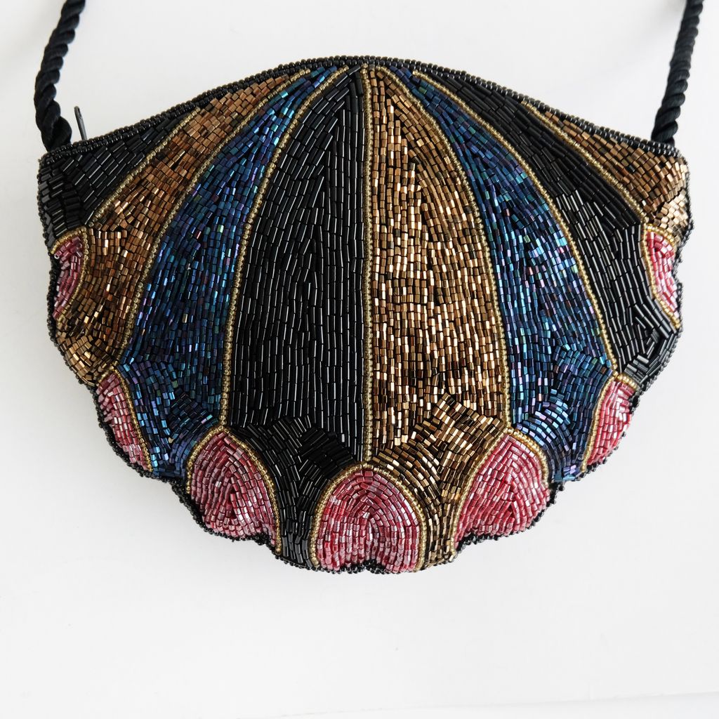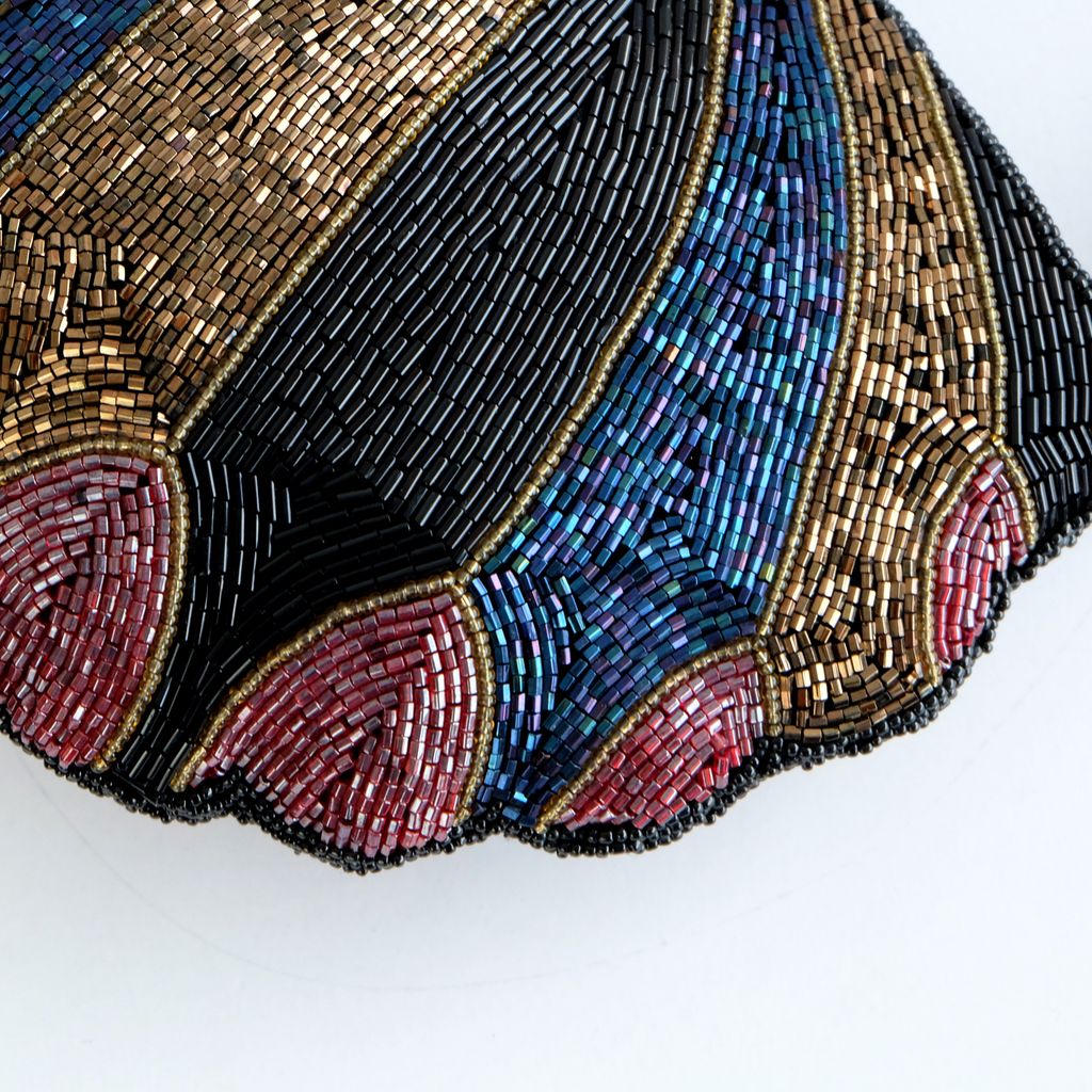 Heavily beaded in front and back in the same Art Deco design. The beads are in iridescent colors of black, bronze, blue and red. The bottom edges are scalloped. Lined in black satin with a rope string. Zip closure. Comes with inner pocket. Roomy enough for phone length which less than 6" and other modern essentials. Perfect for any occasions. Rare piece.