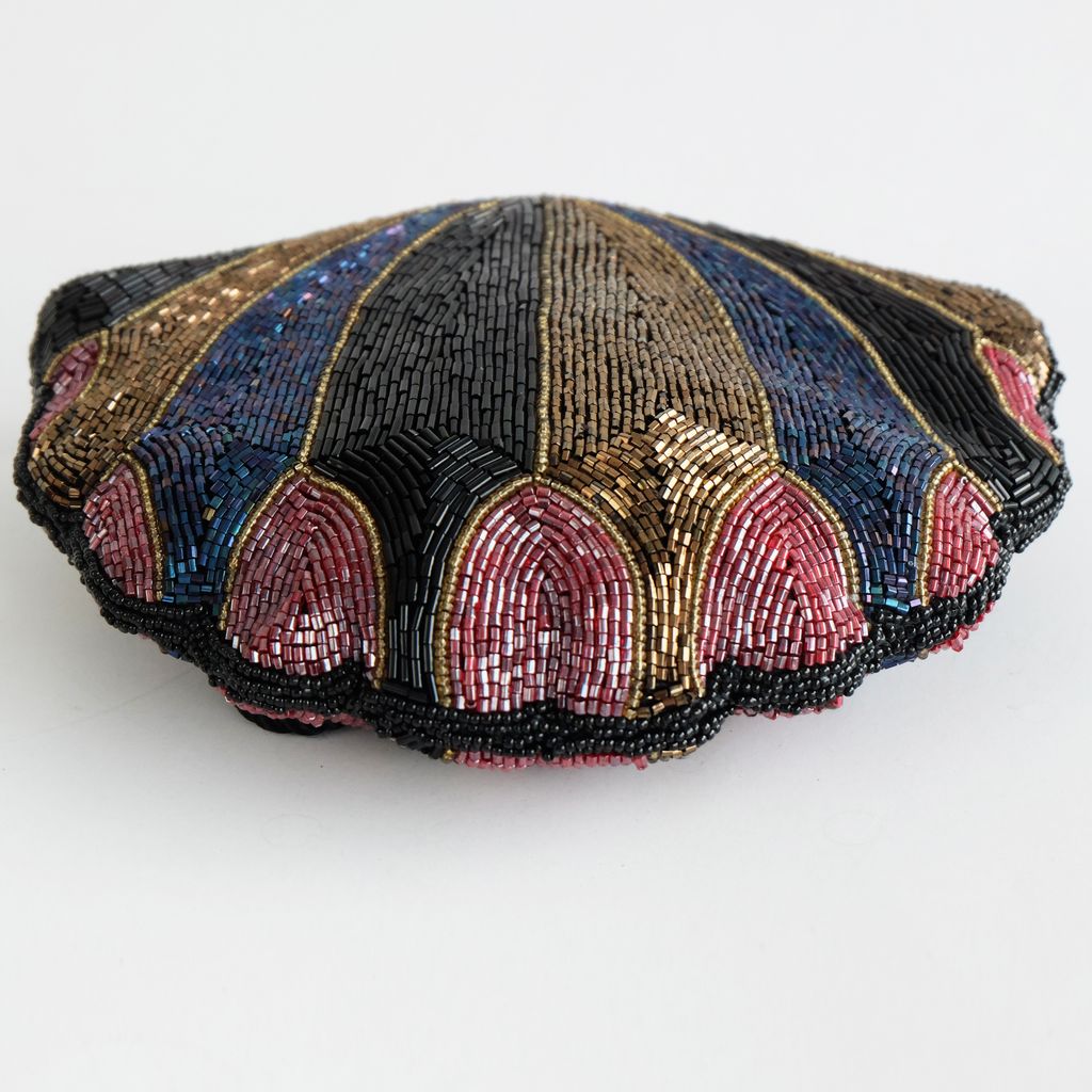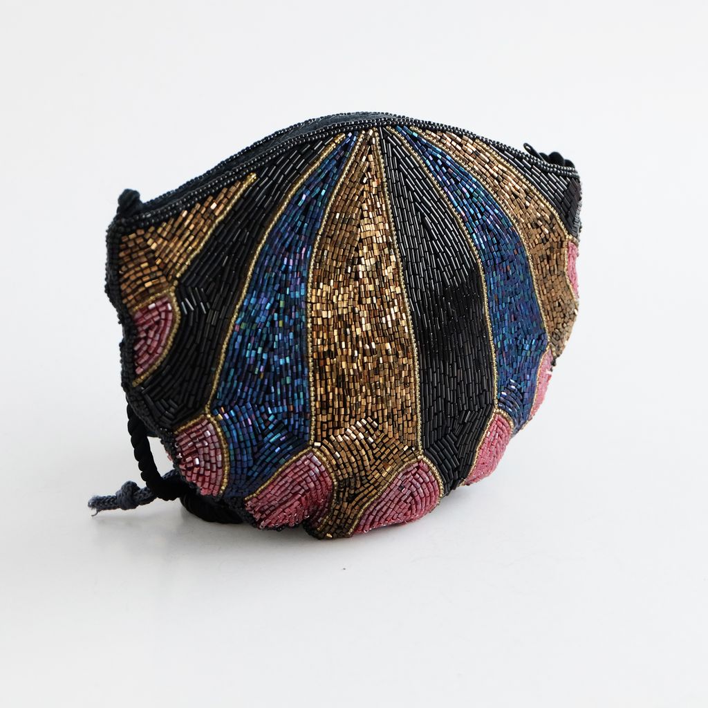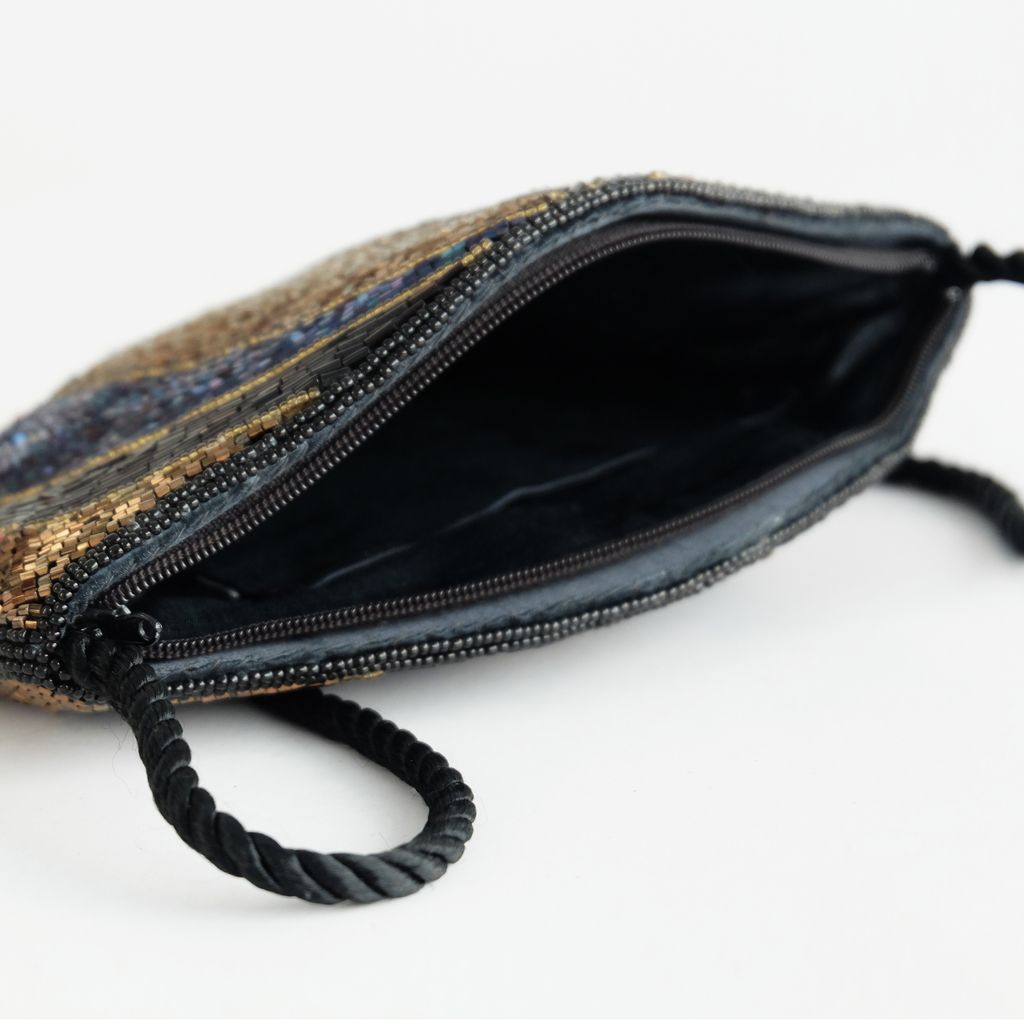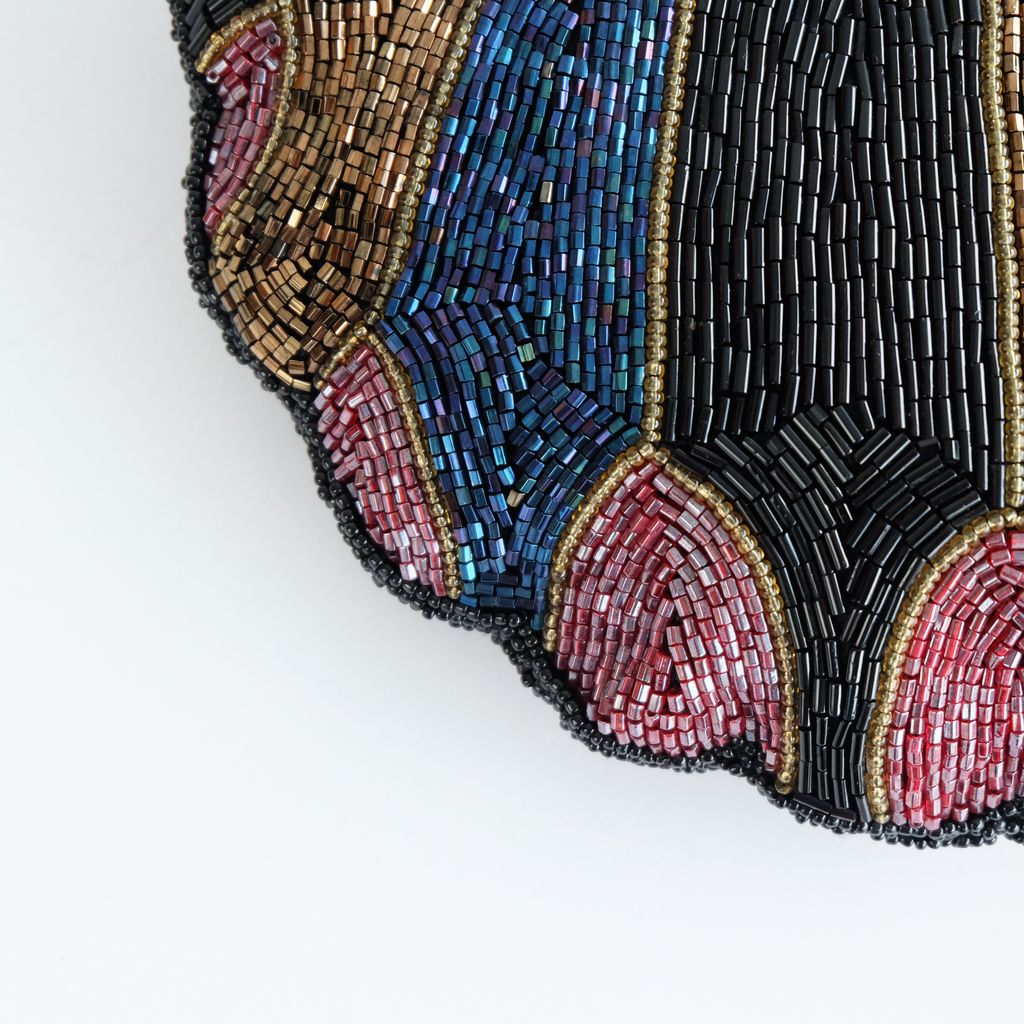 Heavily beaded in front and back in the same Art Deco design. The beads are in iridescent colors of black, bronze, blue and red. The bottom edges are scalloped. Lined in black satin with a rope string. Zip closure. Comes with inner pocket. Roomy enough for phone length which less than 6" and other modern essentials. Perfect for any occasions. Rare piece.