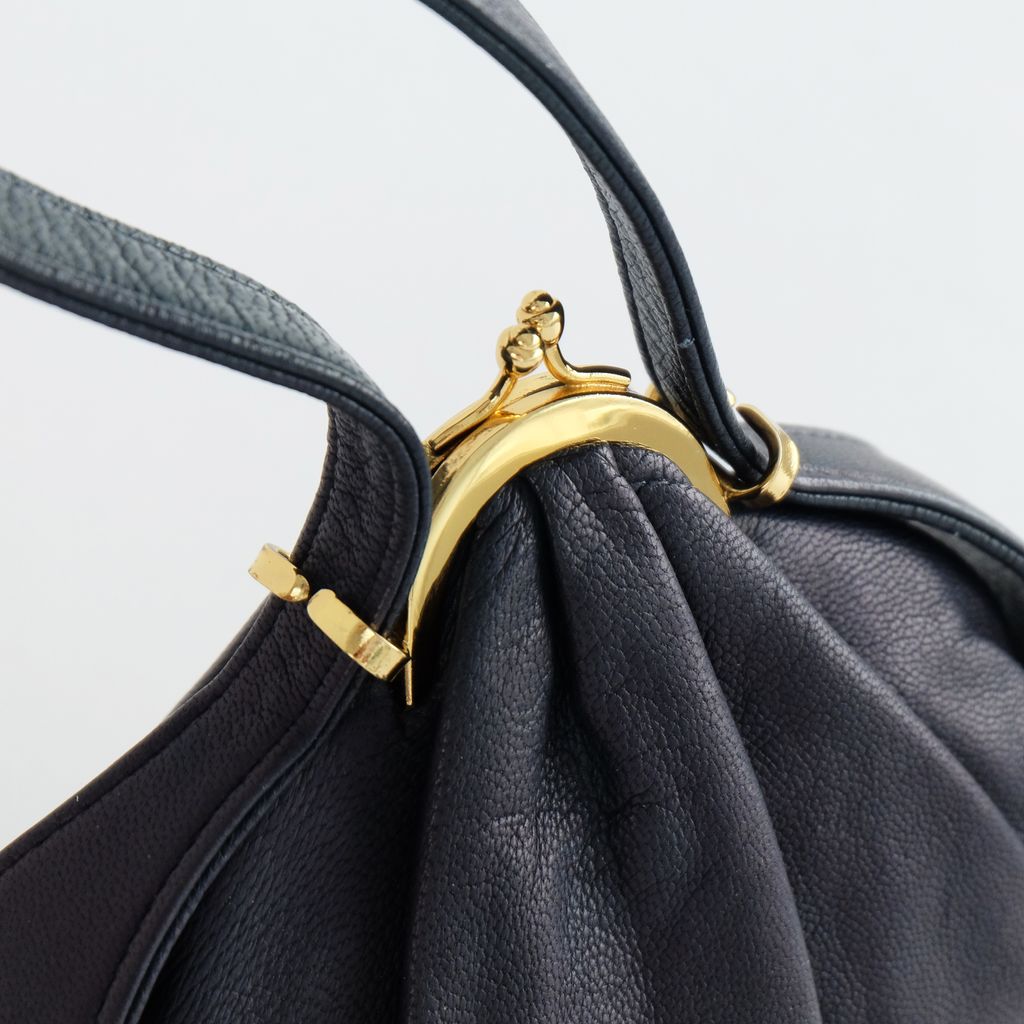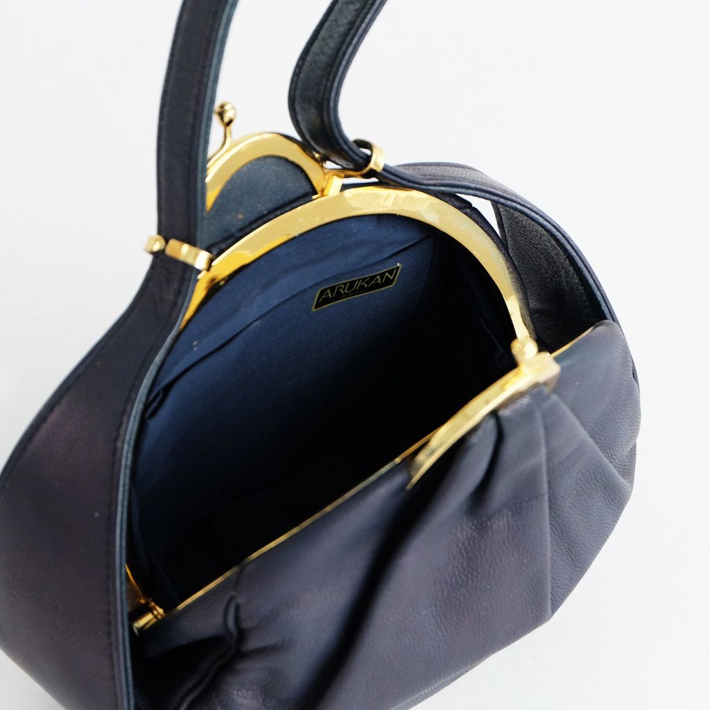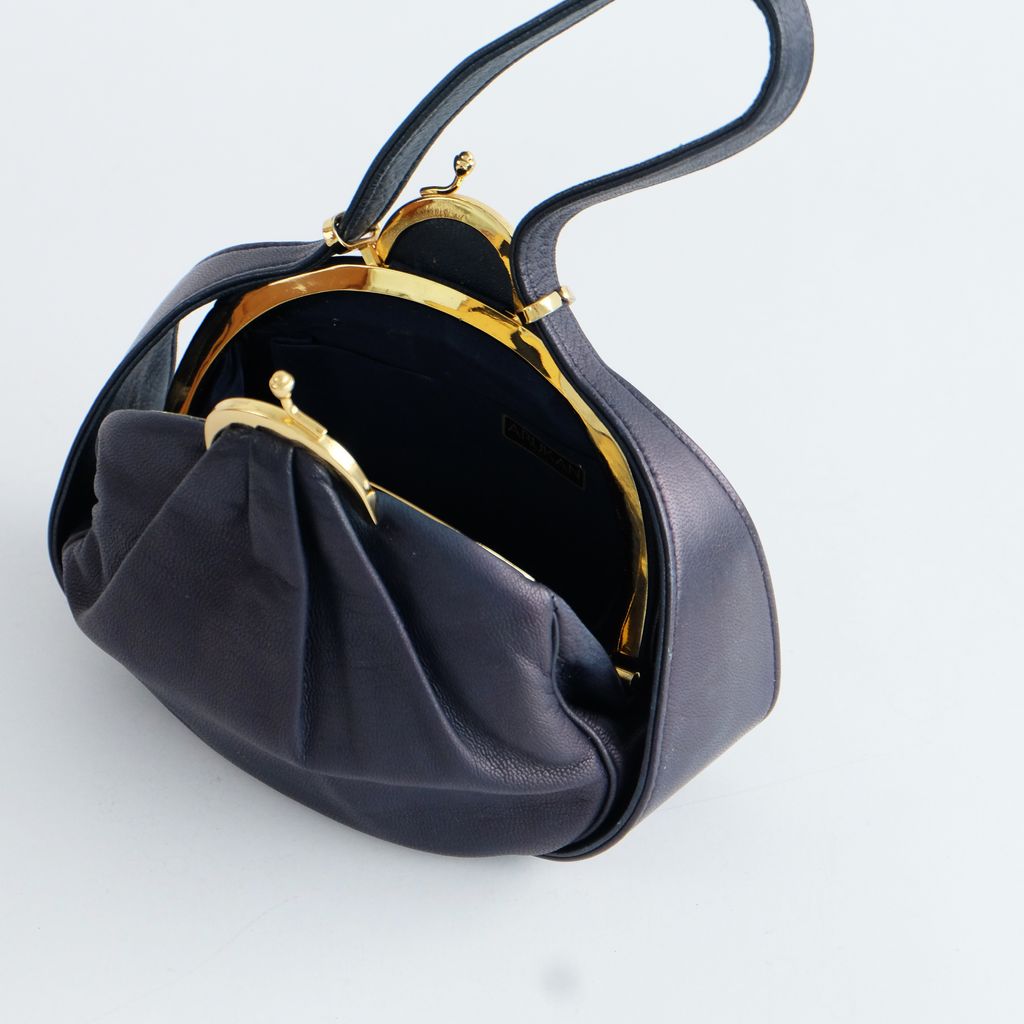 Circa 1980s. Stunning vintage kiss lock navy blue leather handbag.