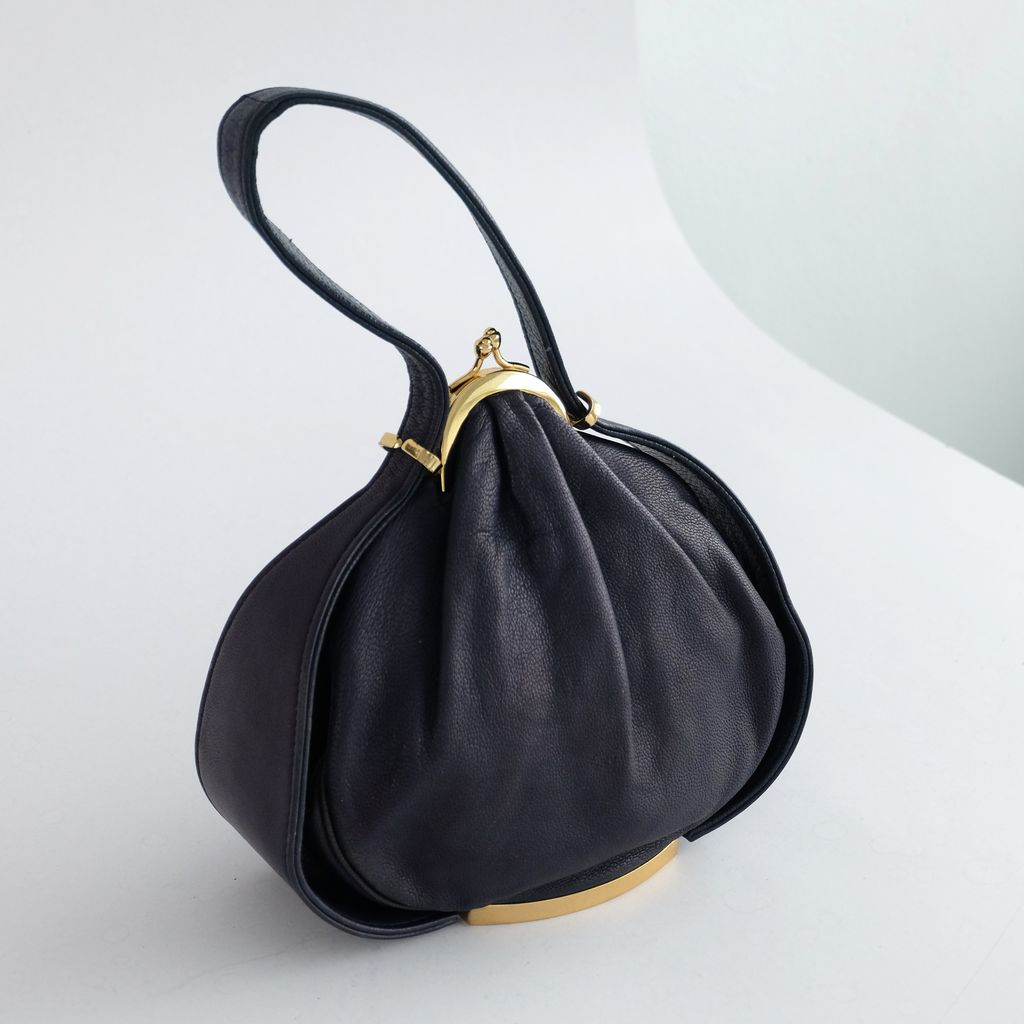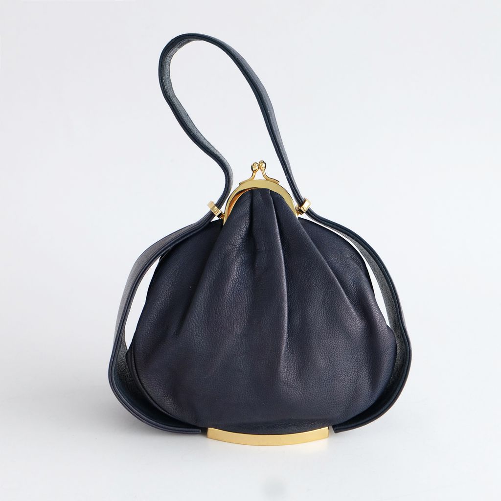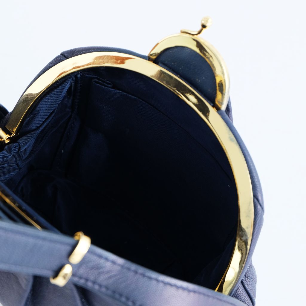 Circa 1980s. Stunning vintage kiss lock navy blue leather handbag.