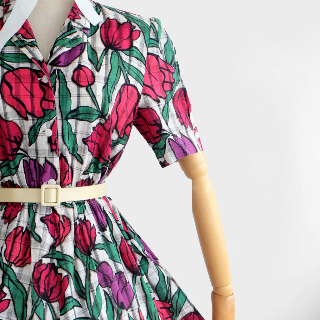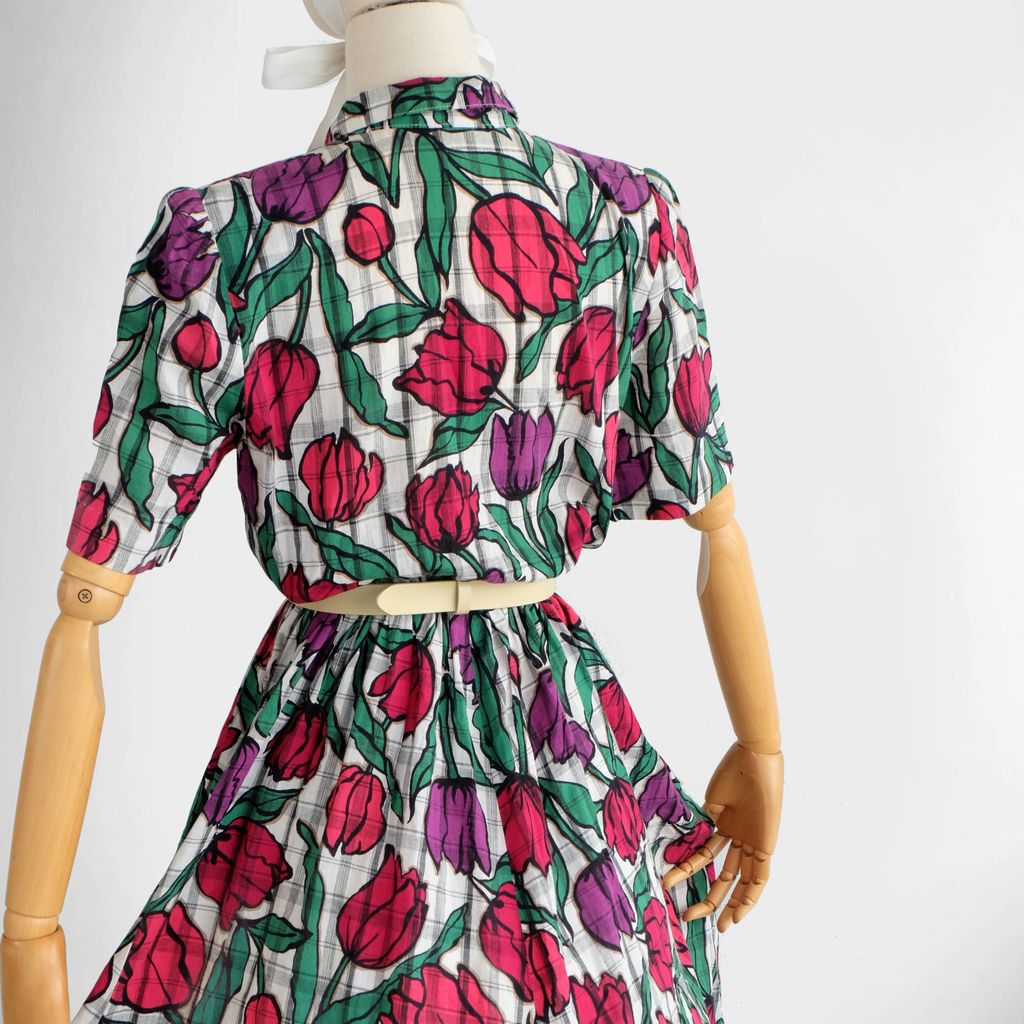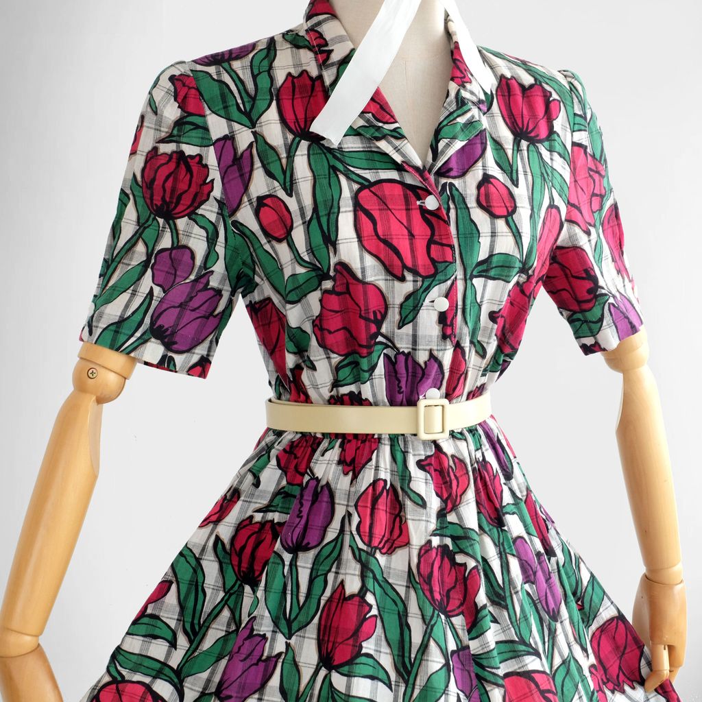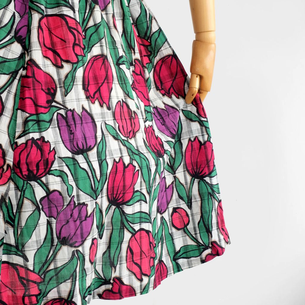 Circa 1980s. White dress with tulips print.