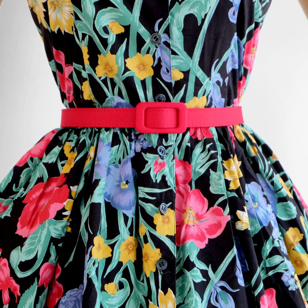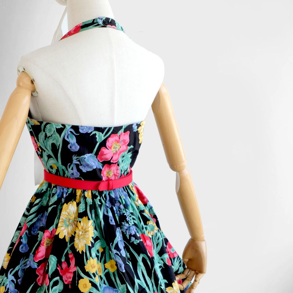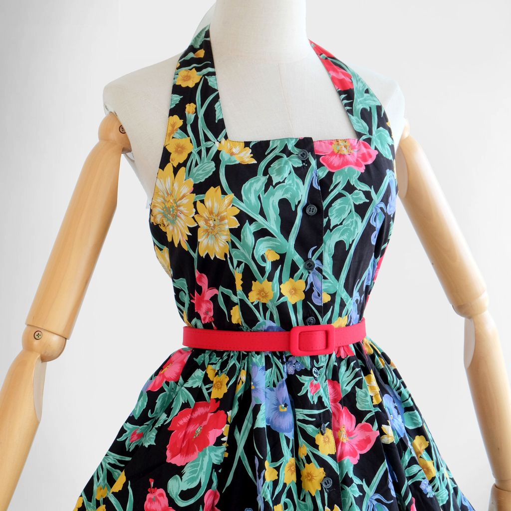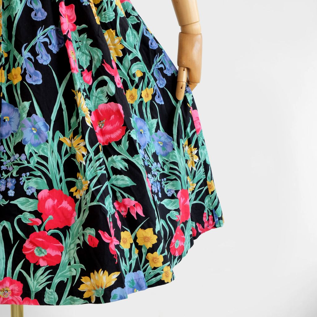Circa 1980s. Lovely black dress with florals print.