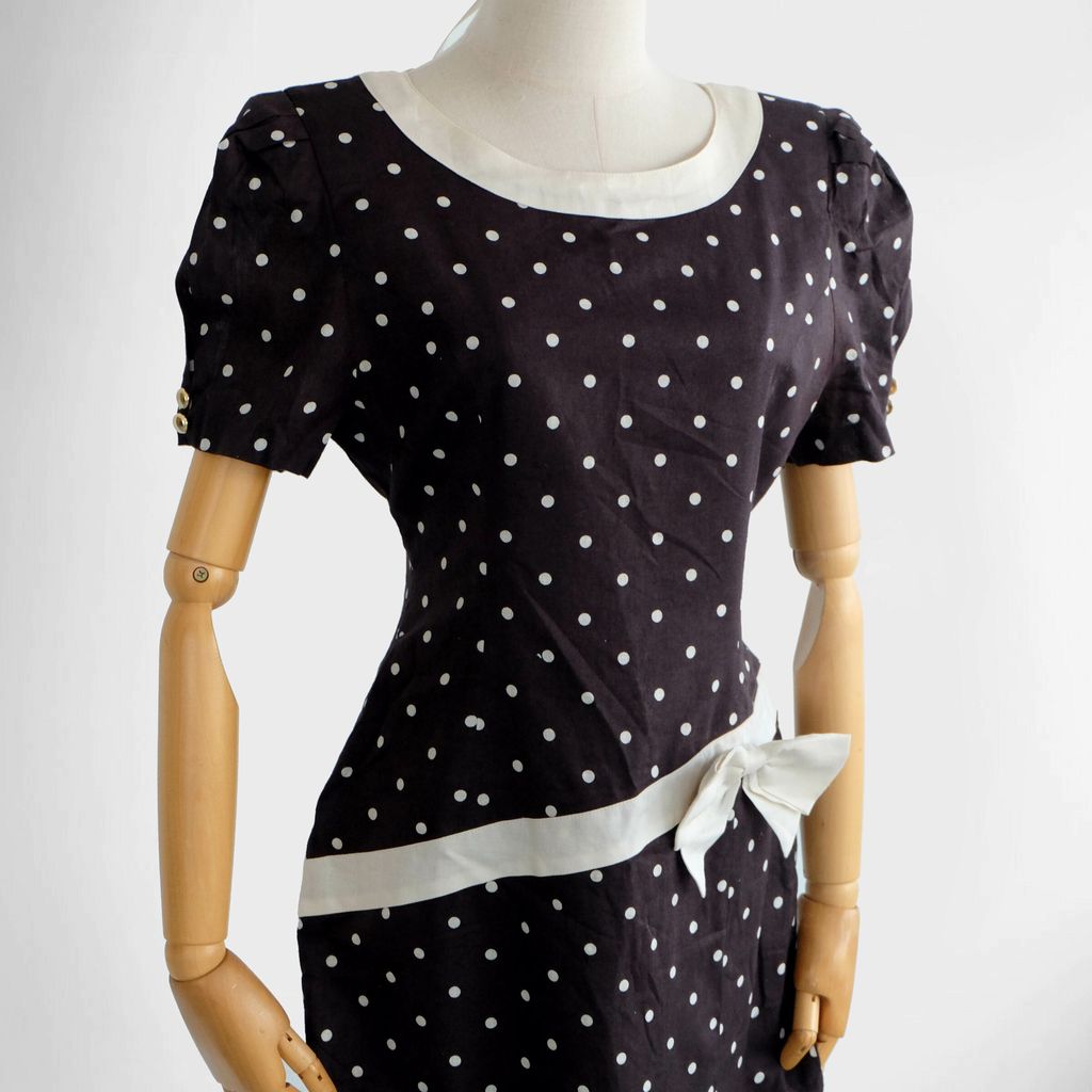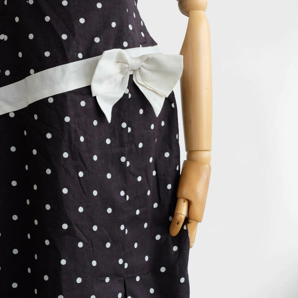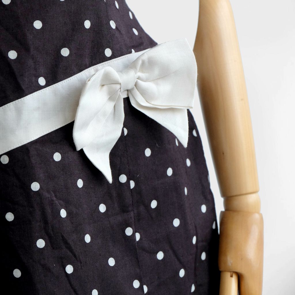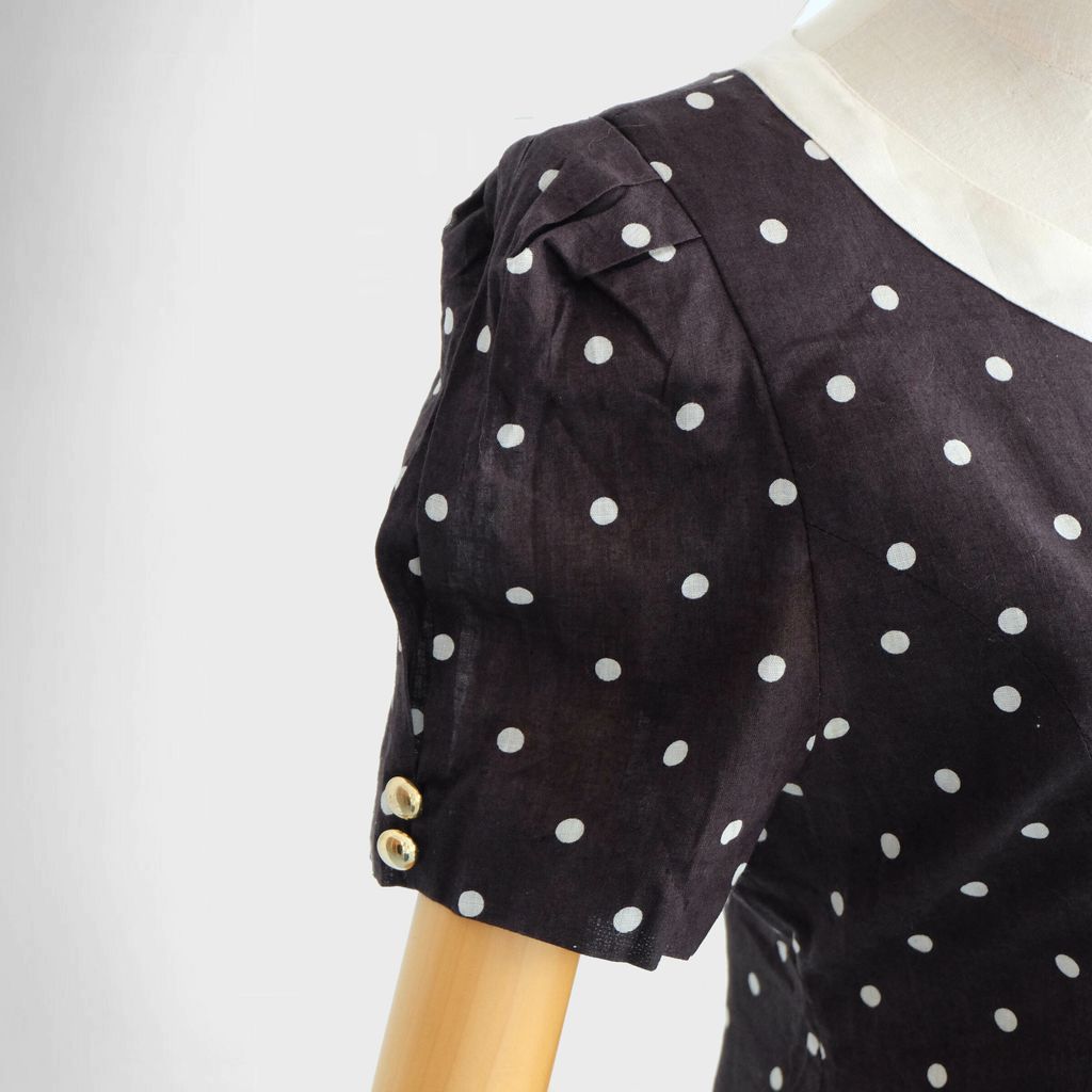 Fitted waist. White trim and attched a bow design. Back zip closure. Cotton fabric. Puffy sleeves with light padded shoulder.