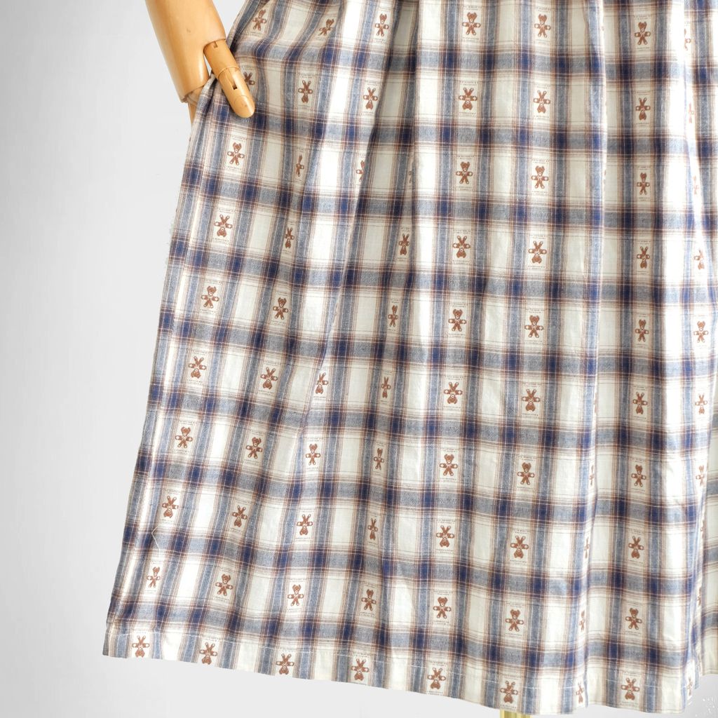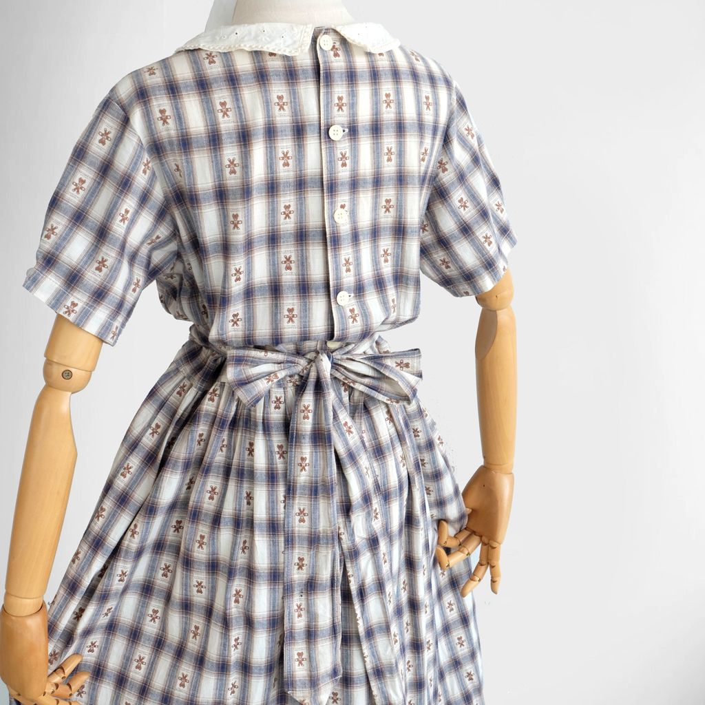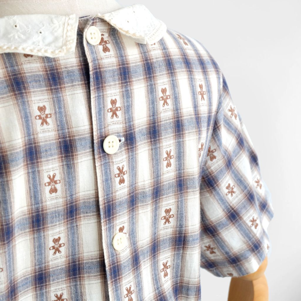 Lace emboidered collar. Fitted waist with matching belt to cinch. With adorable teddy bears stitches design. Back buttons closure. Cotton fabric. With pockets.