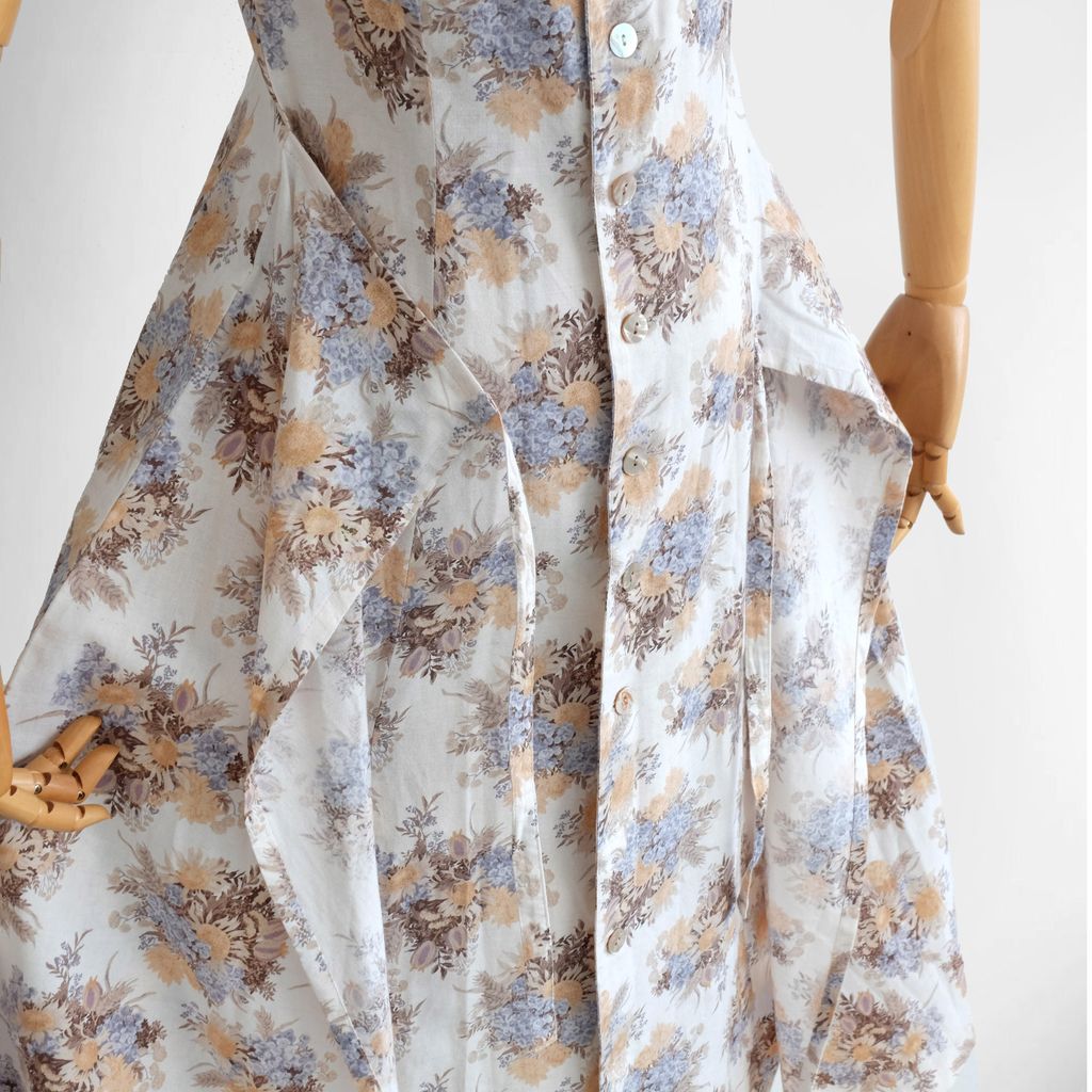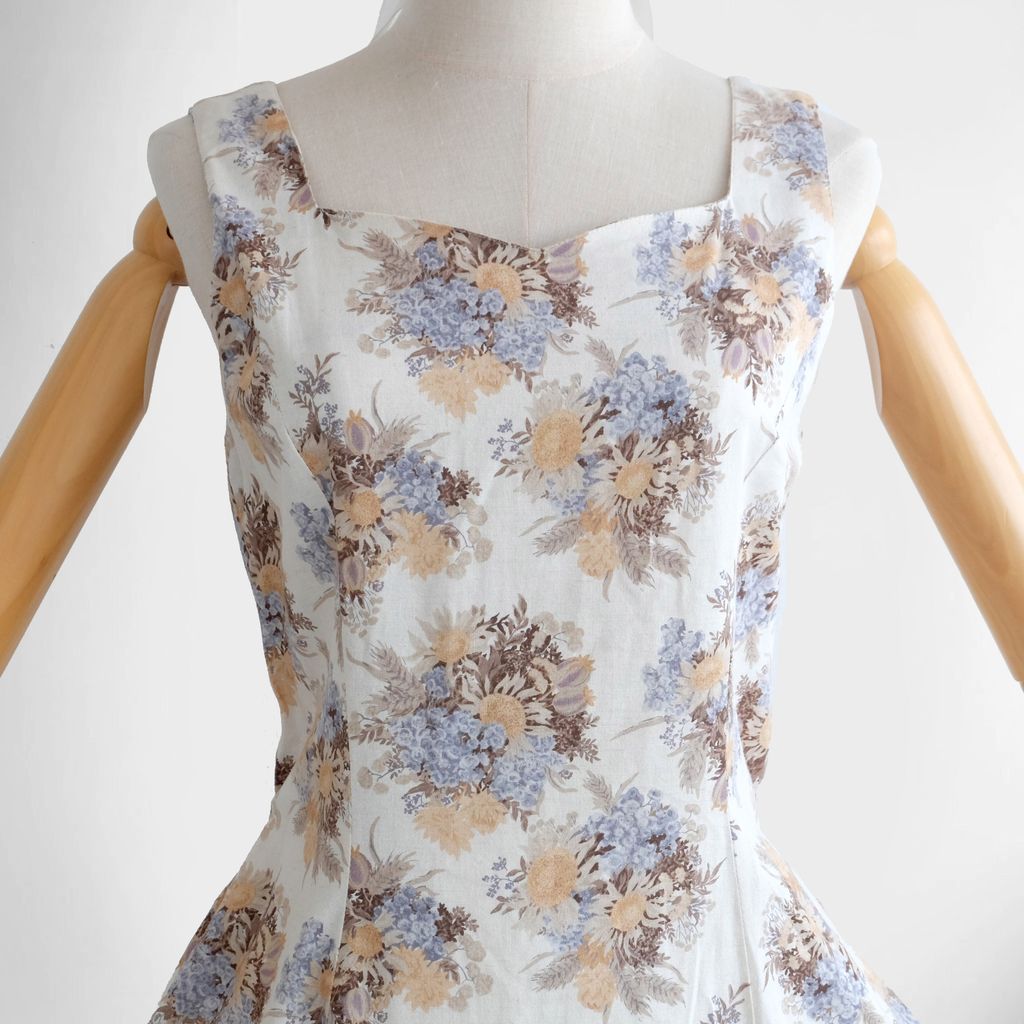 Sweet heart neckline. With extra panels to tie at the back. Fitted waist. Back buttons closure. Thick Cotton fabric.