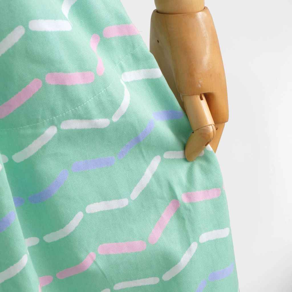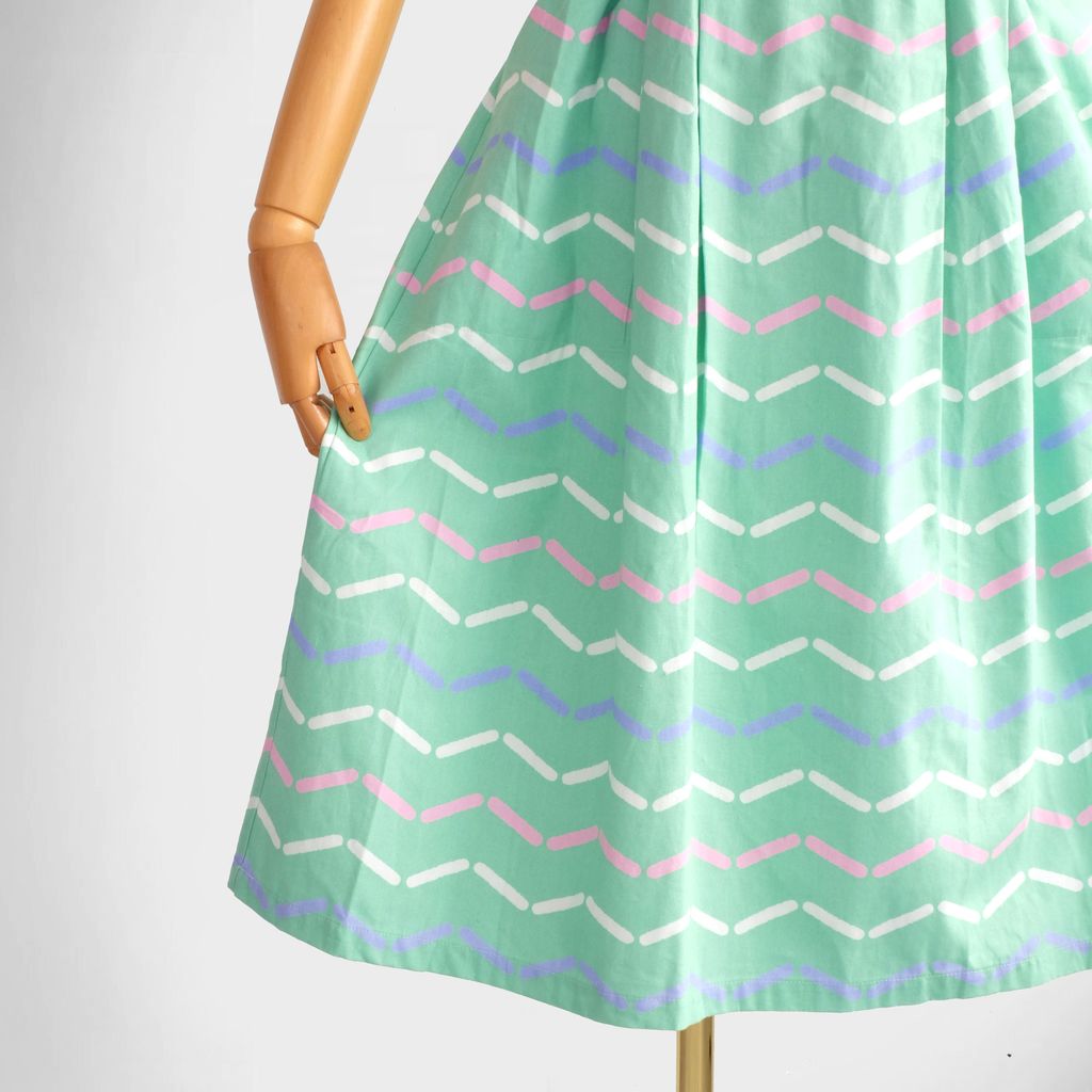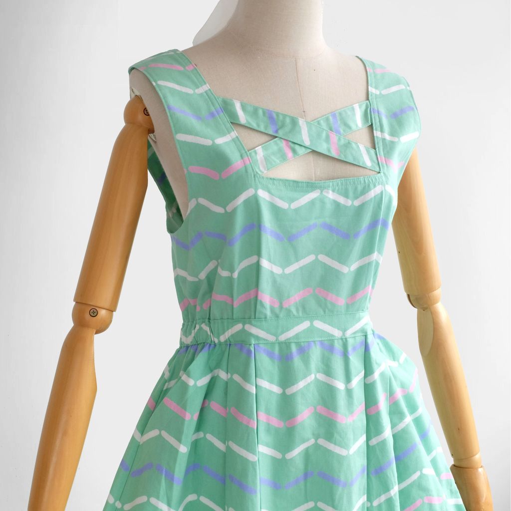 Circa 1980s. Mint green pinafore dress with graphic print.