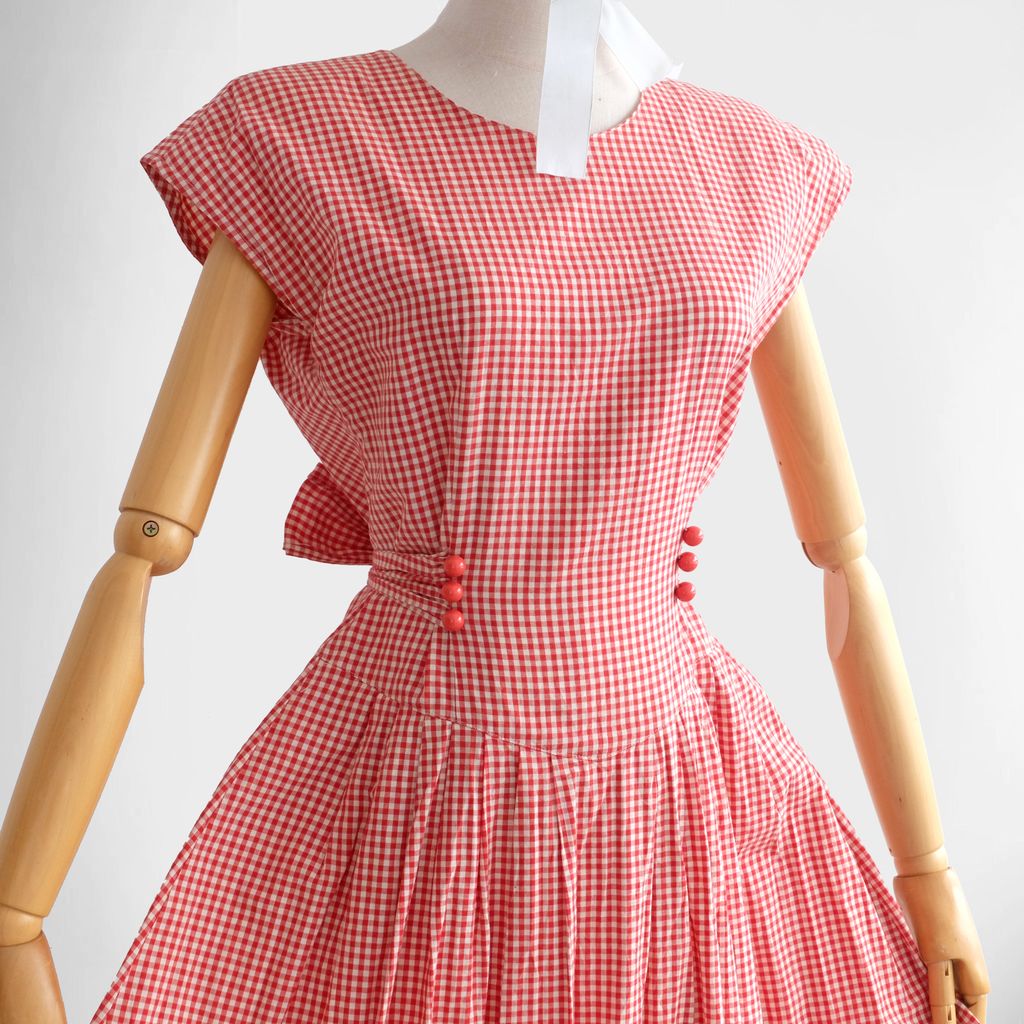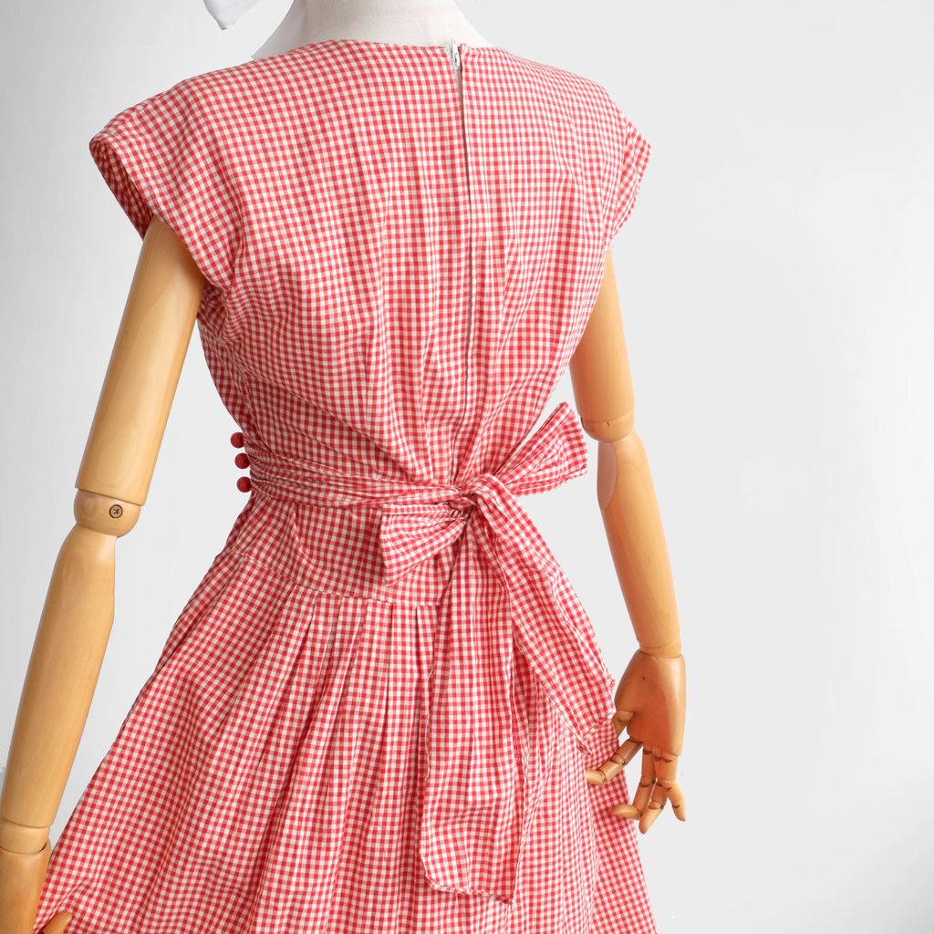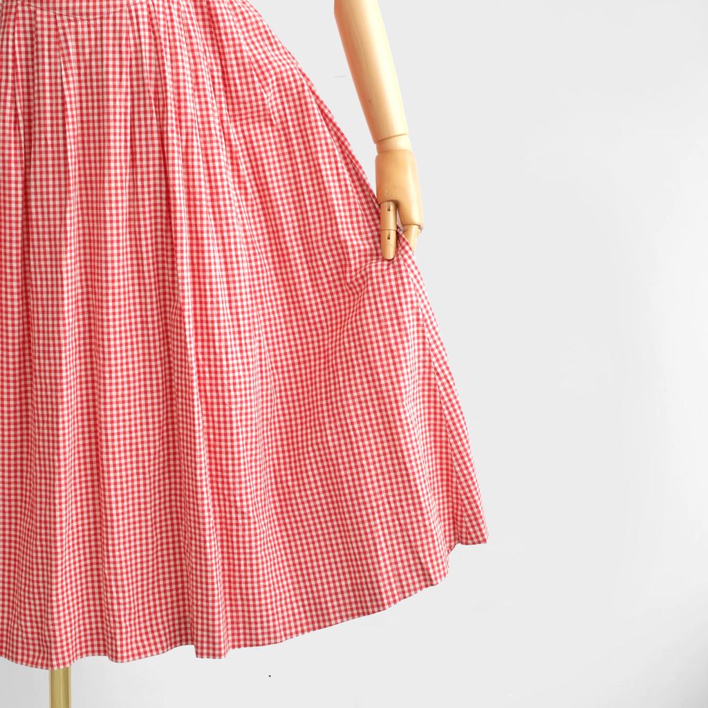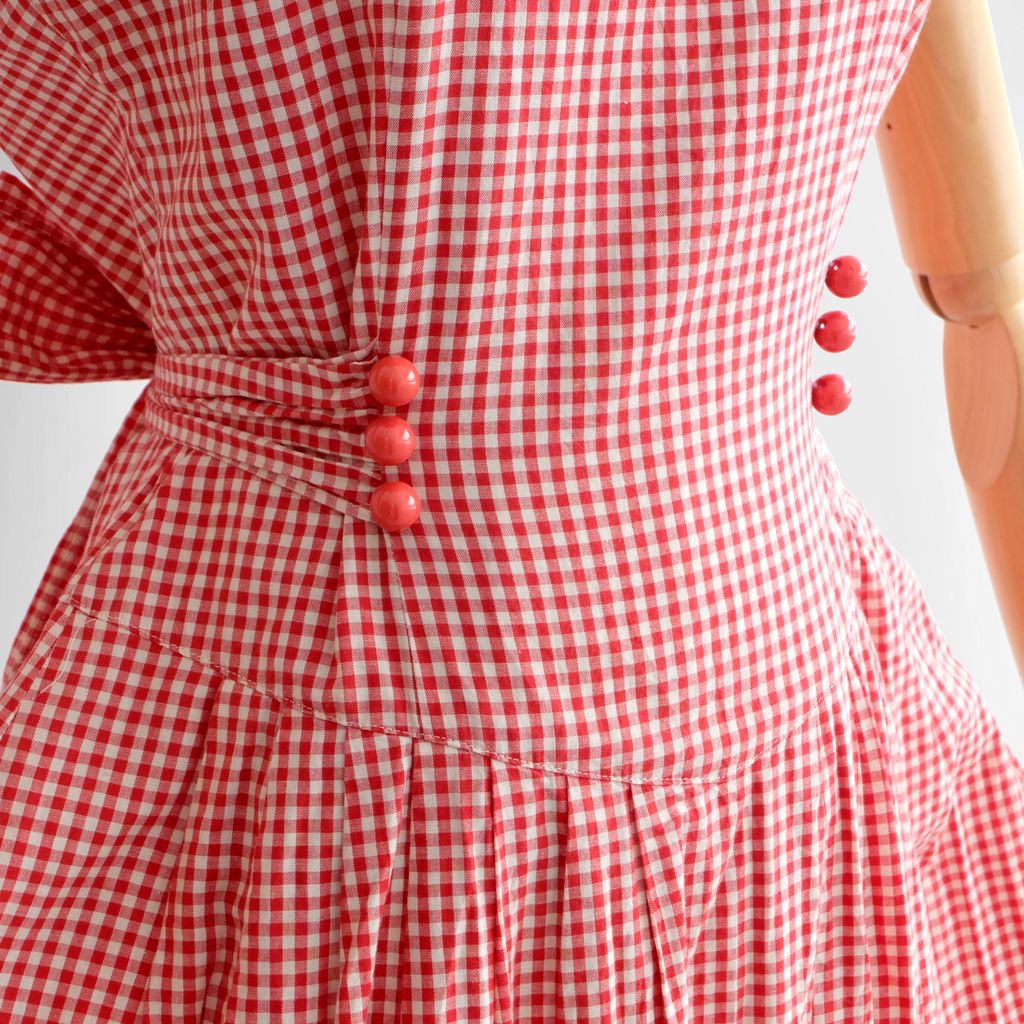 Back zip closure. Fixed waist with band to cinch. Pockets. Cotton fabric.