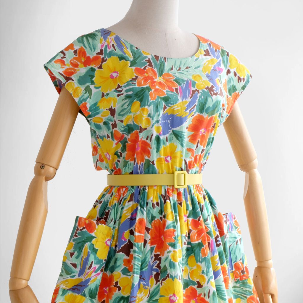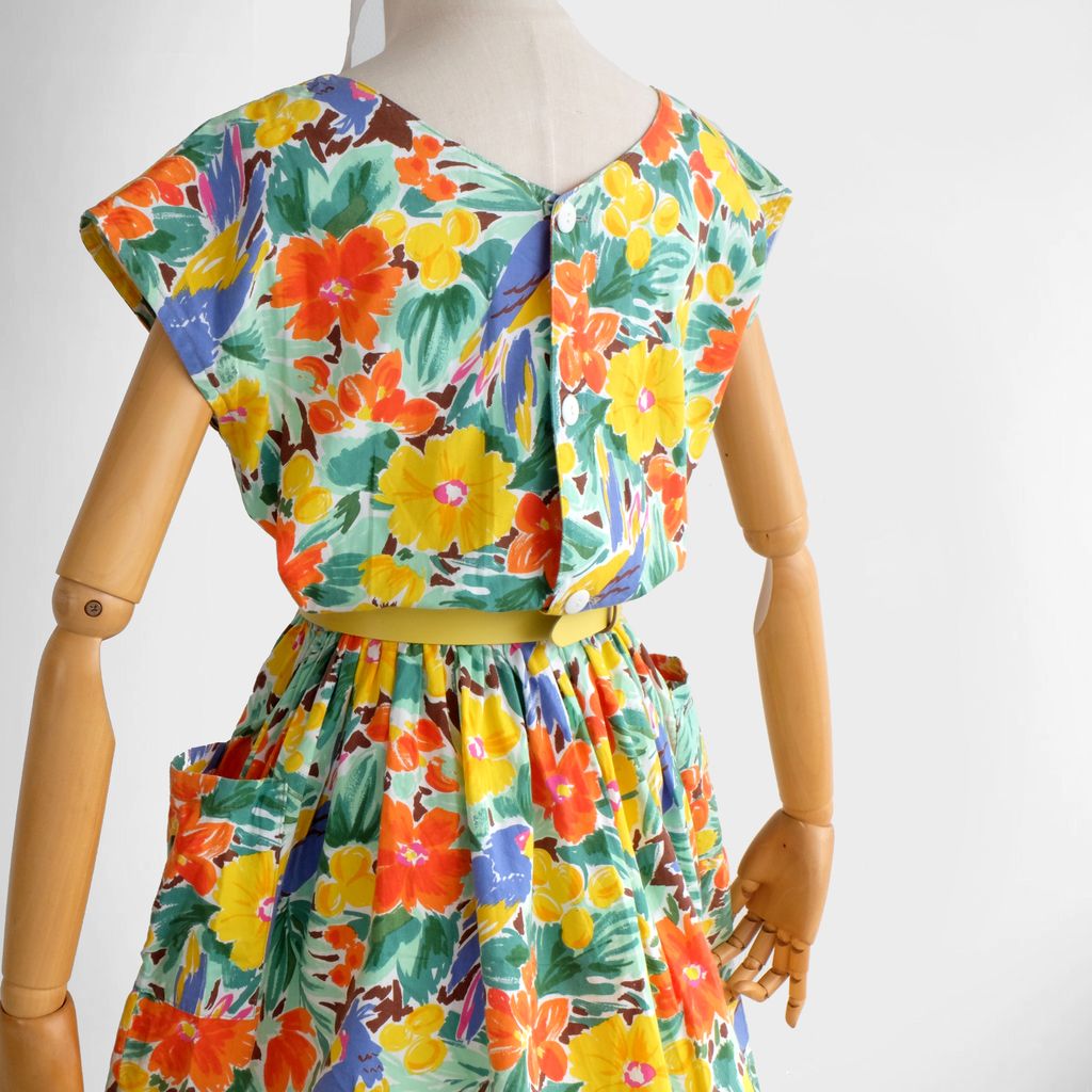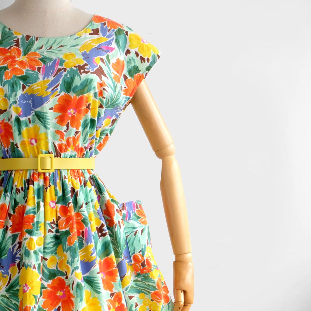 Circa 1980s. Bright colour dress with floral & fauna prints.