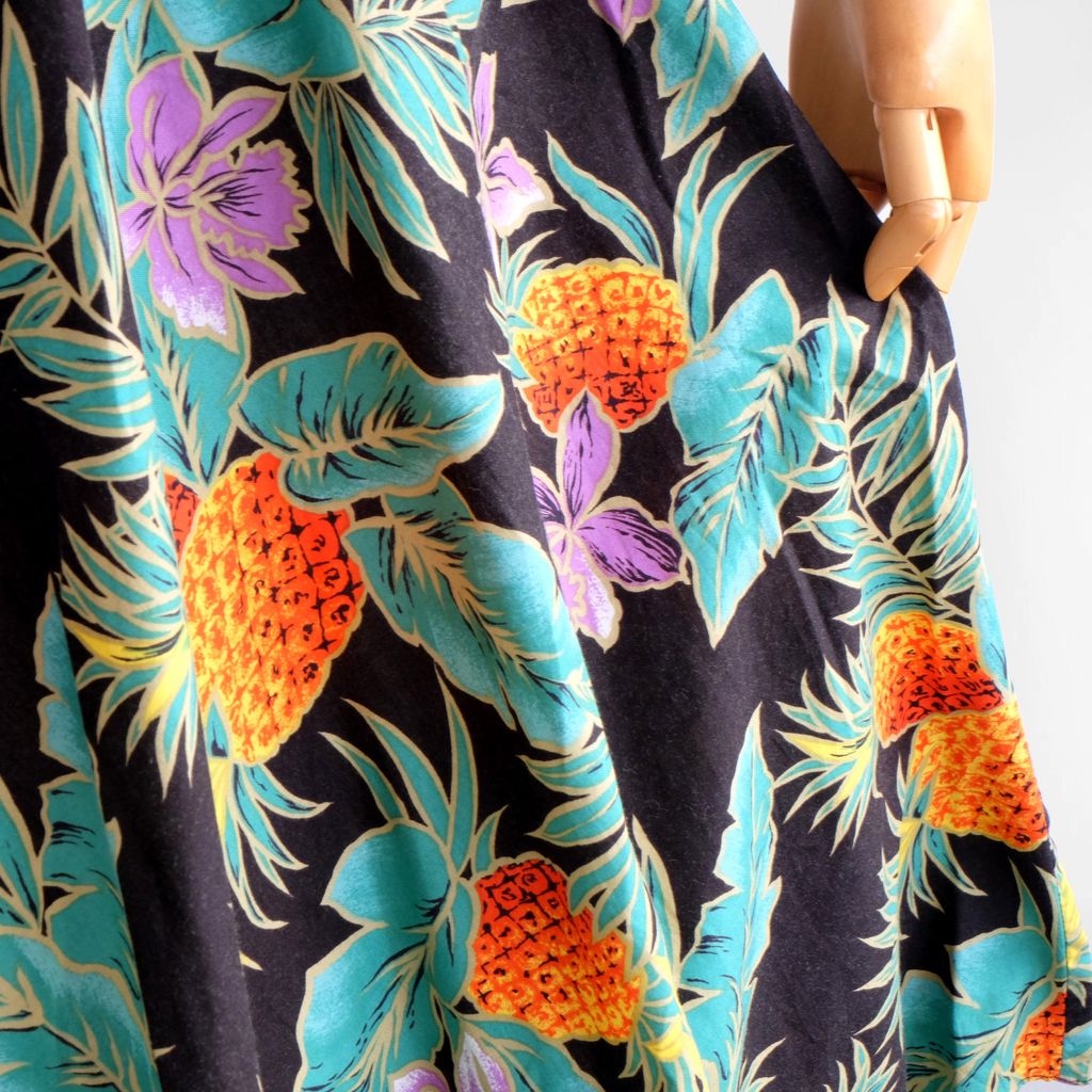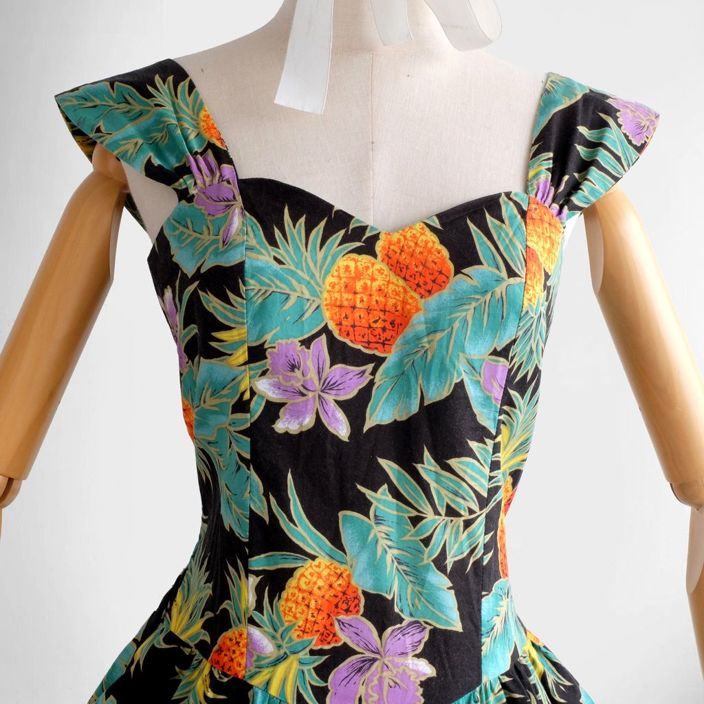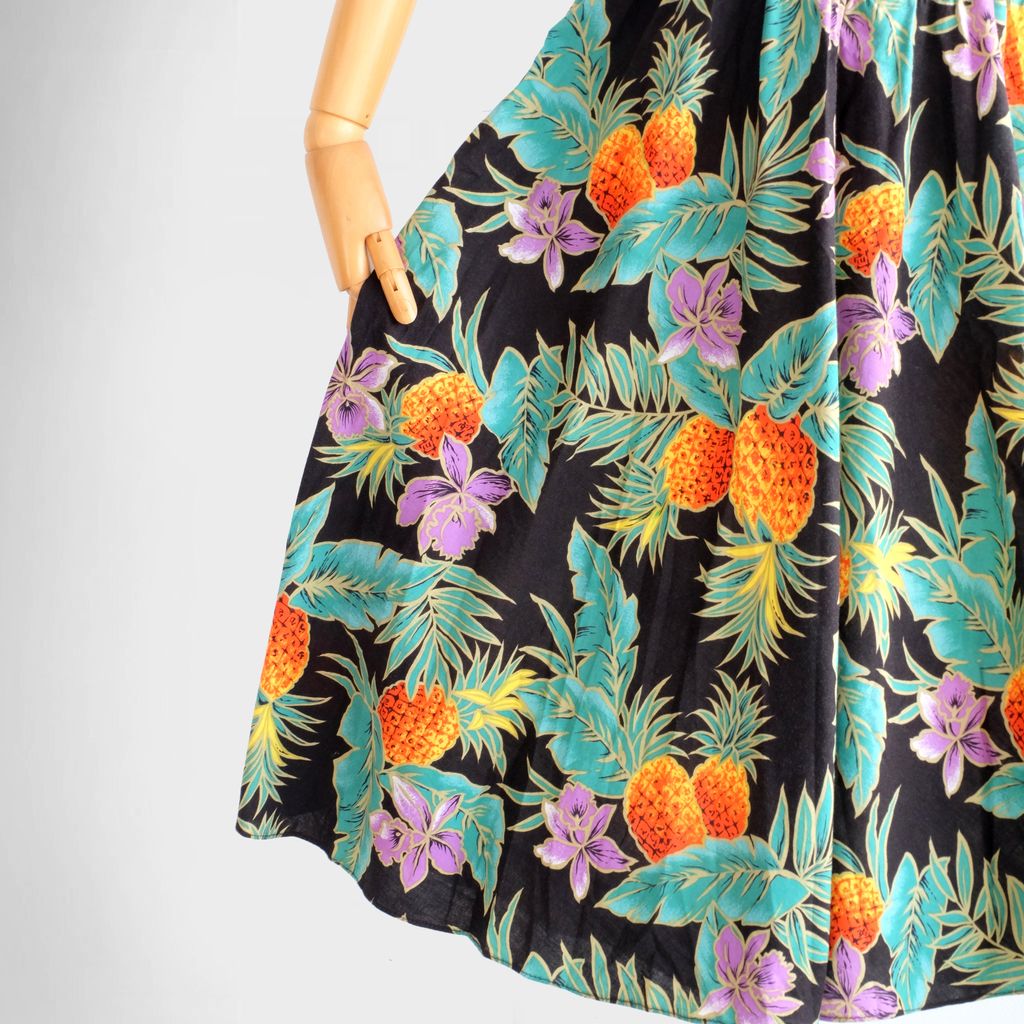 Circa 1980s. Beautiful Authentic hawaiian dress with fruits print.