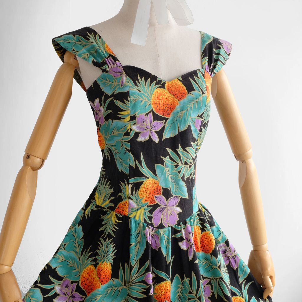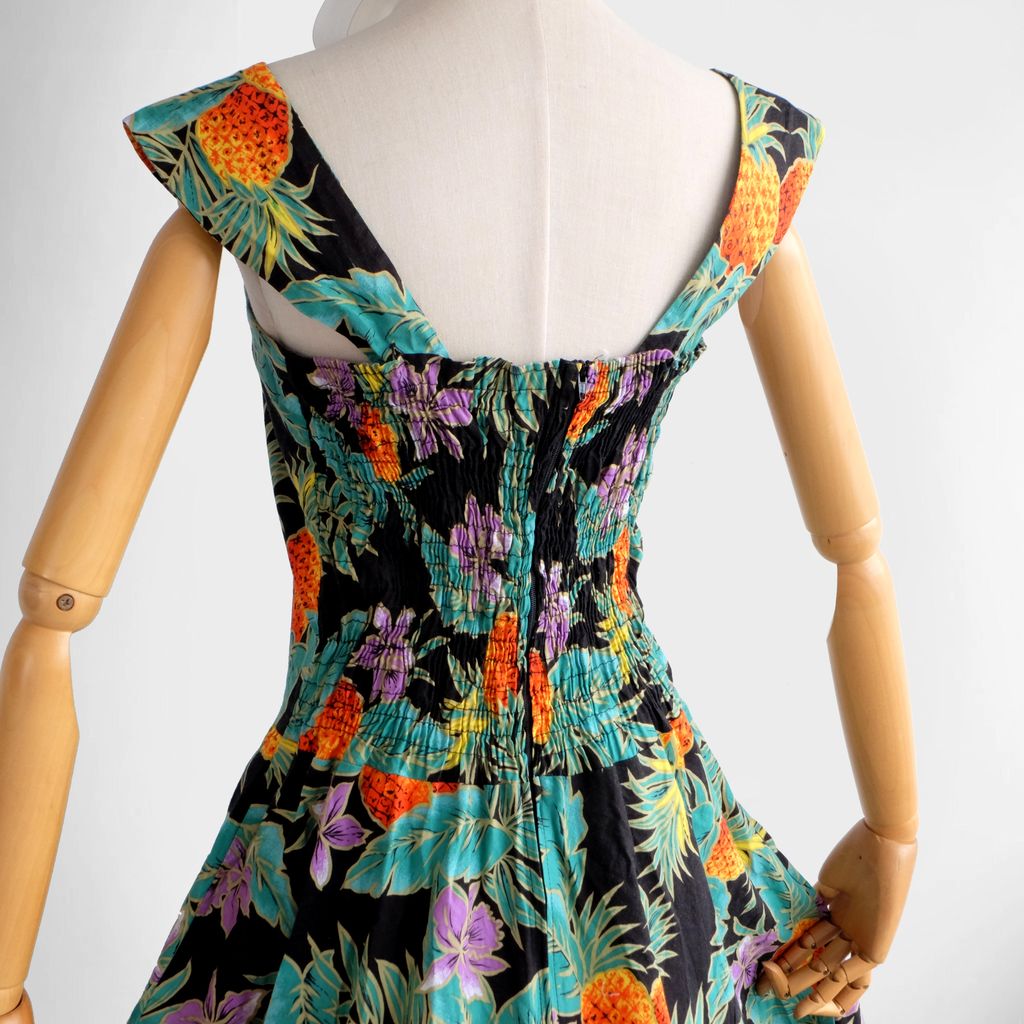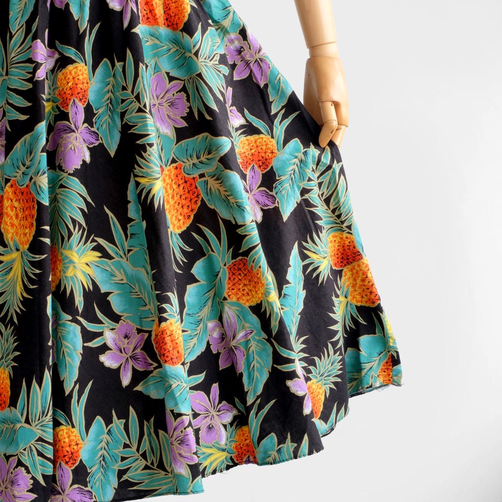 Circa 1980s. Beautiful Authentic hawaiian dress with fruits print.