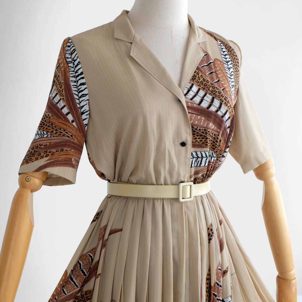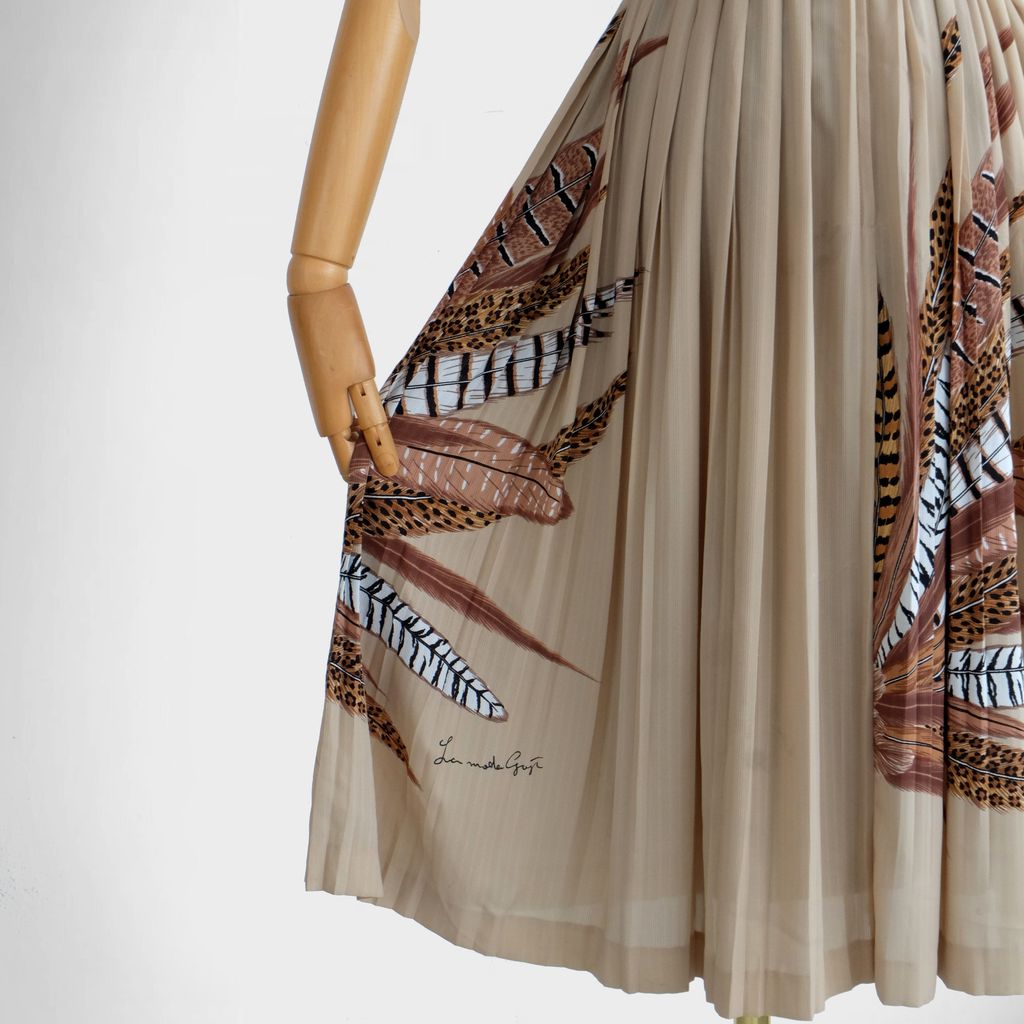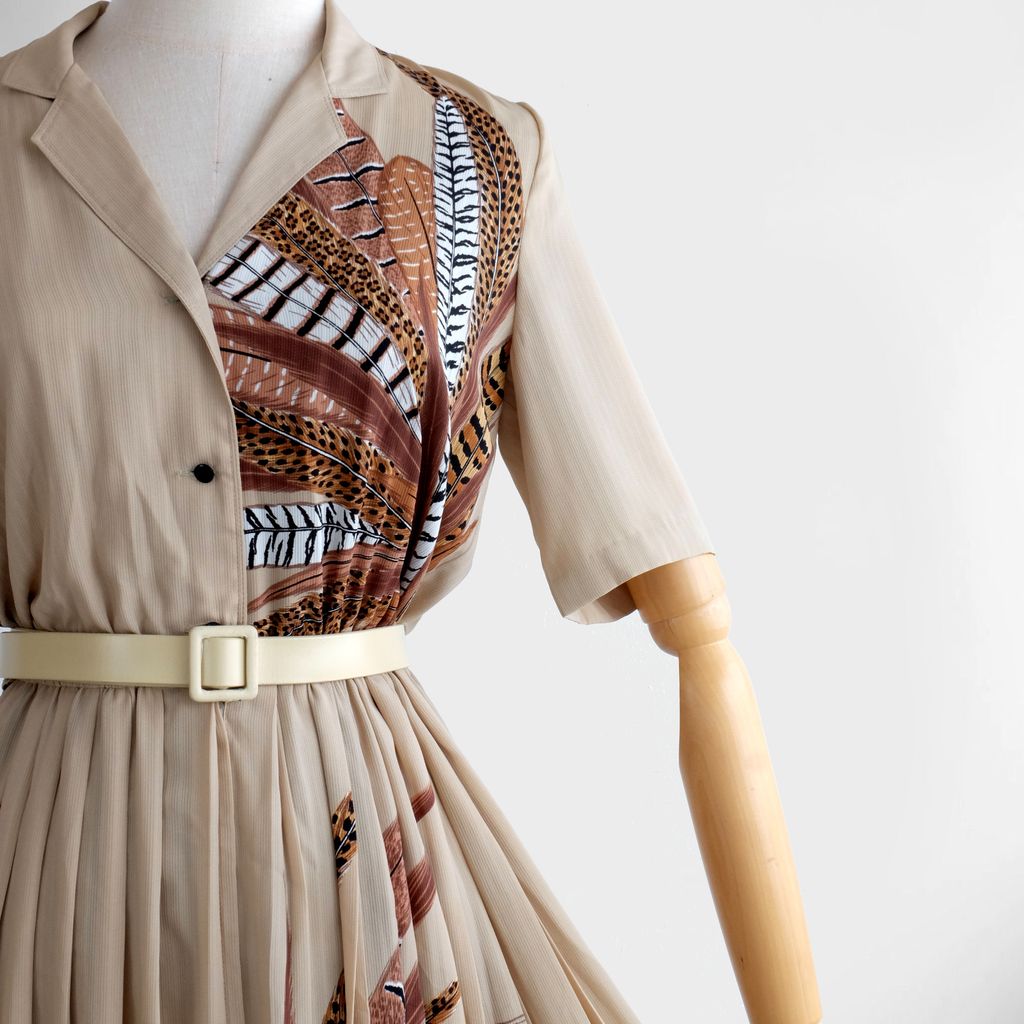 Circa 1980s. Rare beige khakis dress with feathers print.