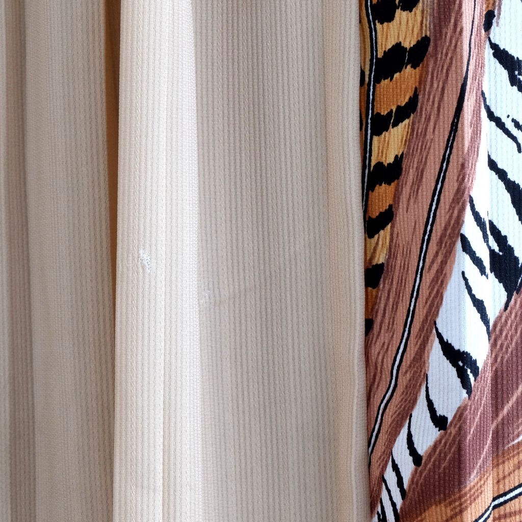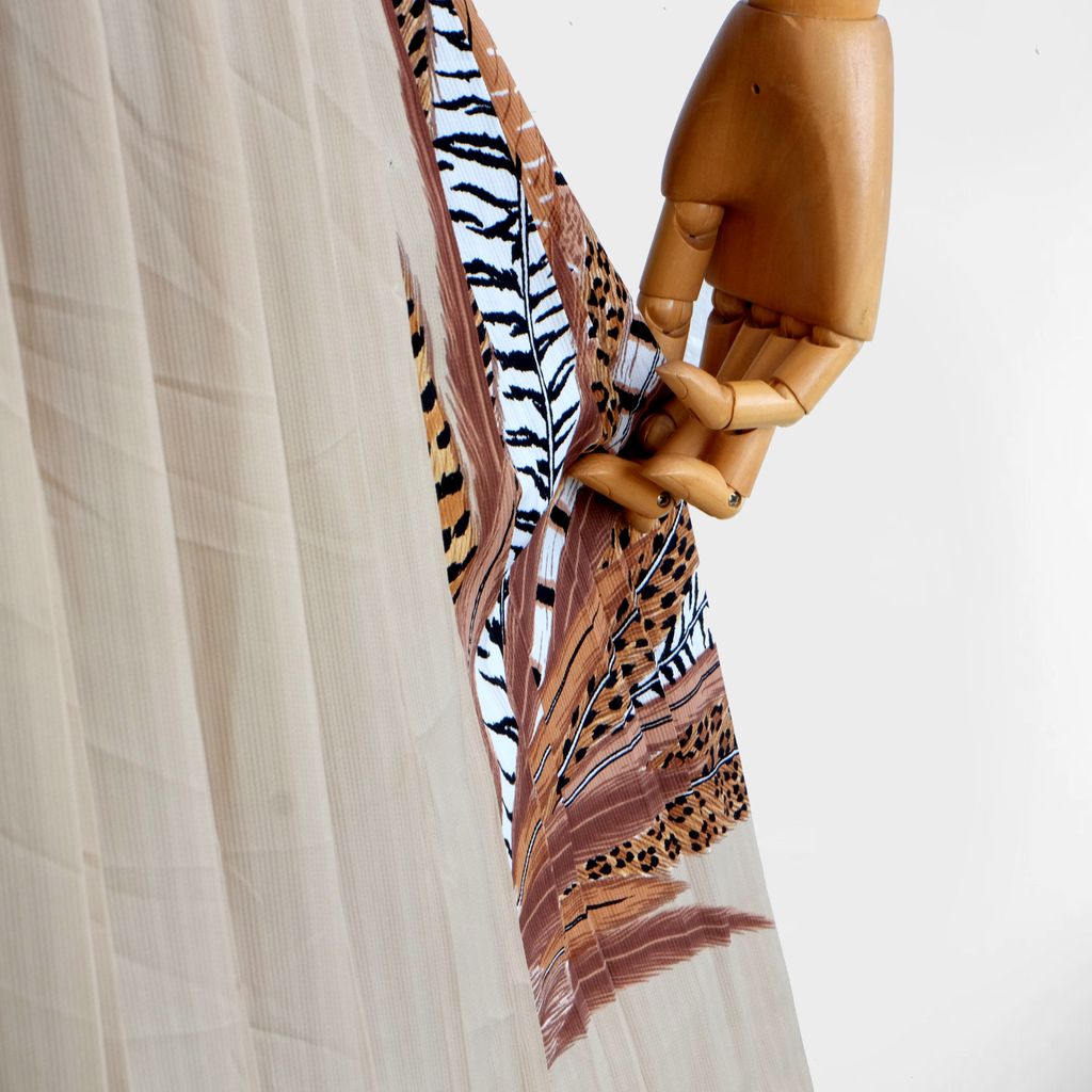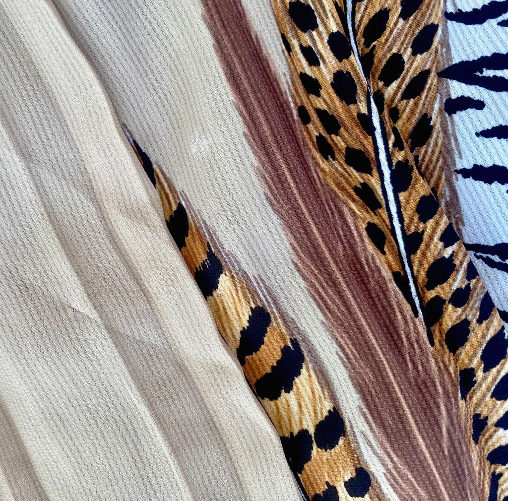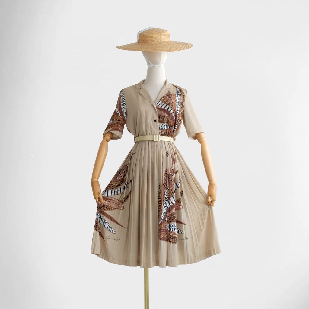 Circa 1980s. Rare beige khakis dress with feathers print.