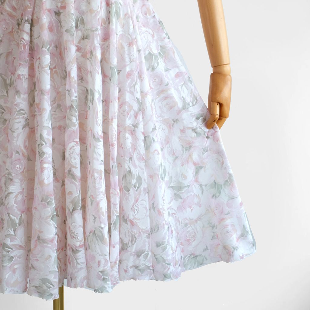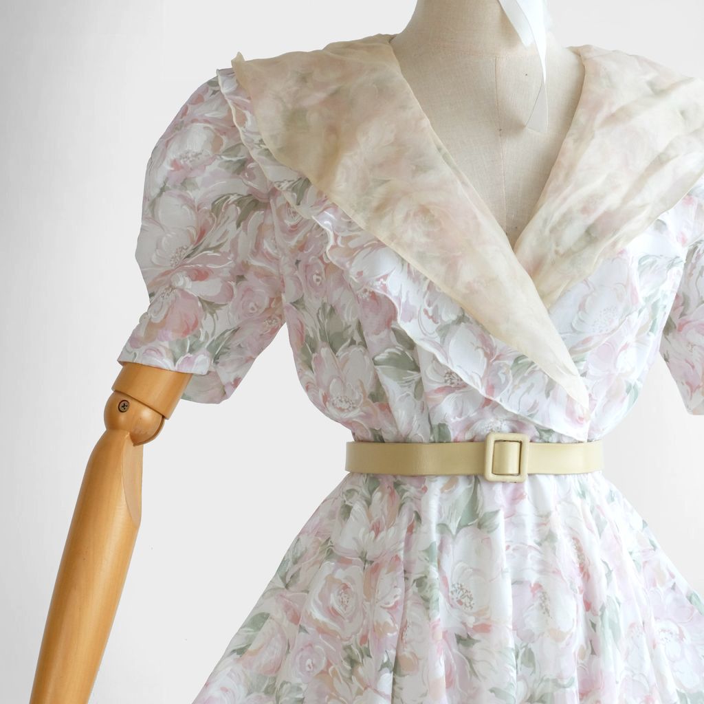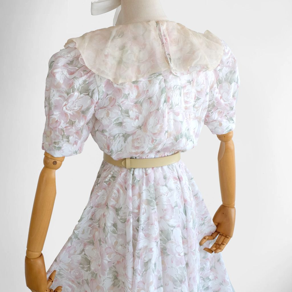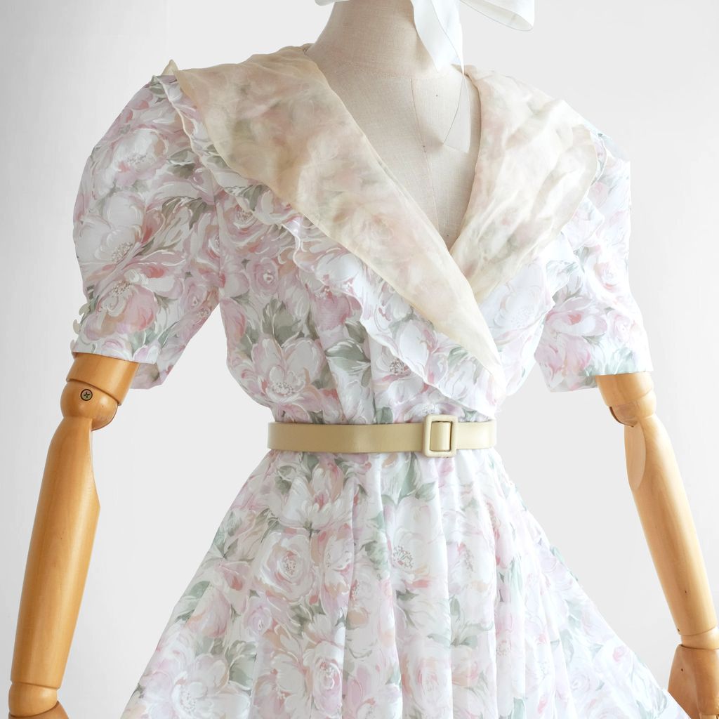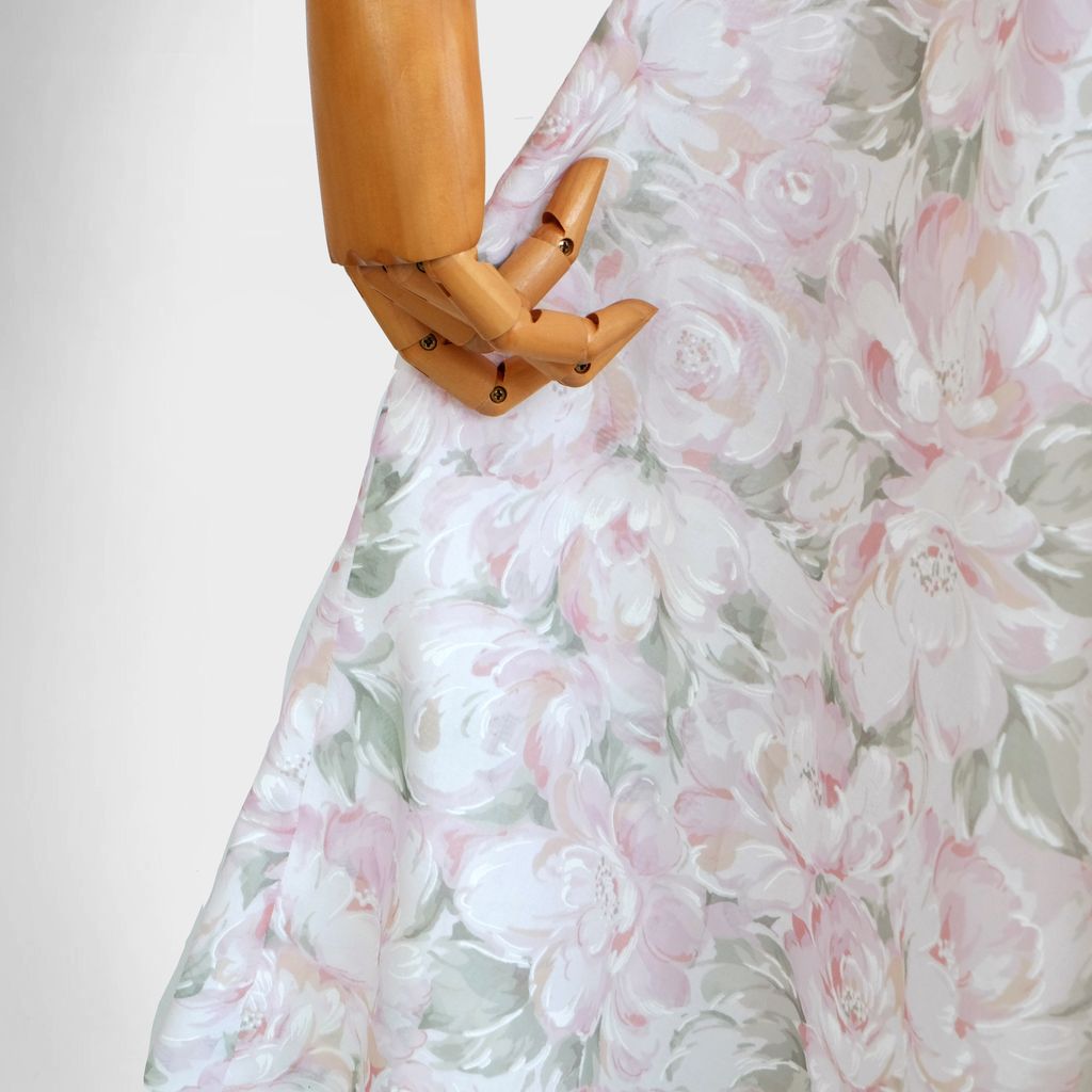 Circa 1980s. Exquisite ivory pastel pink dress with florals print.