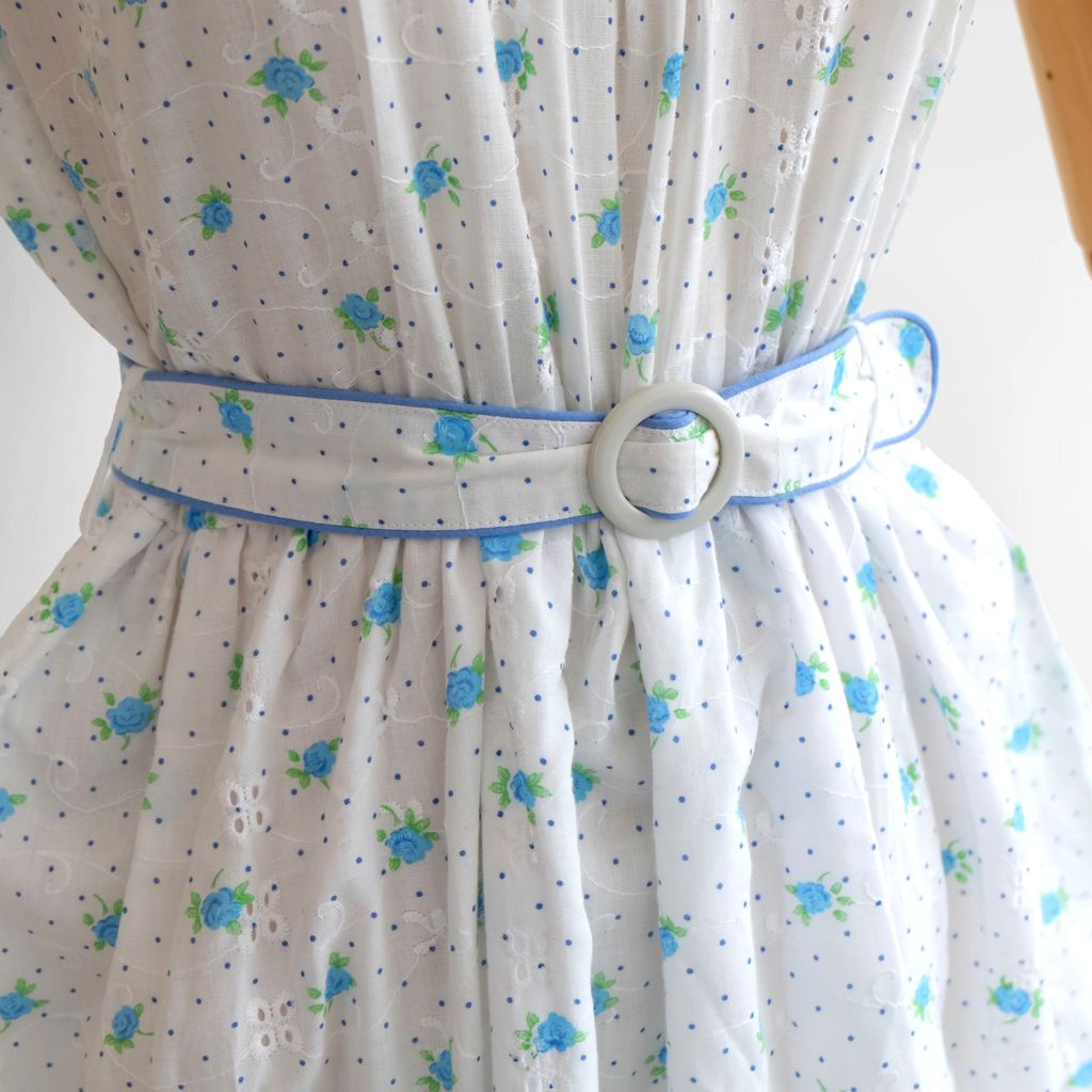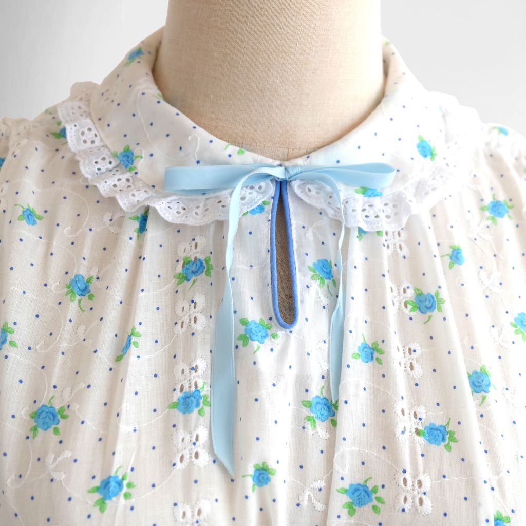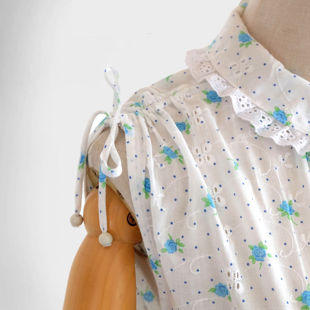 Lace embroidered fabric. Bow tie lace rufffles collar neckline. Drawstring shoulder design. Back zip closure. Bottom lined. Elastic waist. Cotton fabric. Belt included.