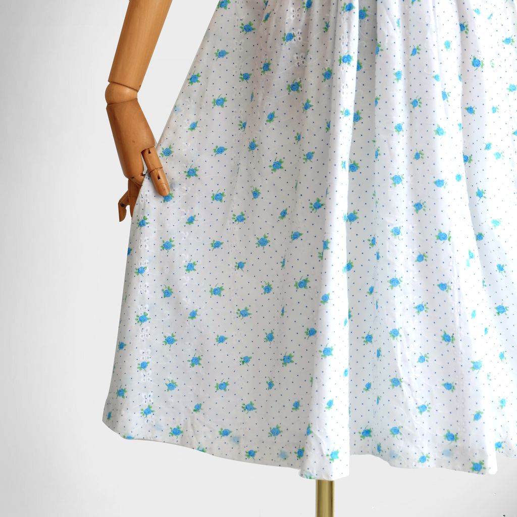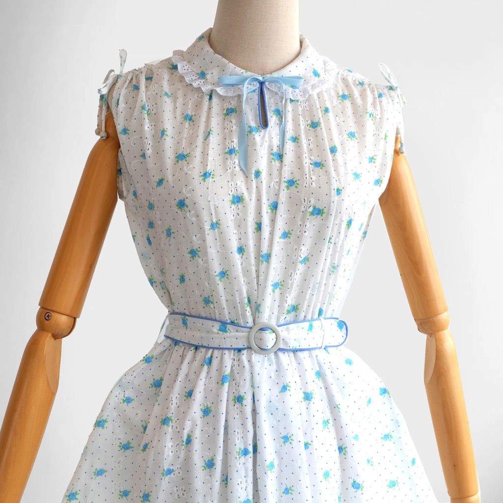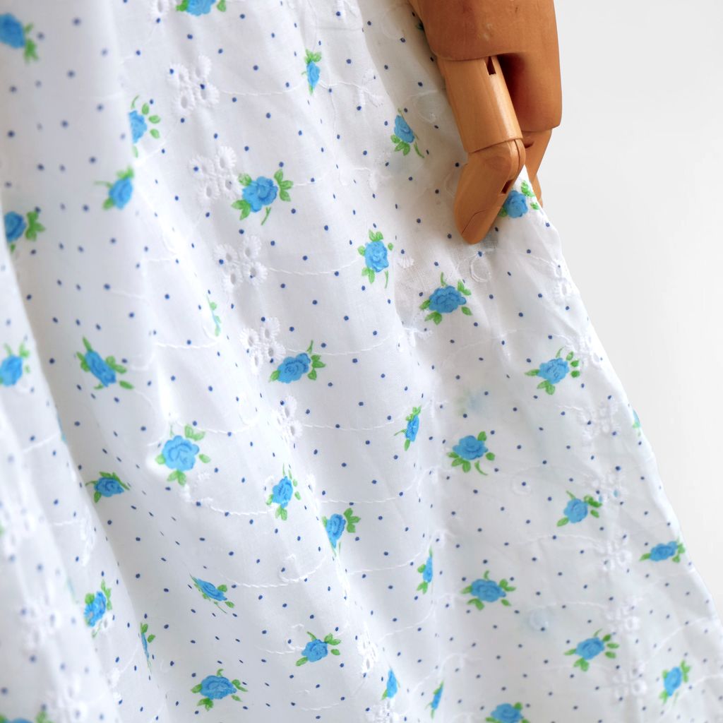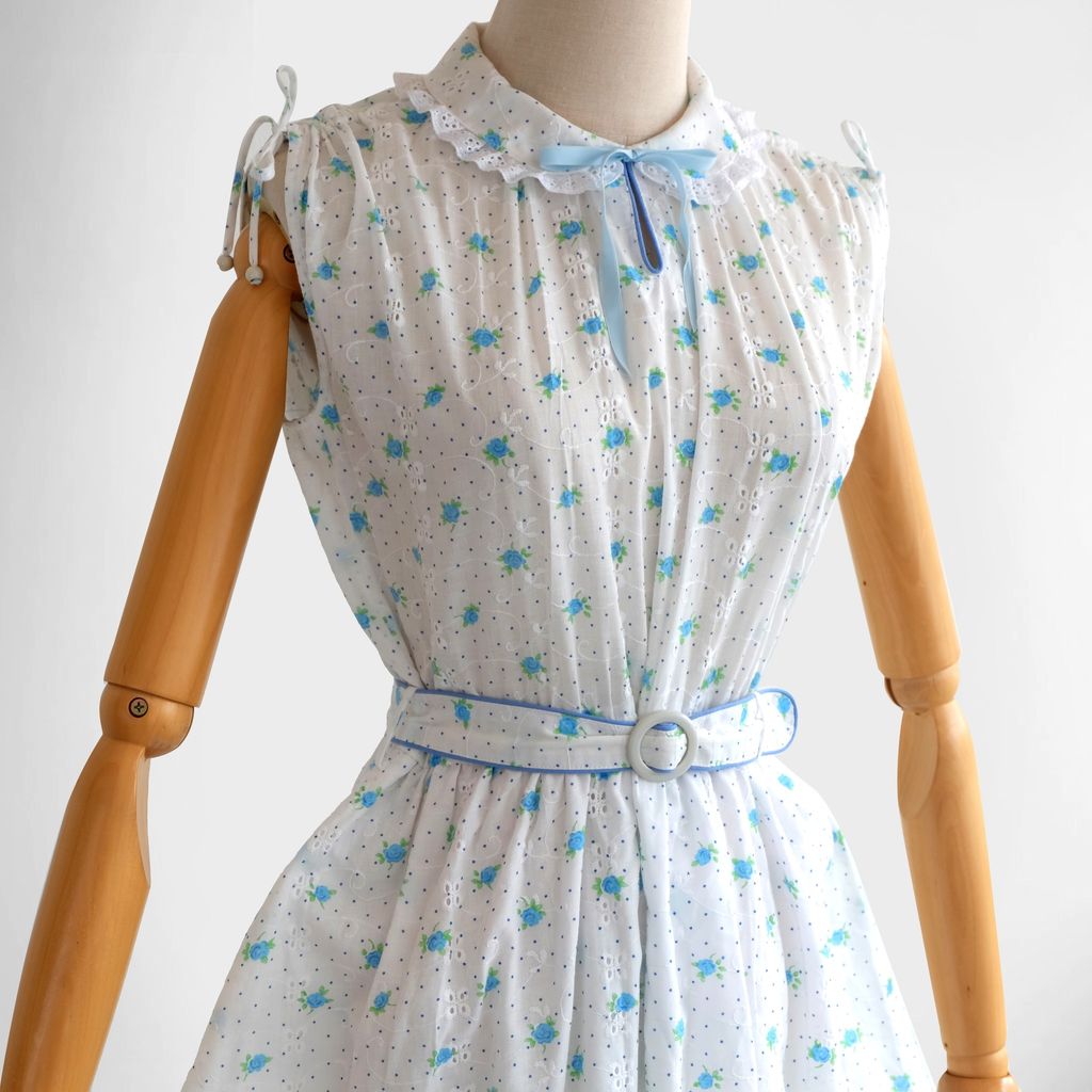 Lace embroidered fabric. Bow tie lace rufffles collar neckline. Drawstring shoulder design. Back zip closure. Bottom lined. Elastic waist. Cotton fabric. Belt included.