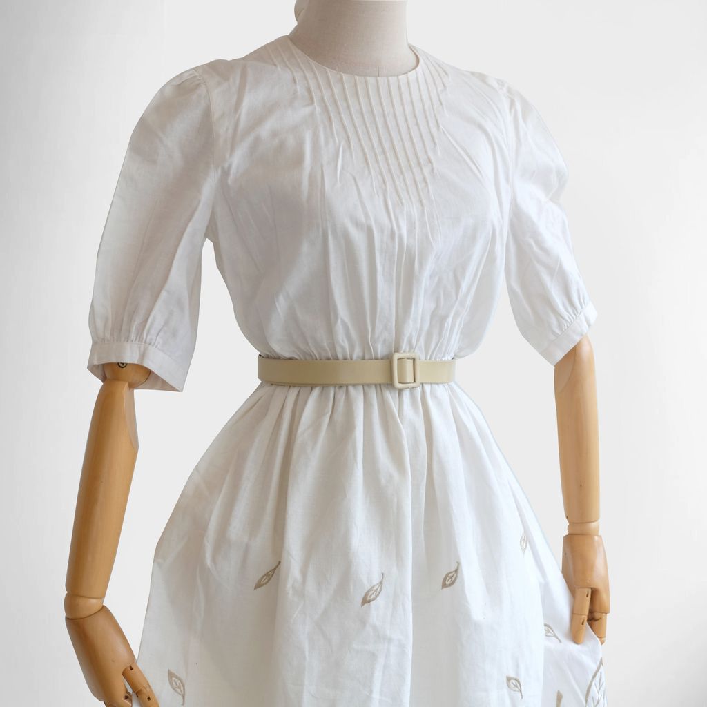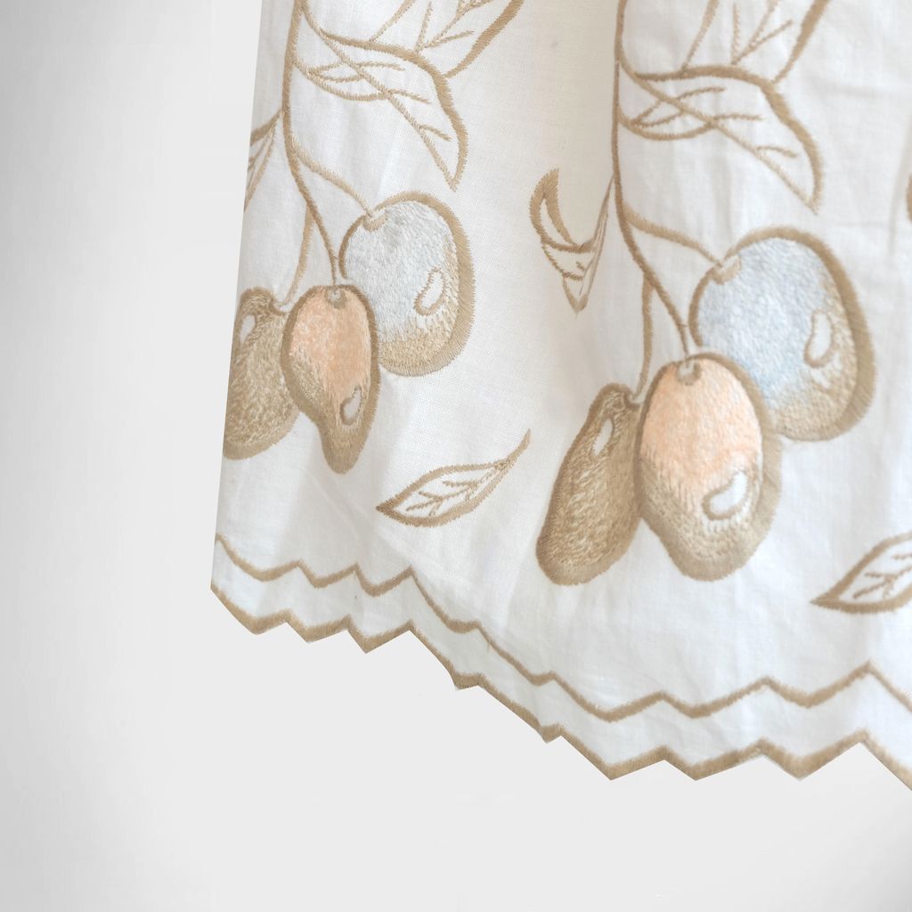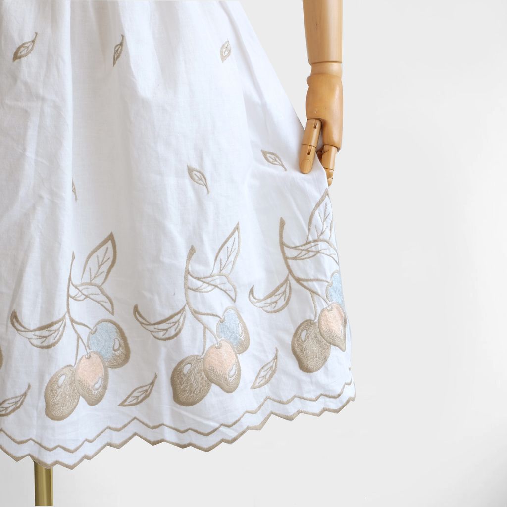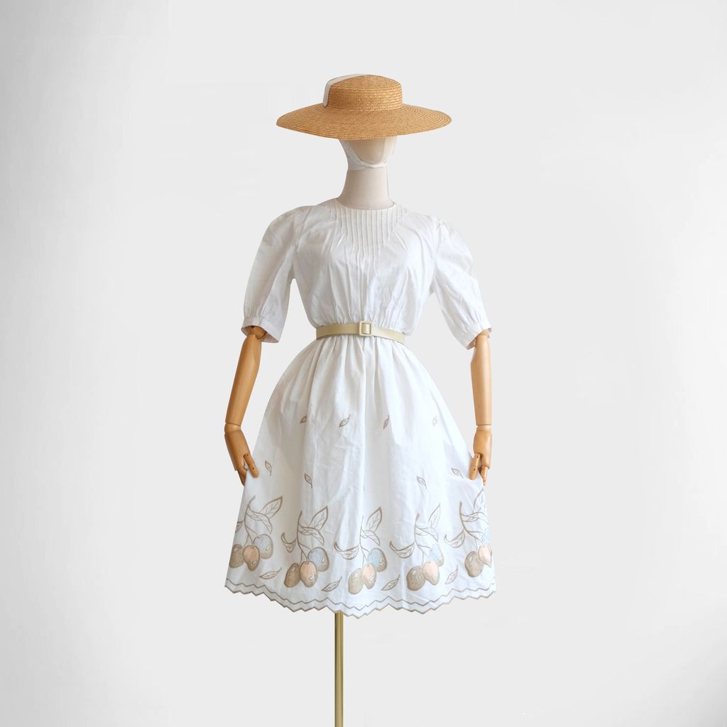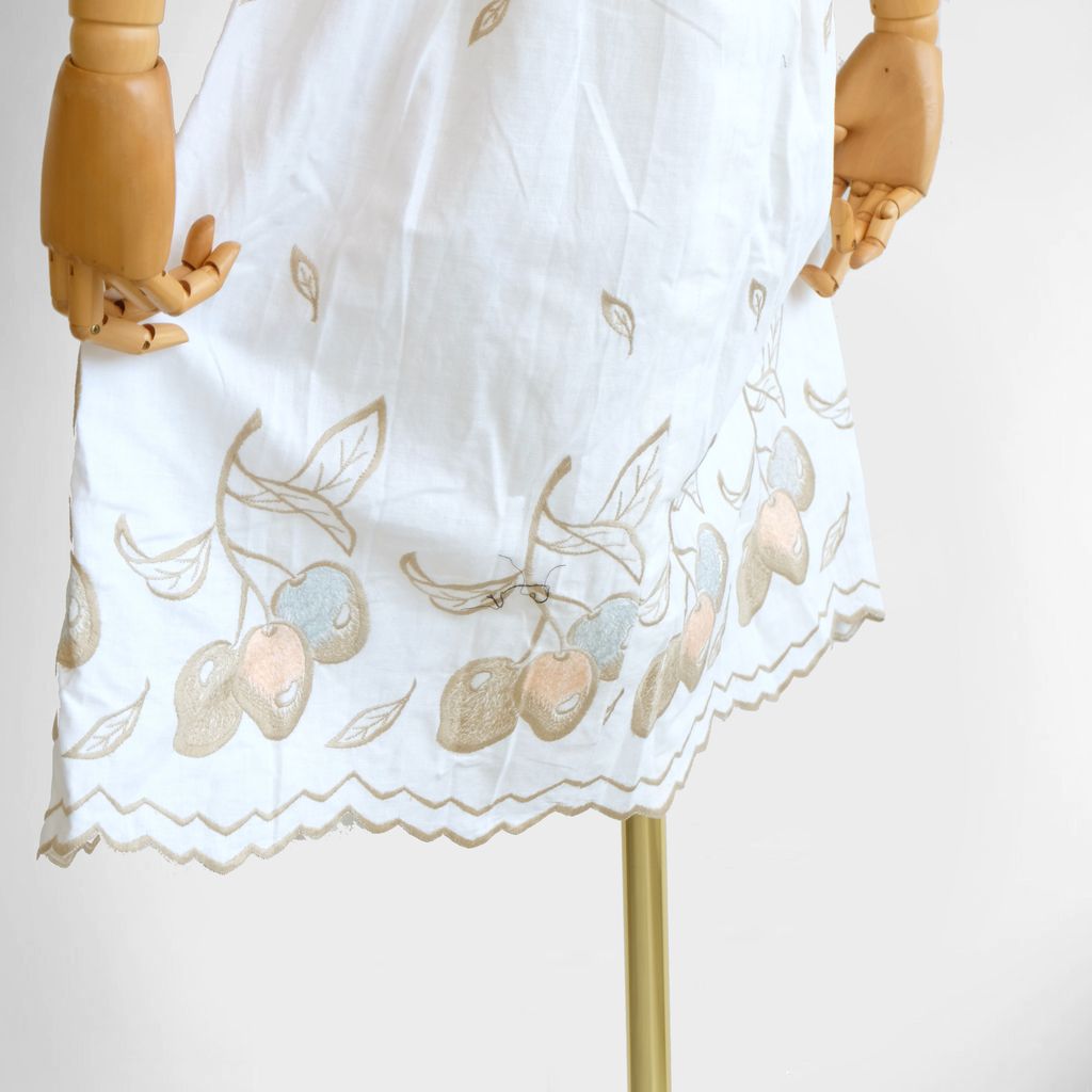 Circa 1980s. Cream beige dress with fruits embroidery