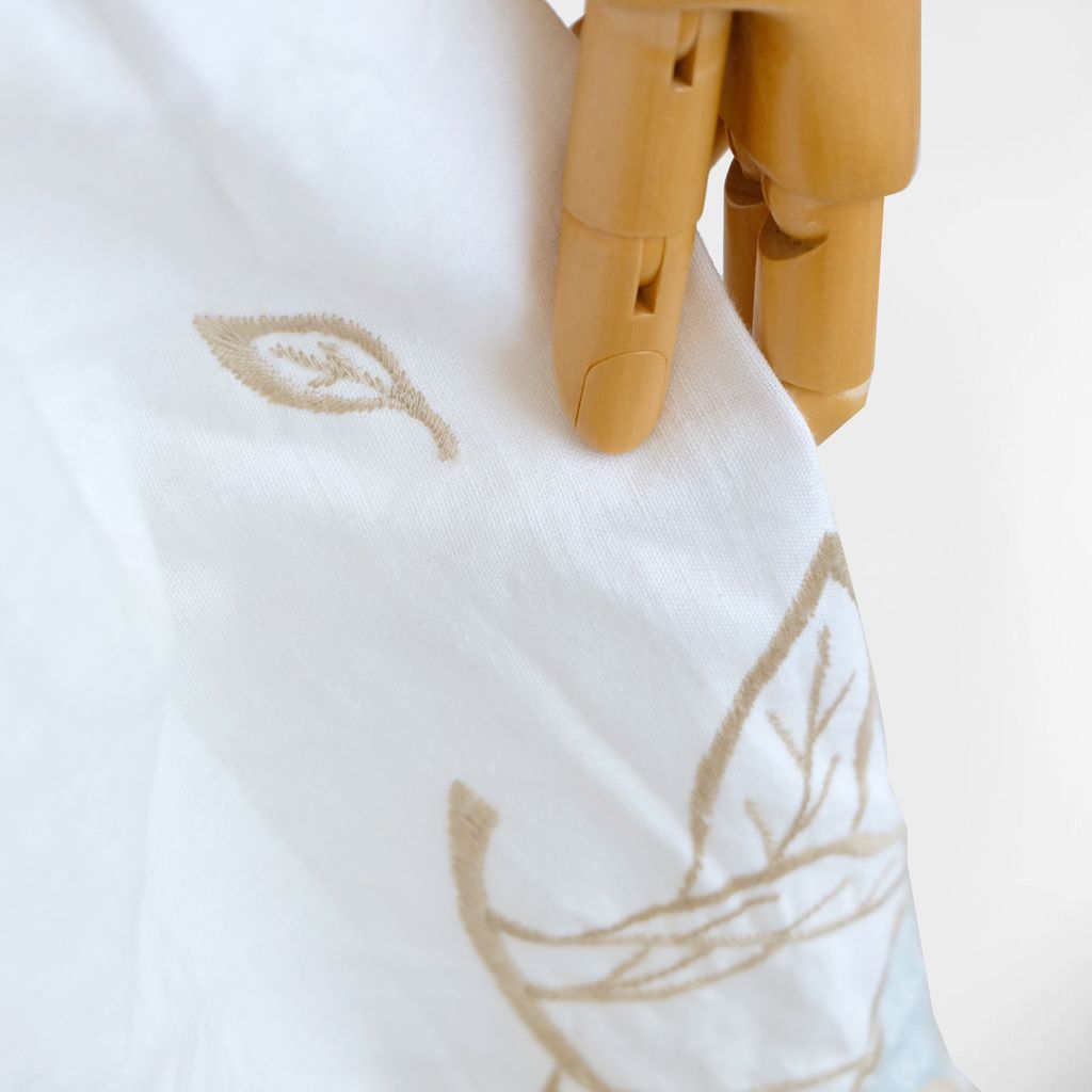 Beautiful embroidery details at the bottom skirt with zigzag cutout.Puffy sleeves. Back zip closure. Lined. Fixed waist. Thick cotton fabric. Belt not included.