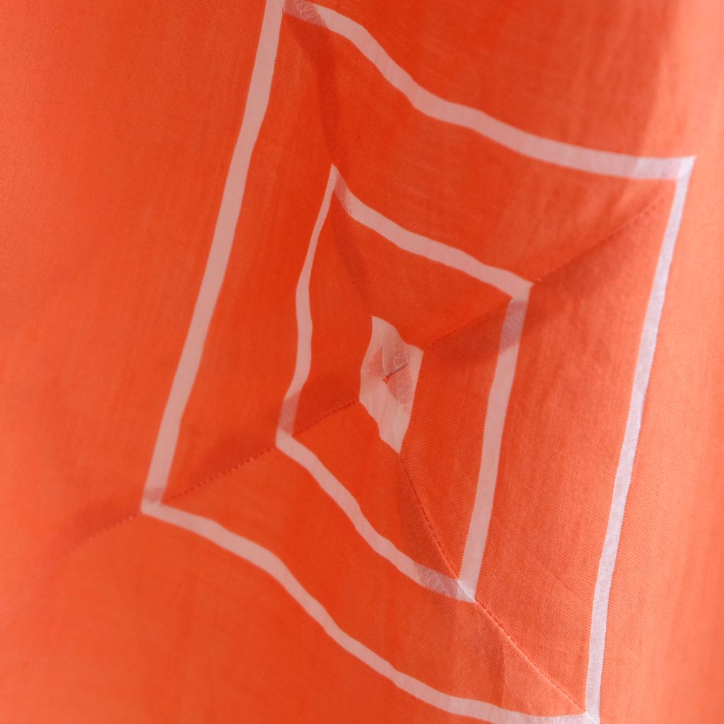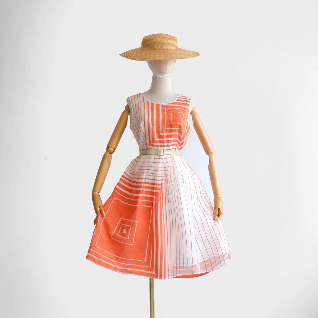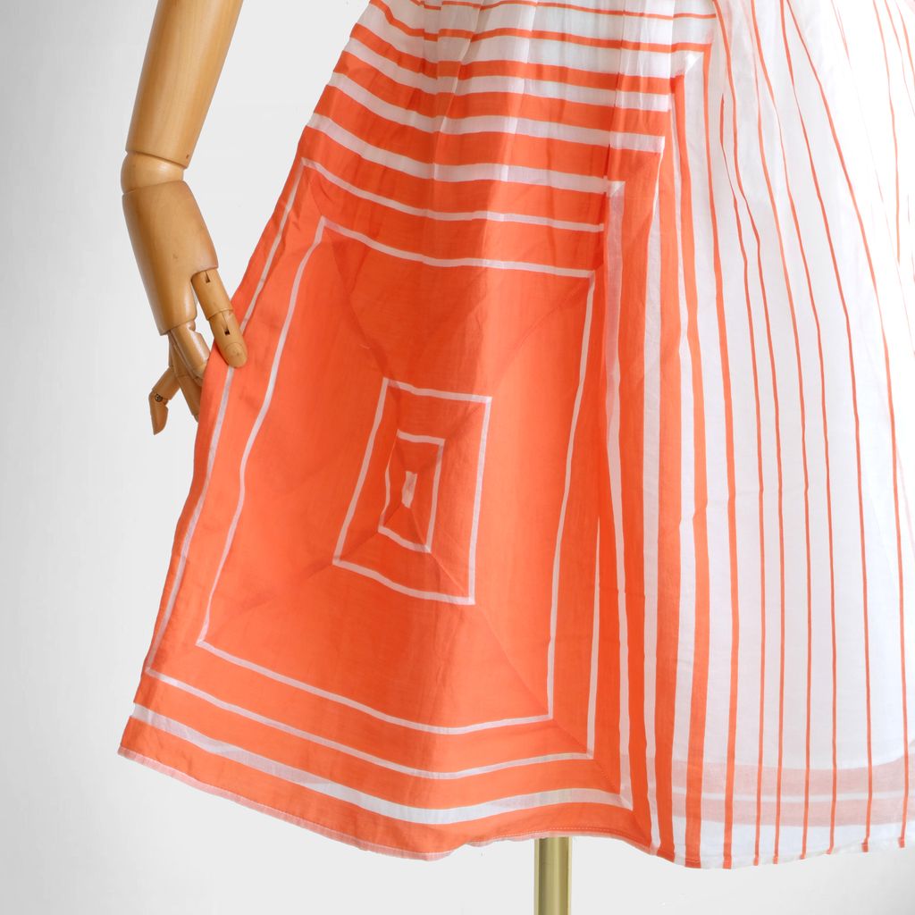 Circa 1980s. Rare orange dress with mid century style striped prints.
