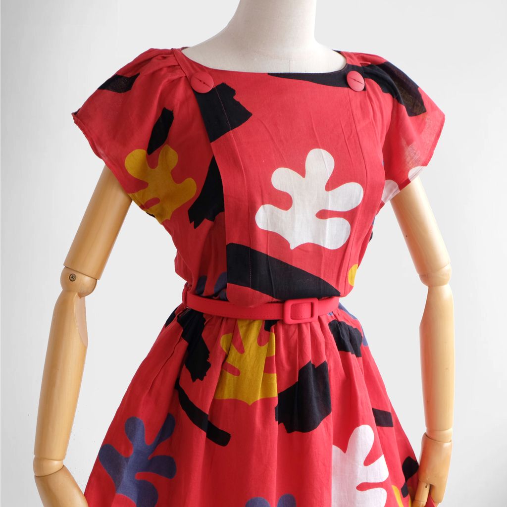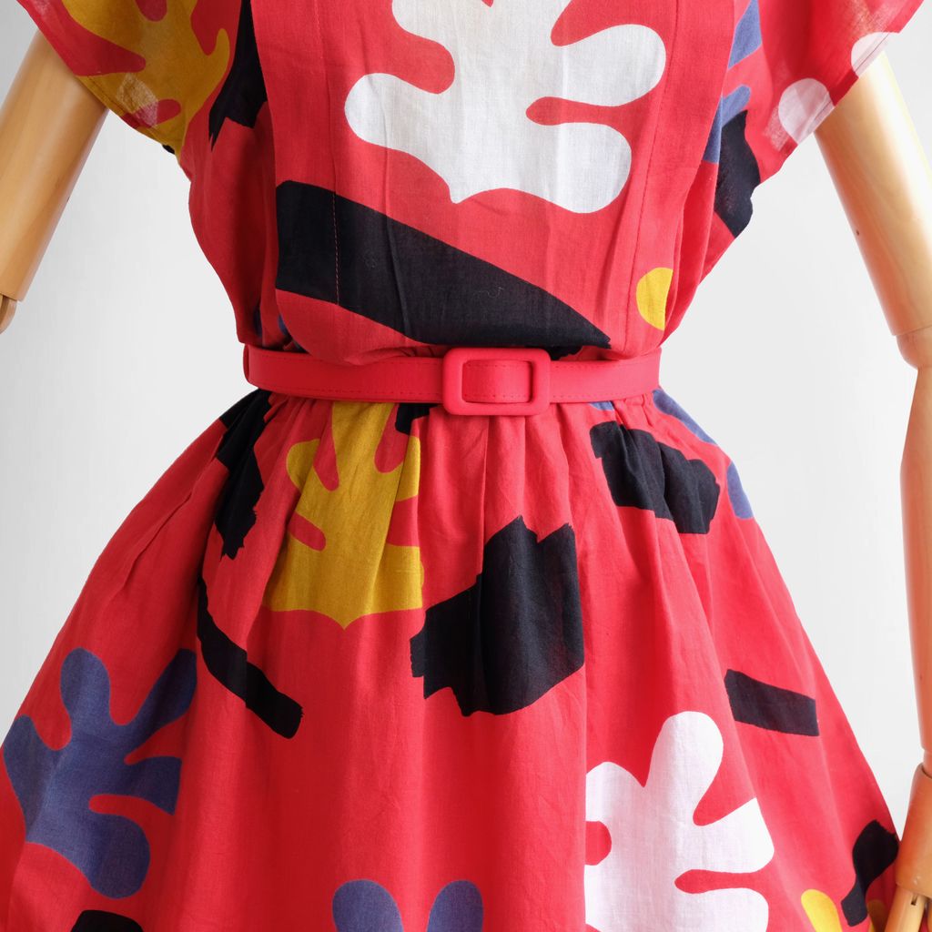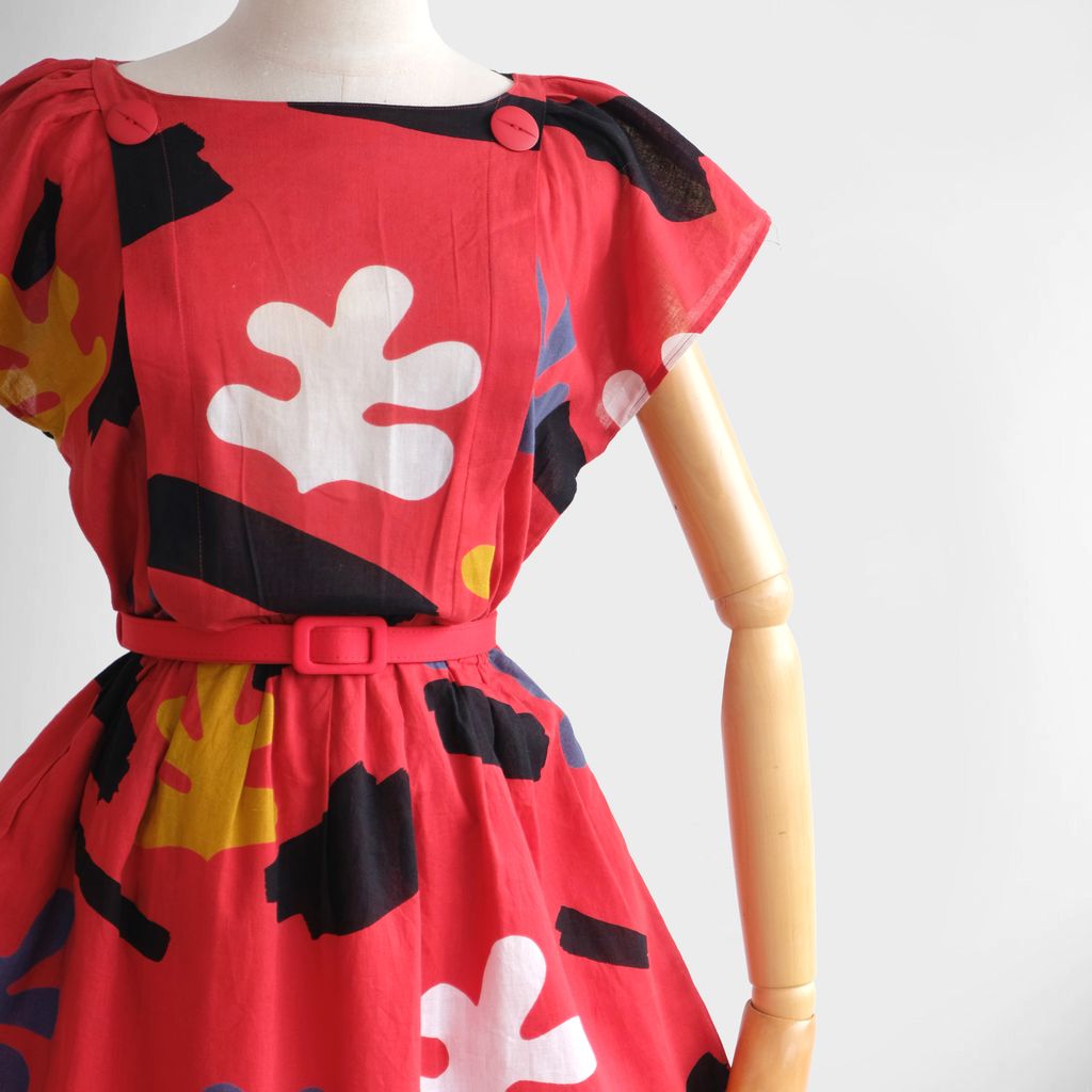 Circa 1980s. Red dress with unique graphic prints.