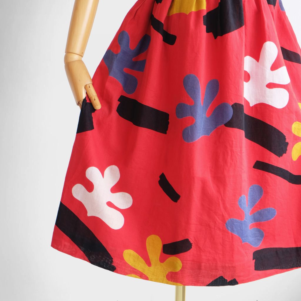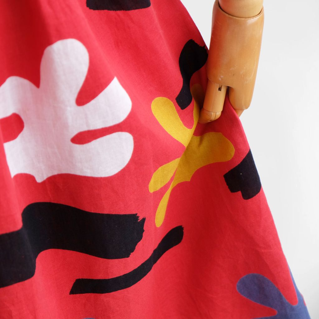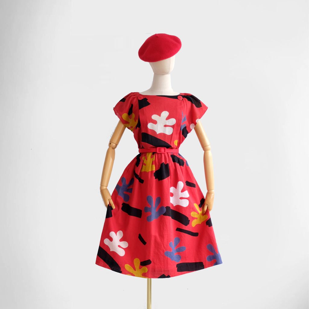 Circa 1980s. Red dress with unique graphic prints.