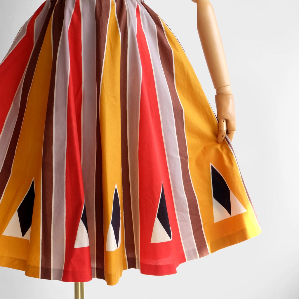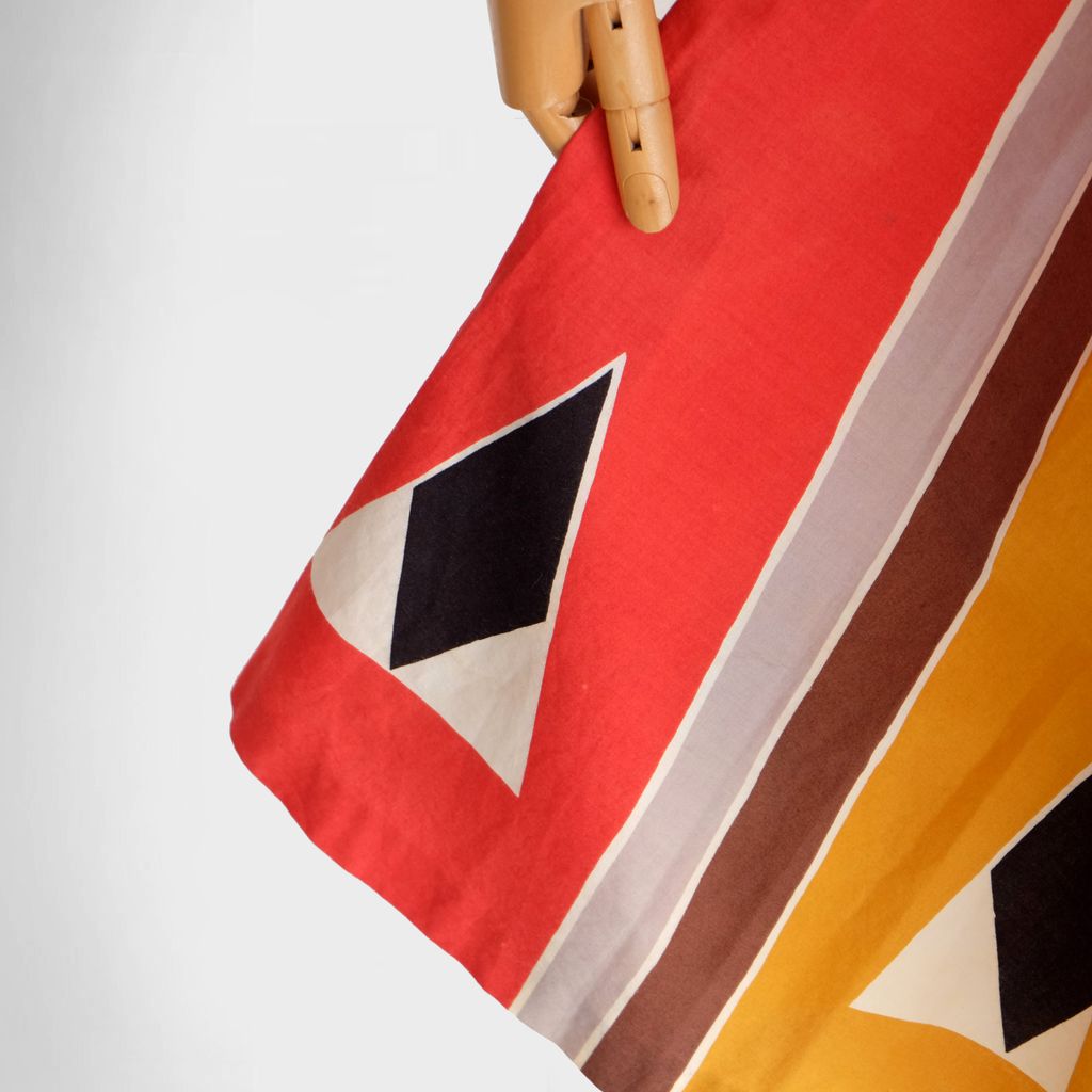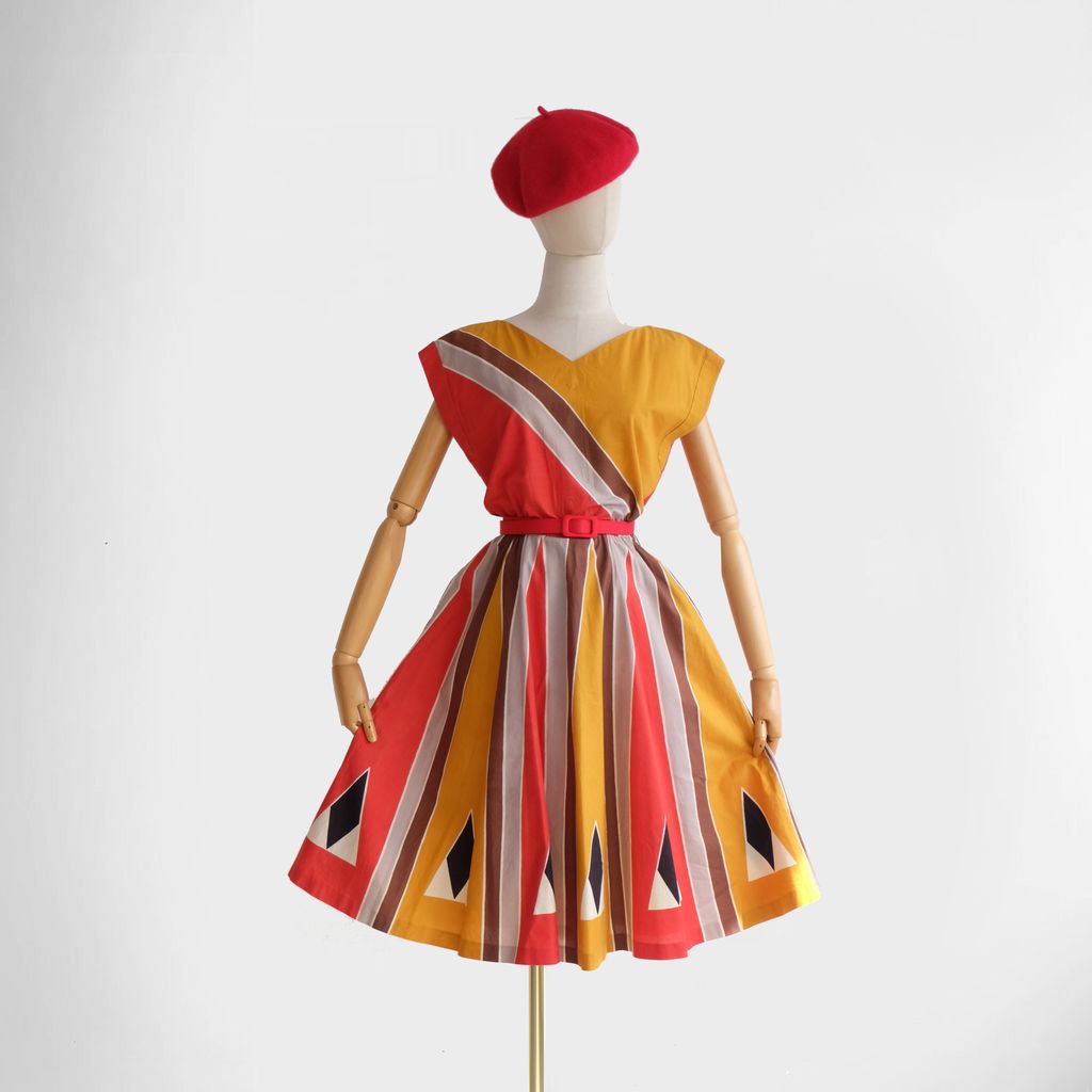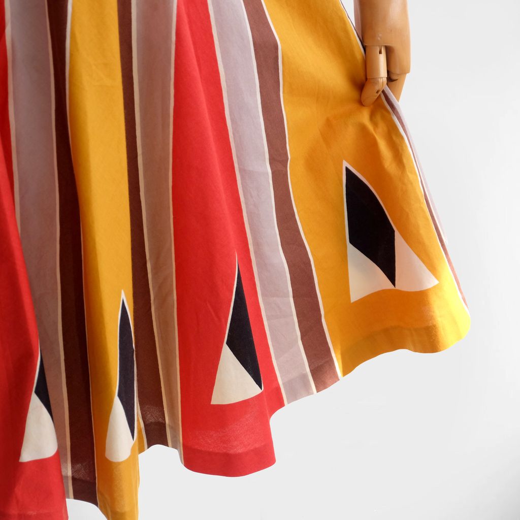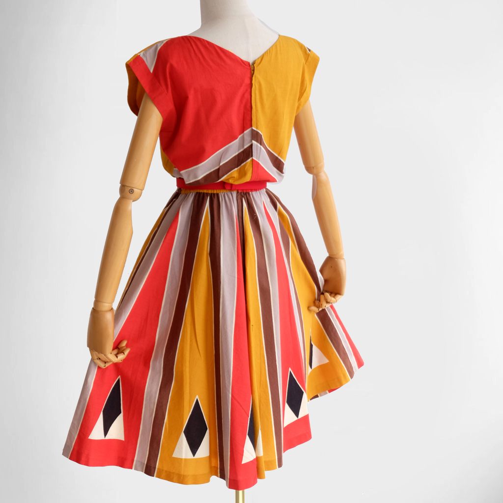 Circa 1980s. Red yellow dress with unique graphic prints.