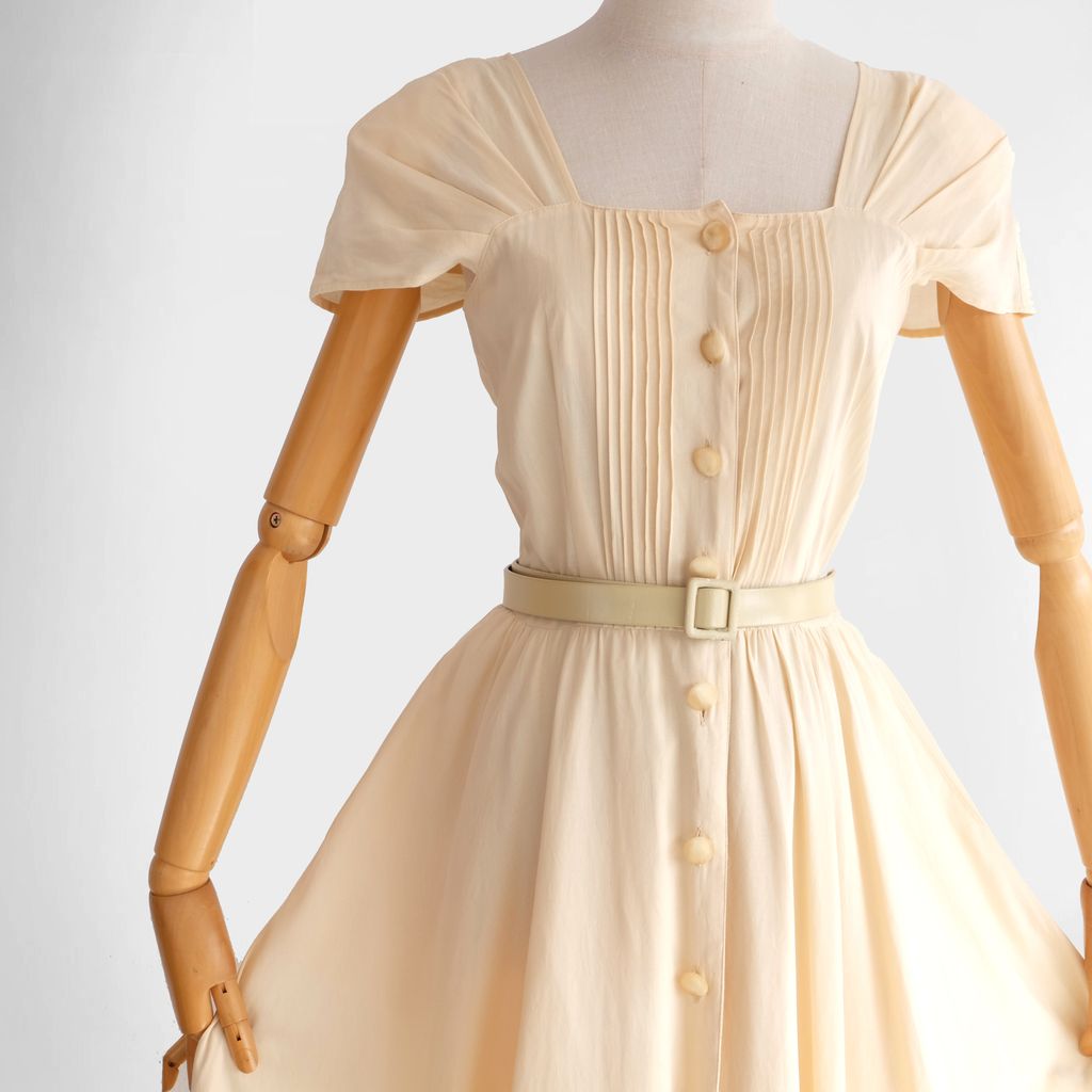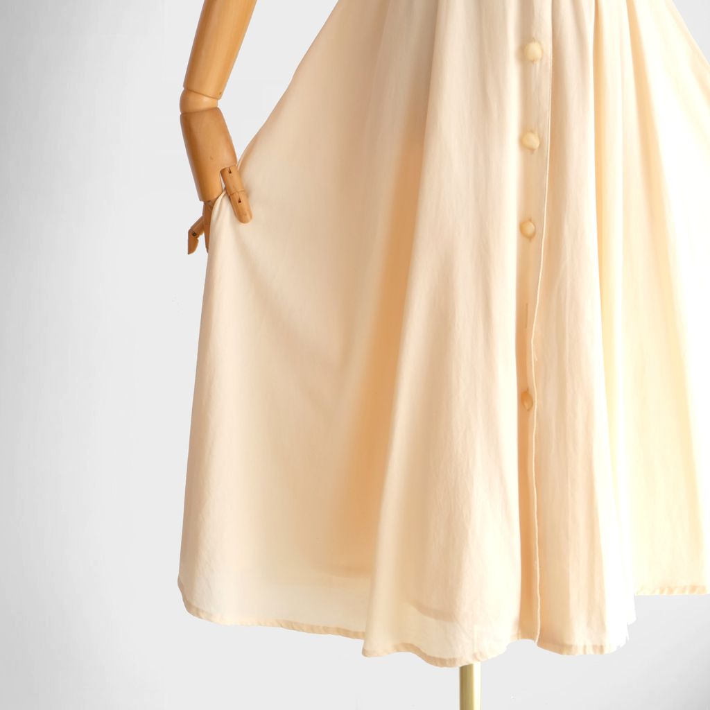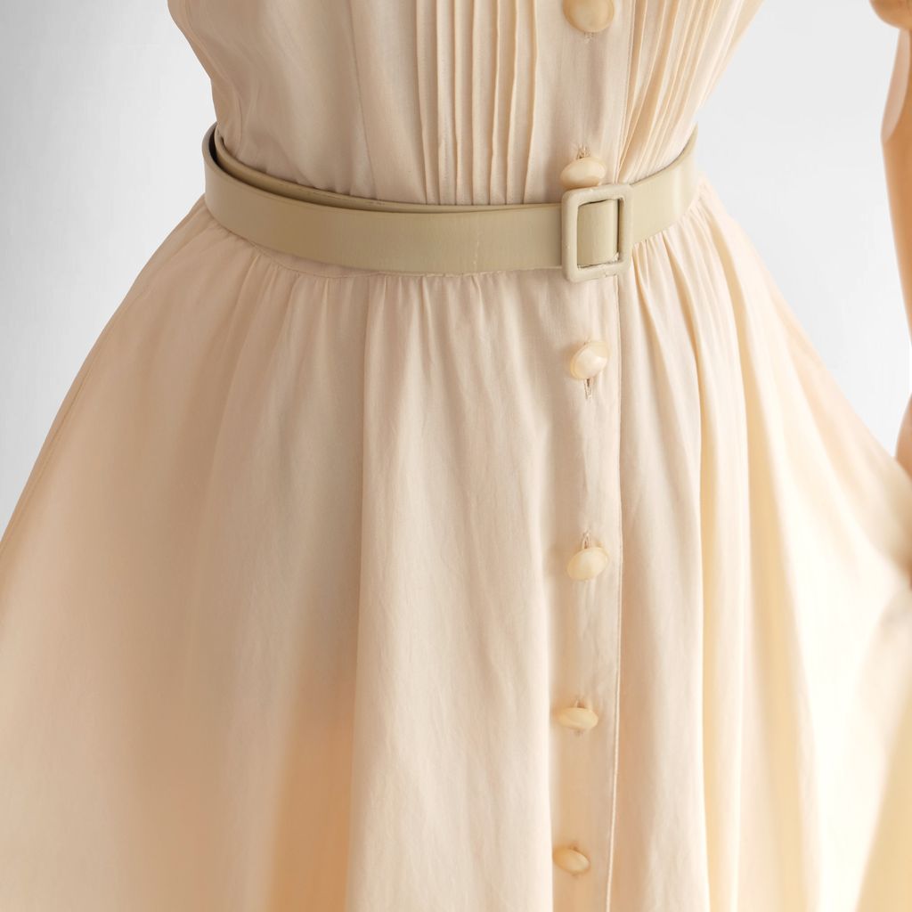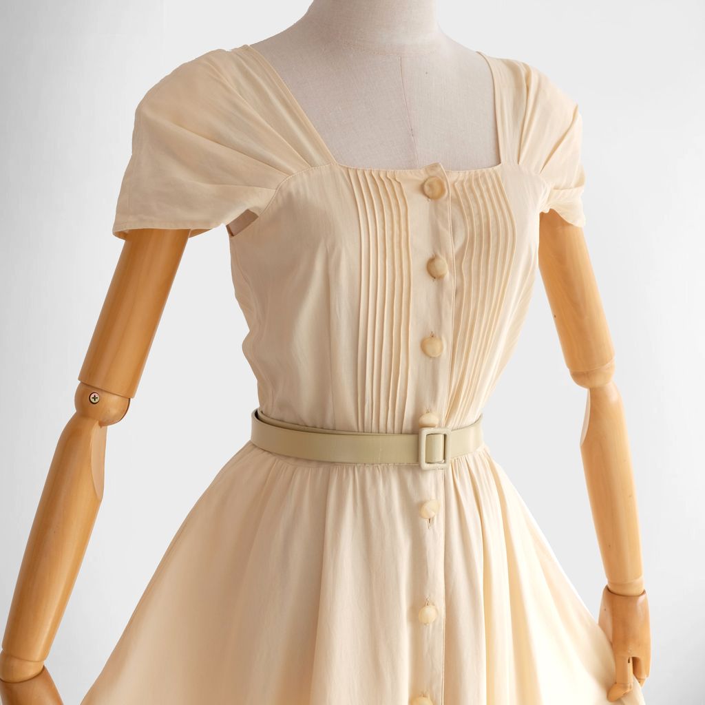 Square collar neckline. Off shoulder padded sleeve. Pockets. Front buttons closure. Bottom Lined. Fixed waist. Full circle skirt. Cotton fabric. Belt not included.