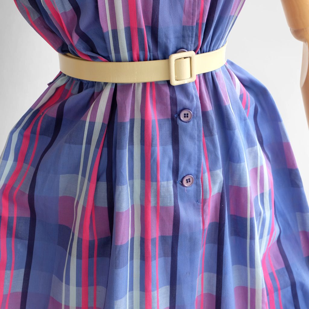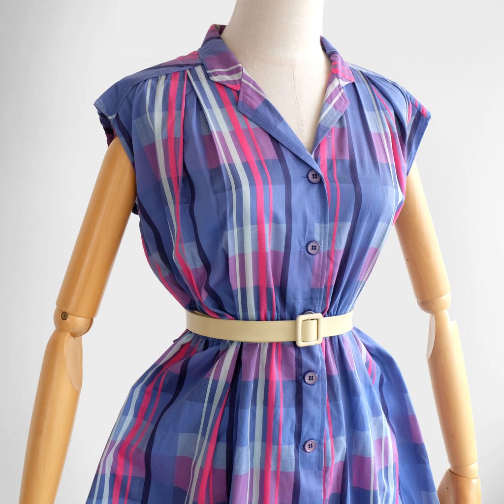 Circa 1980s. Lilac pink dress with stripes print.