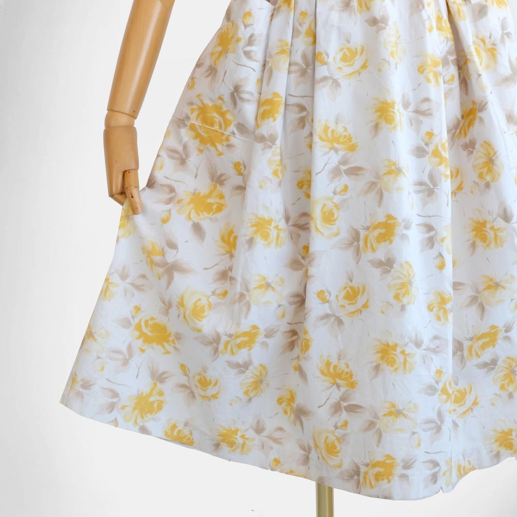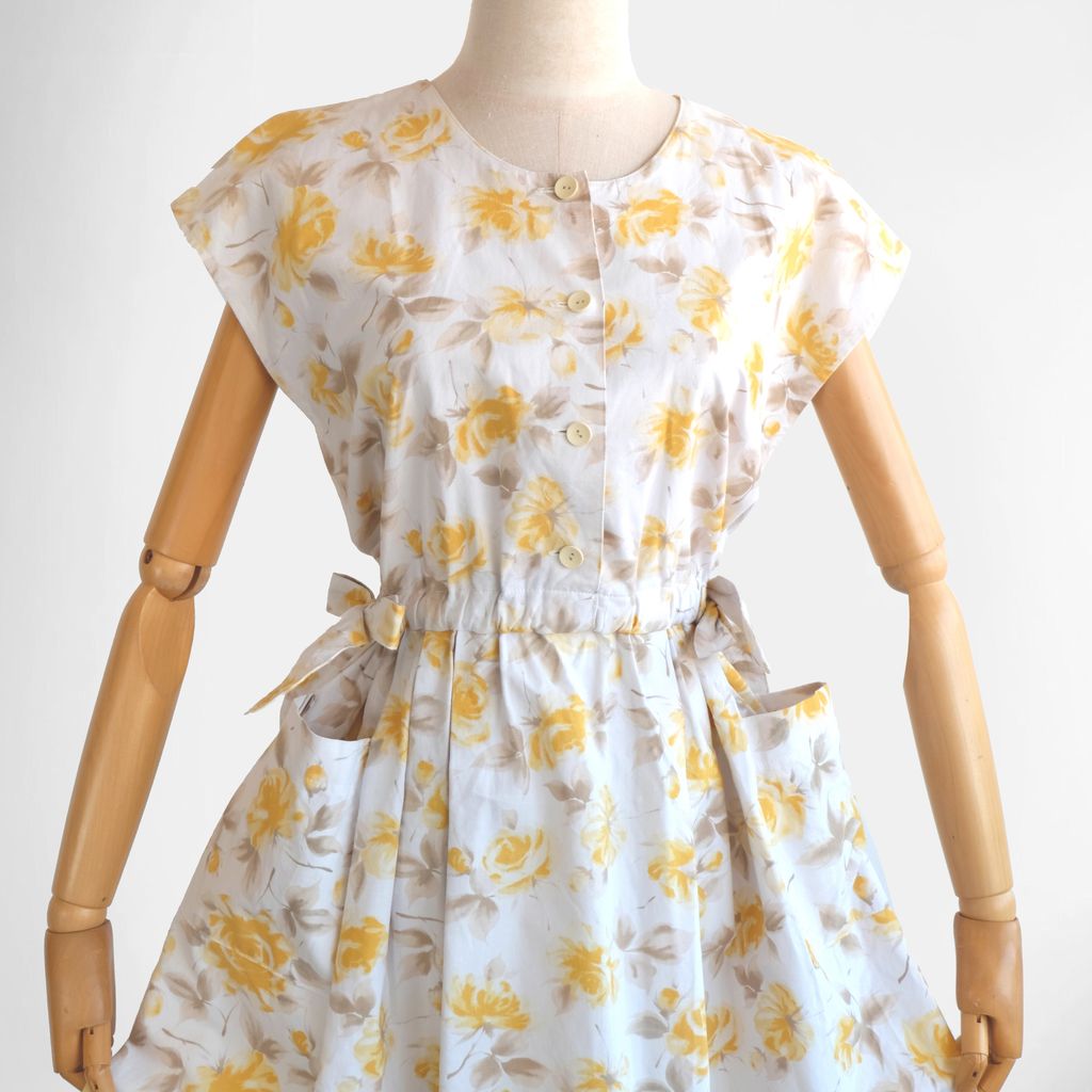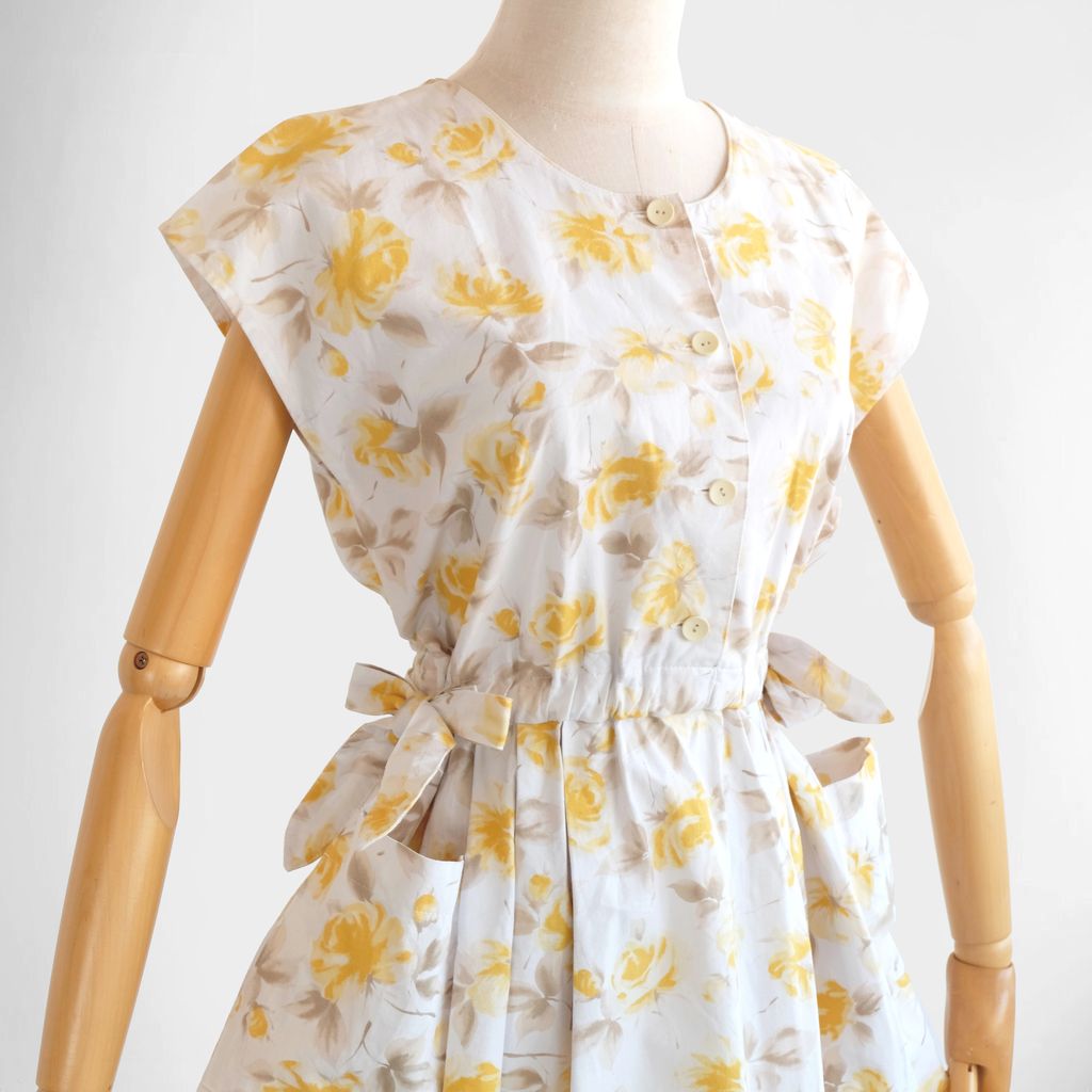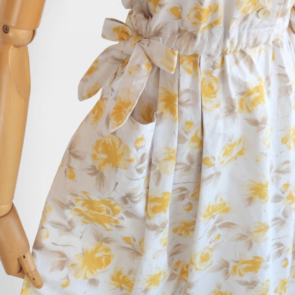 Front buttons closure. Elastic waist with ribbon to cinch at the side. Unlined. Pockets. Cotton fabric.