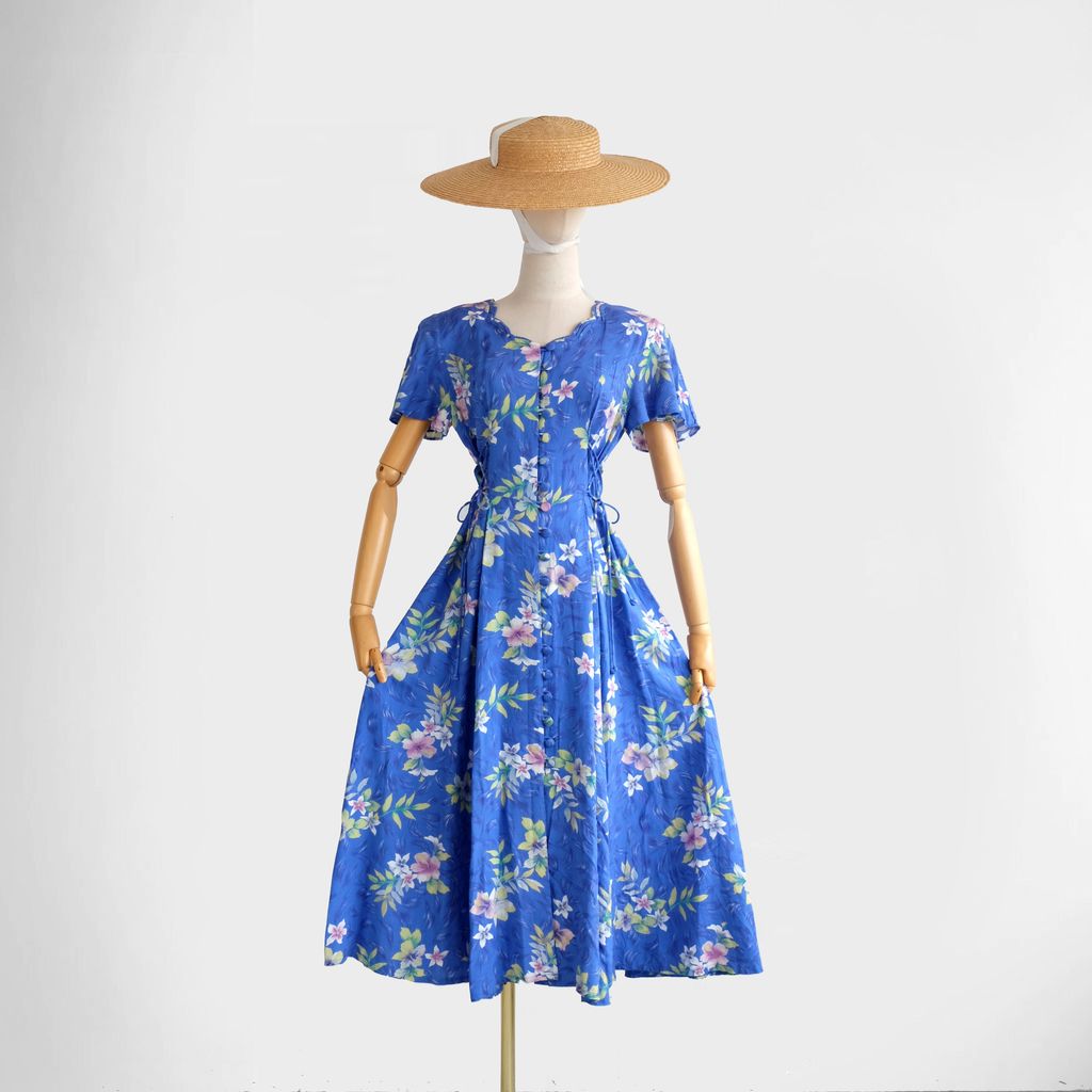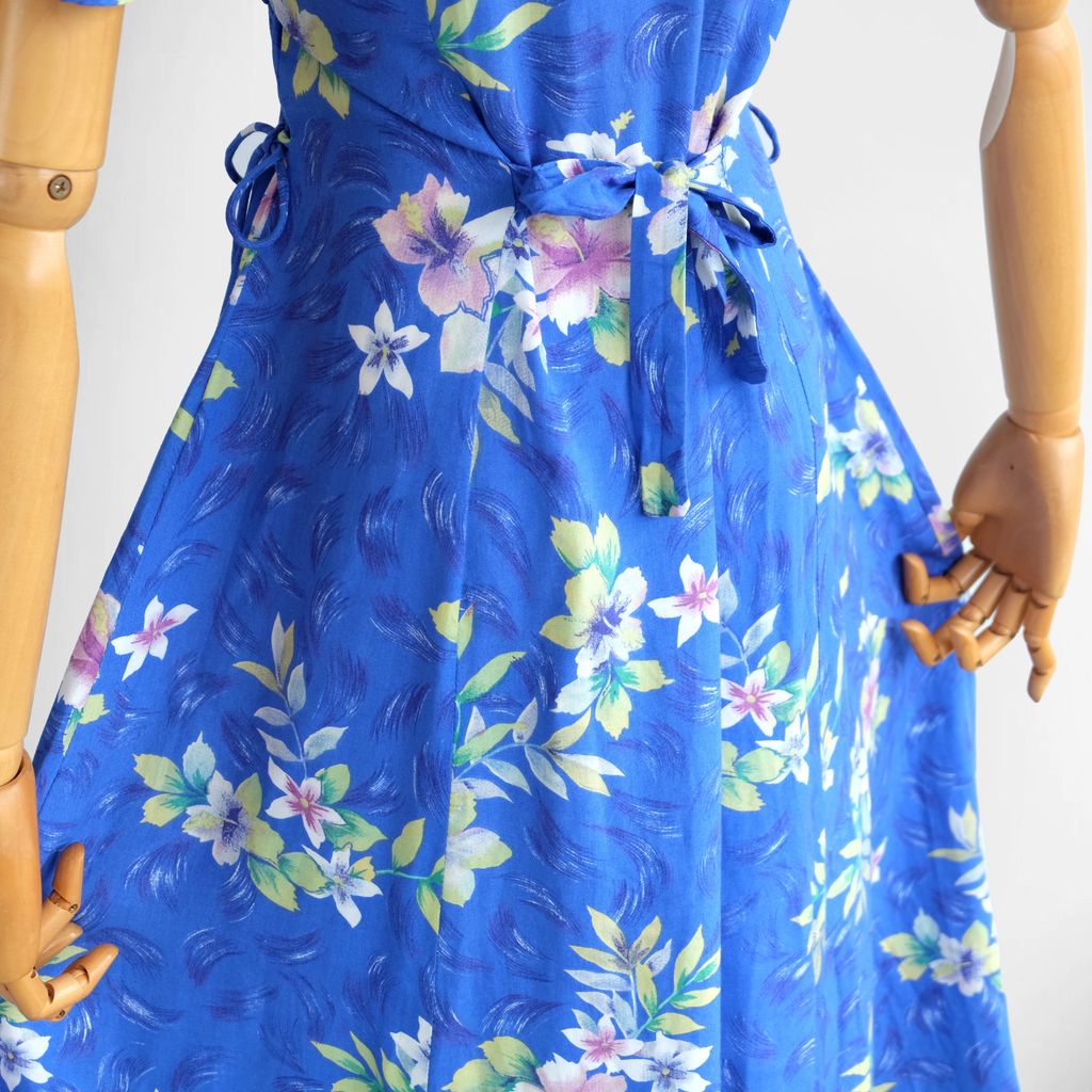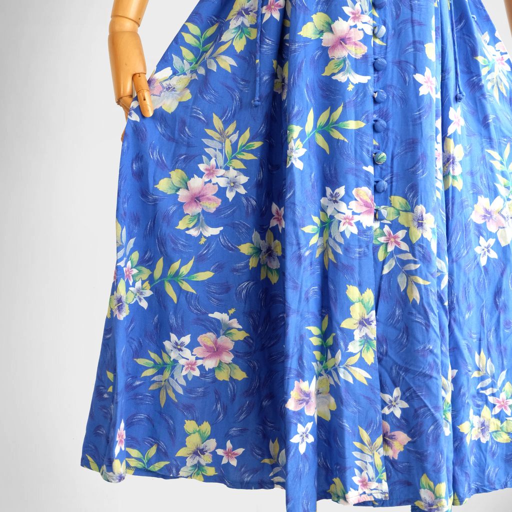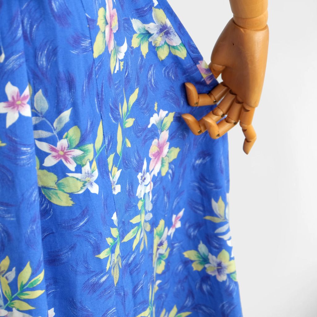 Circa 1980s. Gorgeous blue long dress with bright florals print.