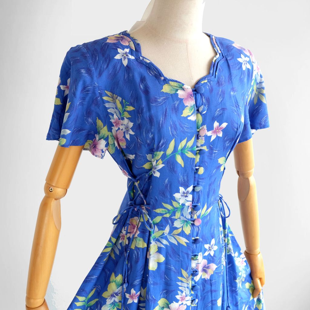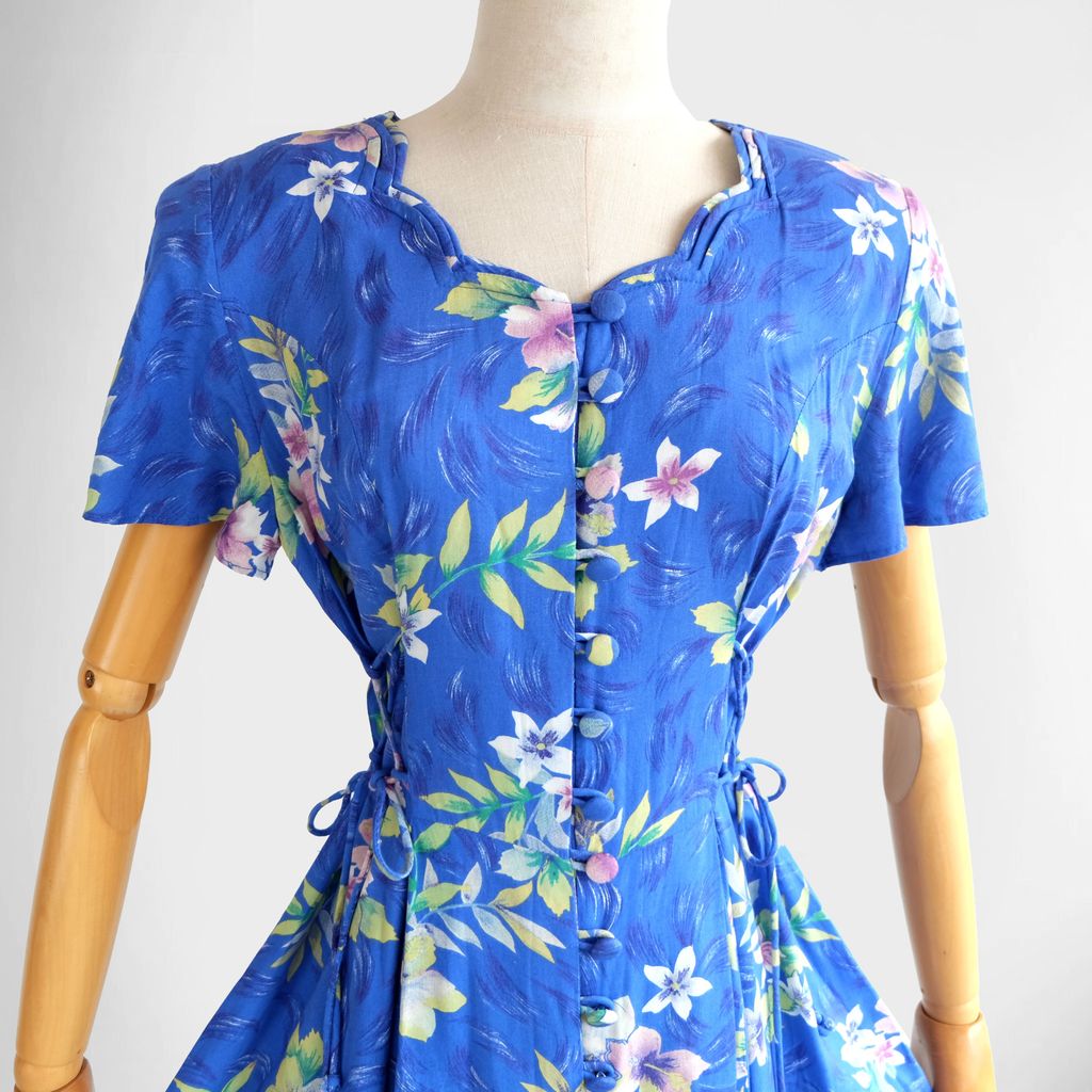 Front buttons closure. Scallop trim V neckline. Light padded shoulder. Unlined. Fixed waist but adjestable. Comes with ribbon to cinch at the front and back waist. Flare skirt. Rayon fabric.