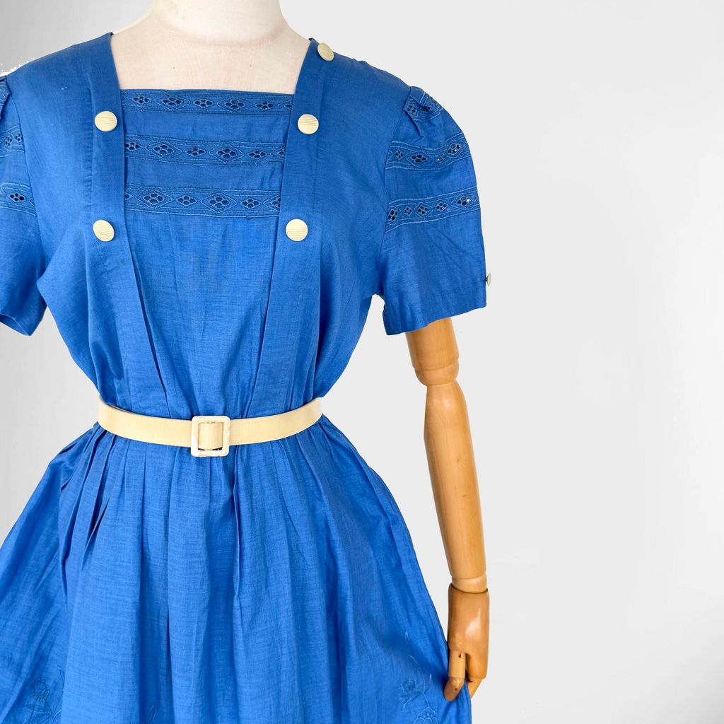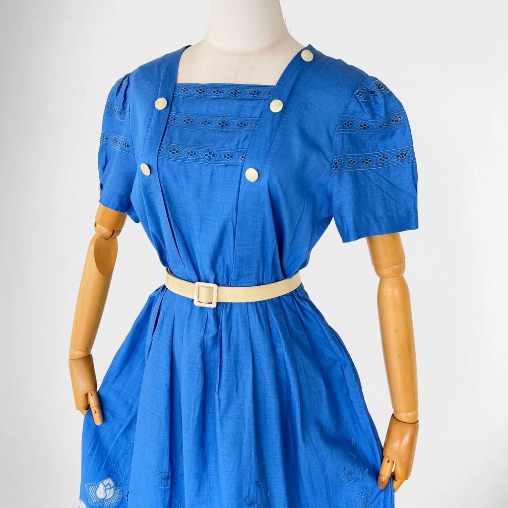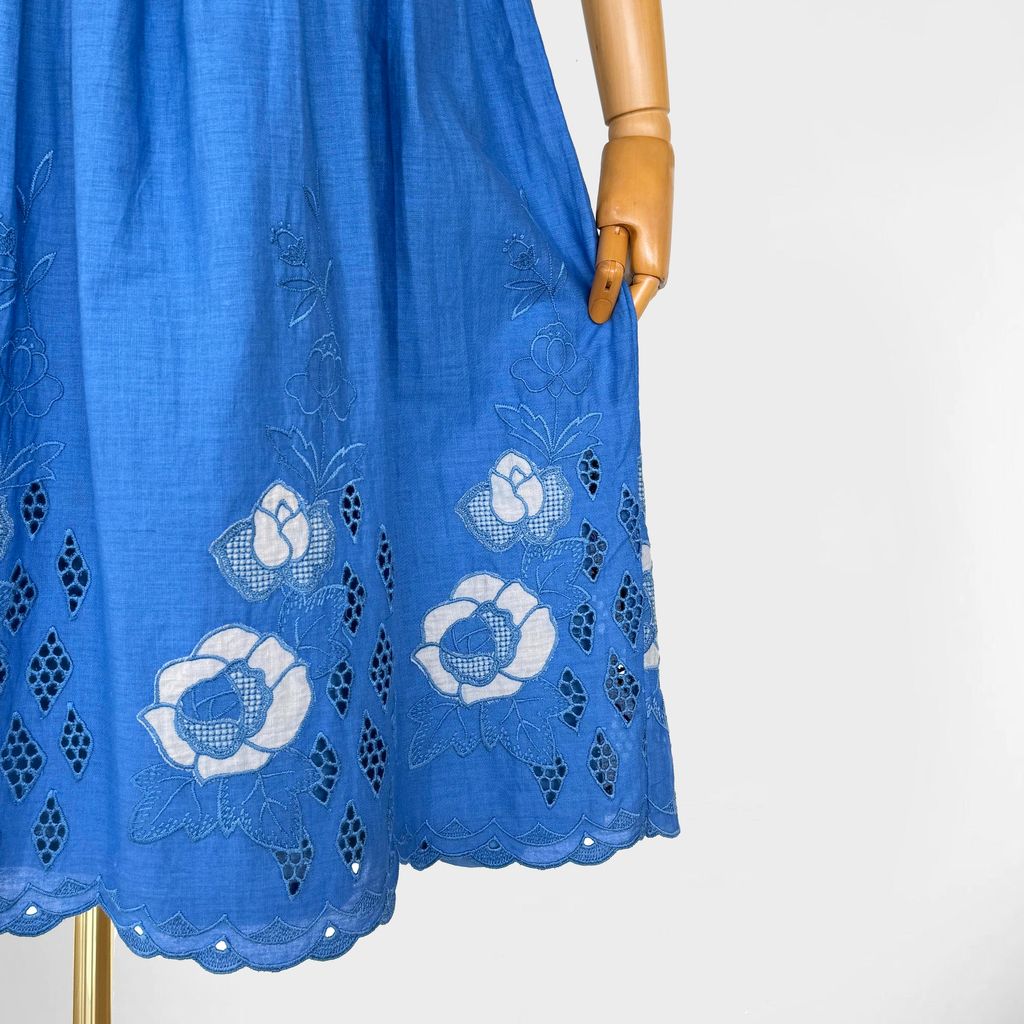 Circa 1980s. Exquitsite blue dress with florals embroidery dress.