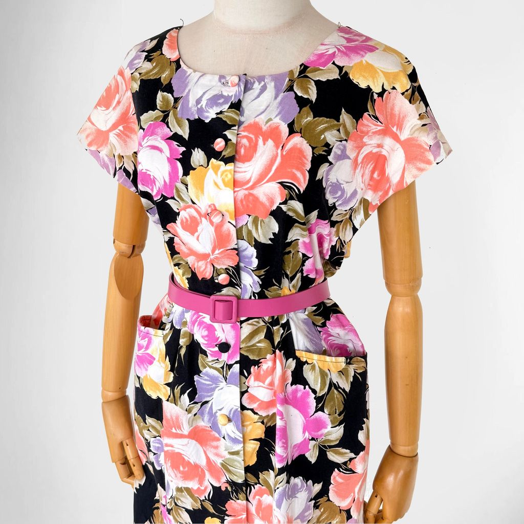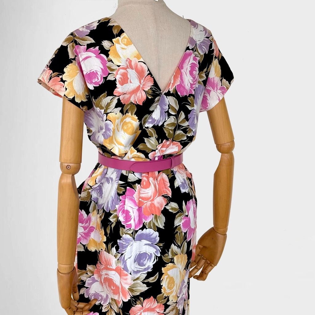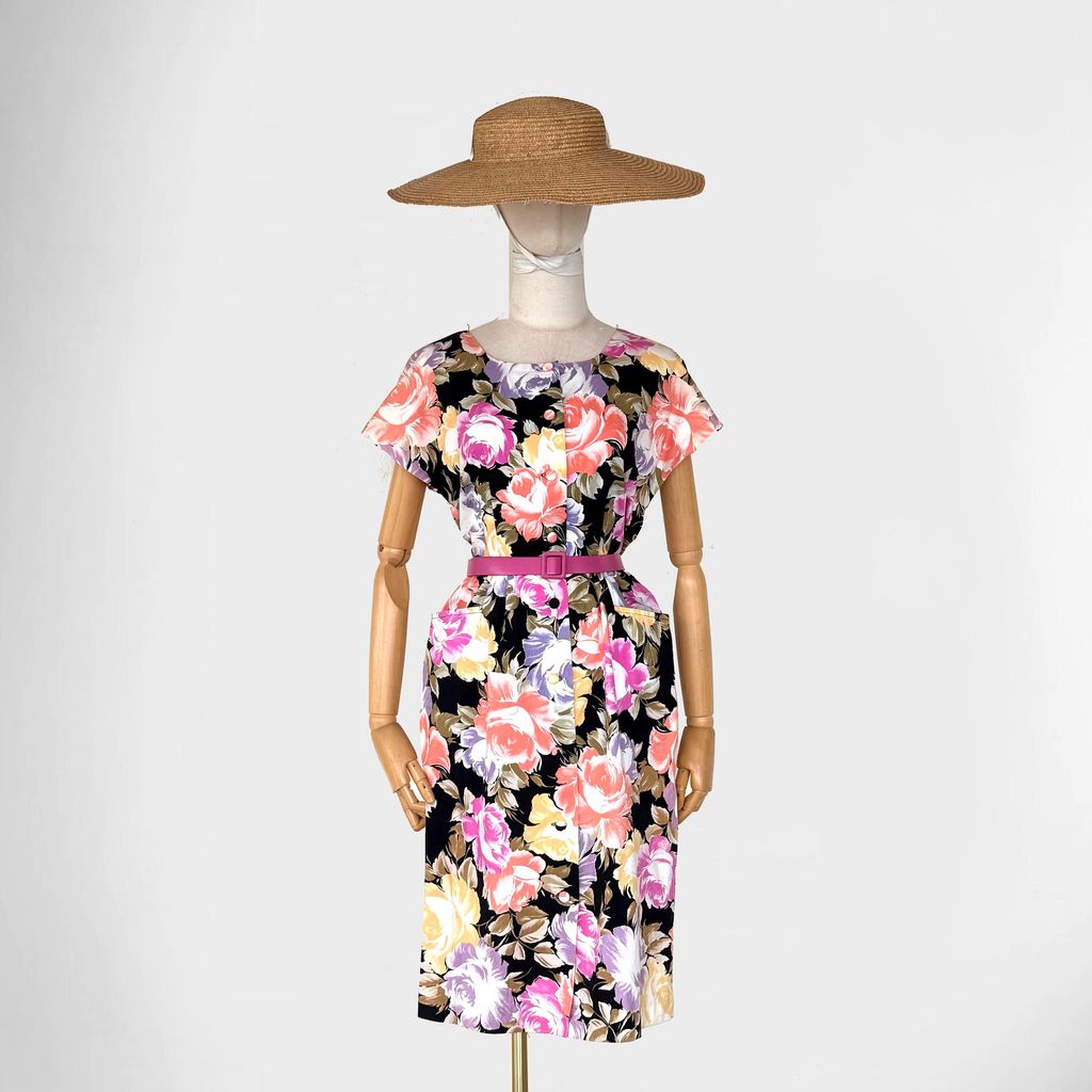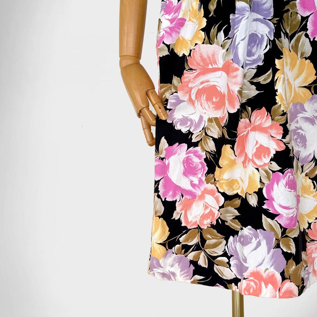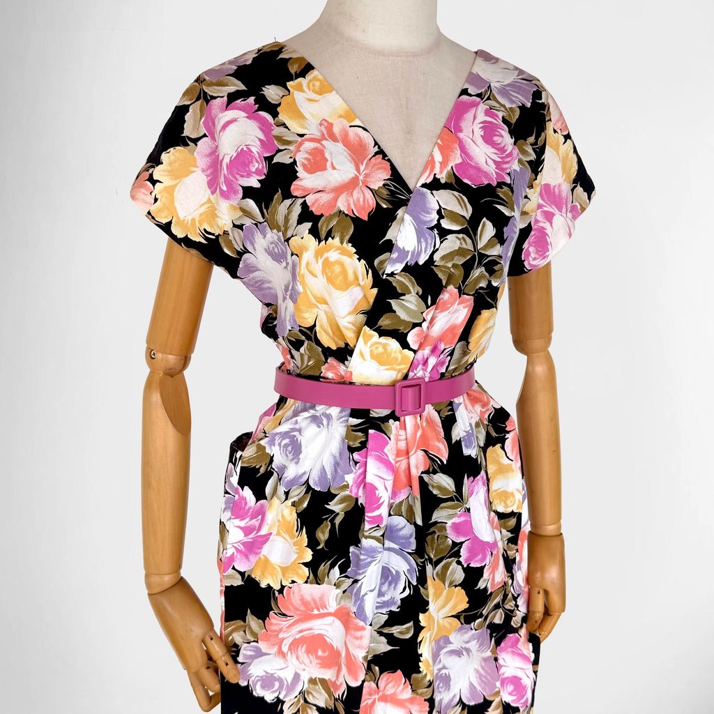 Circa 1980s. Exquisite black dress with bright colour roses print.