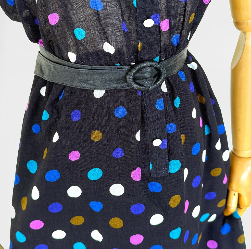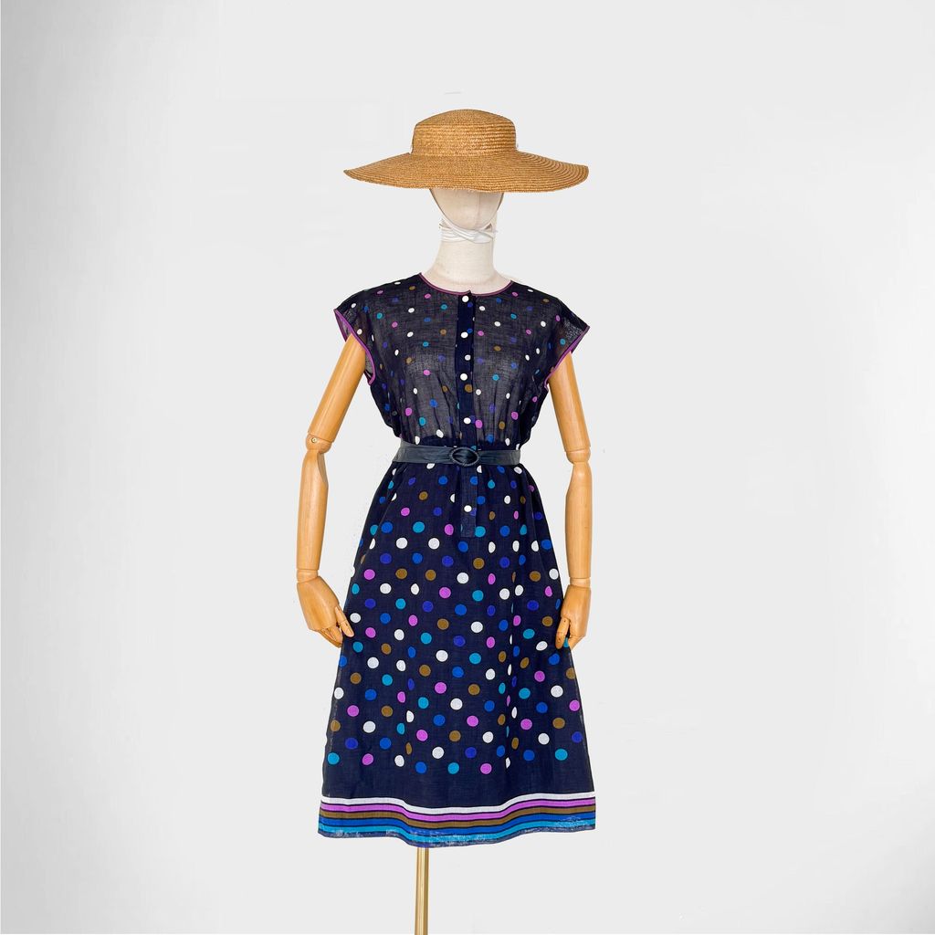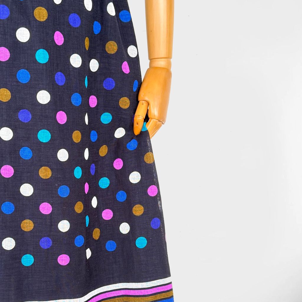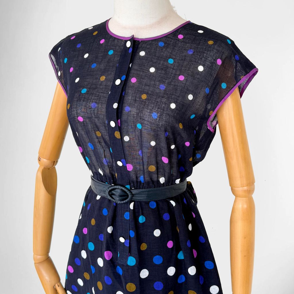 Circa 1980s. Dark blue dress with purple polka dots & stripes print.