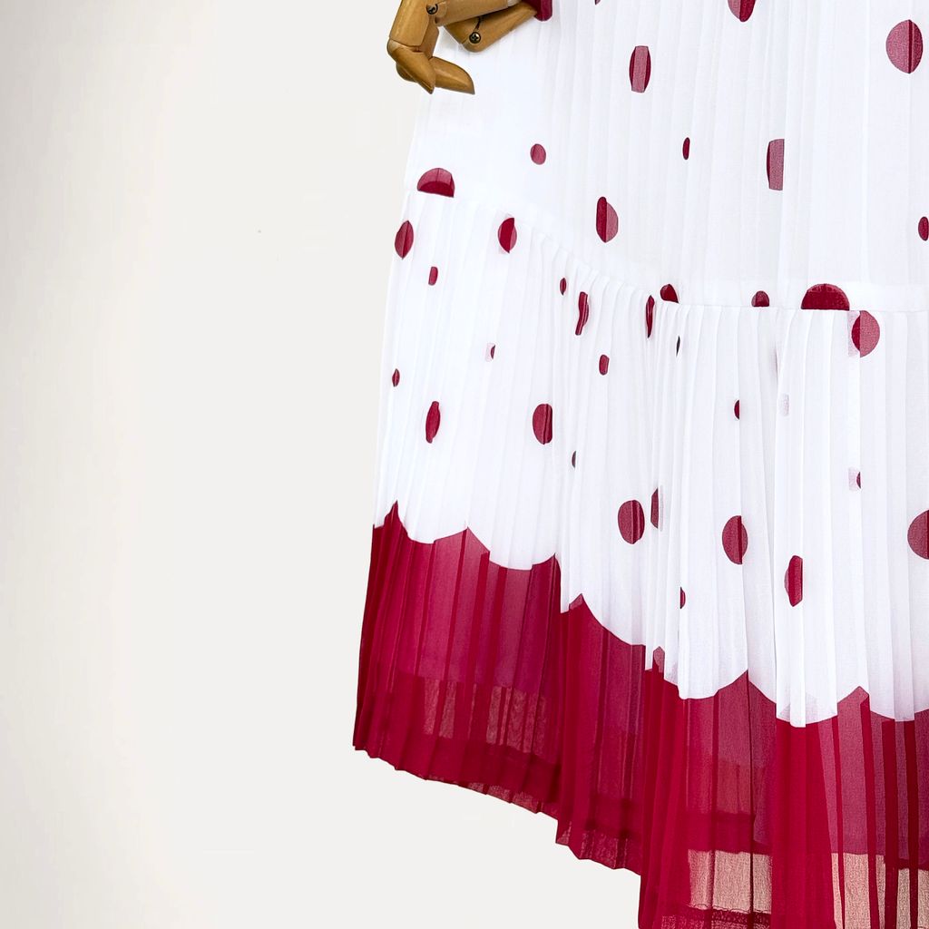 Back zip closure. Neckline with trim details and a mini bow. Beautiful pleated skirt with scolloped design at the bottom skirt. Elastic waist. Fully lined. Chiffon fabric. Belt not included.