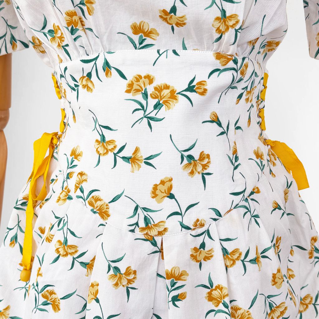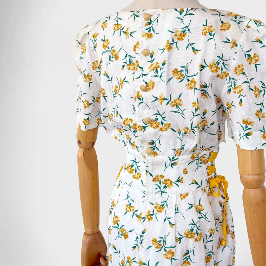 Circa 1980s. Lovely cream white dress with yellow floral print.