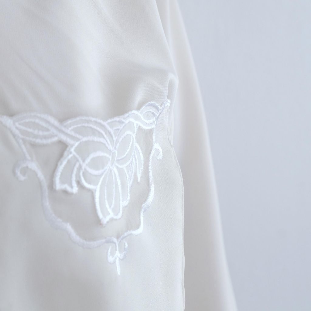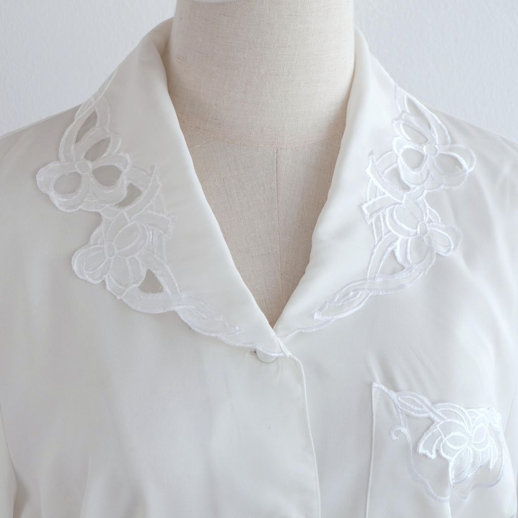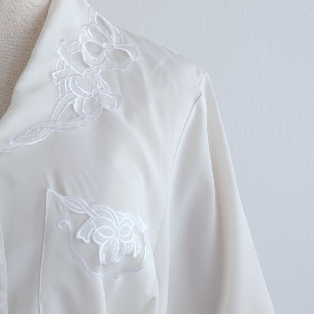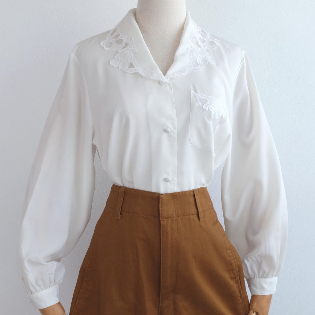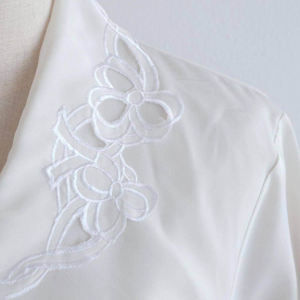 Circa 1980s. Elegant white blouse with ribbons embroidered.
