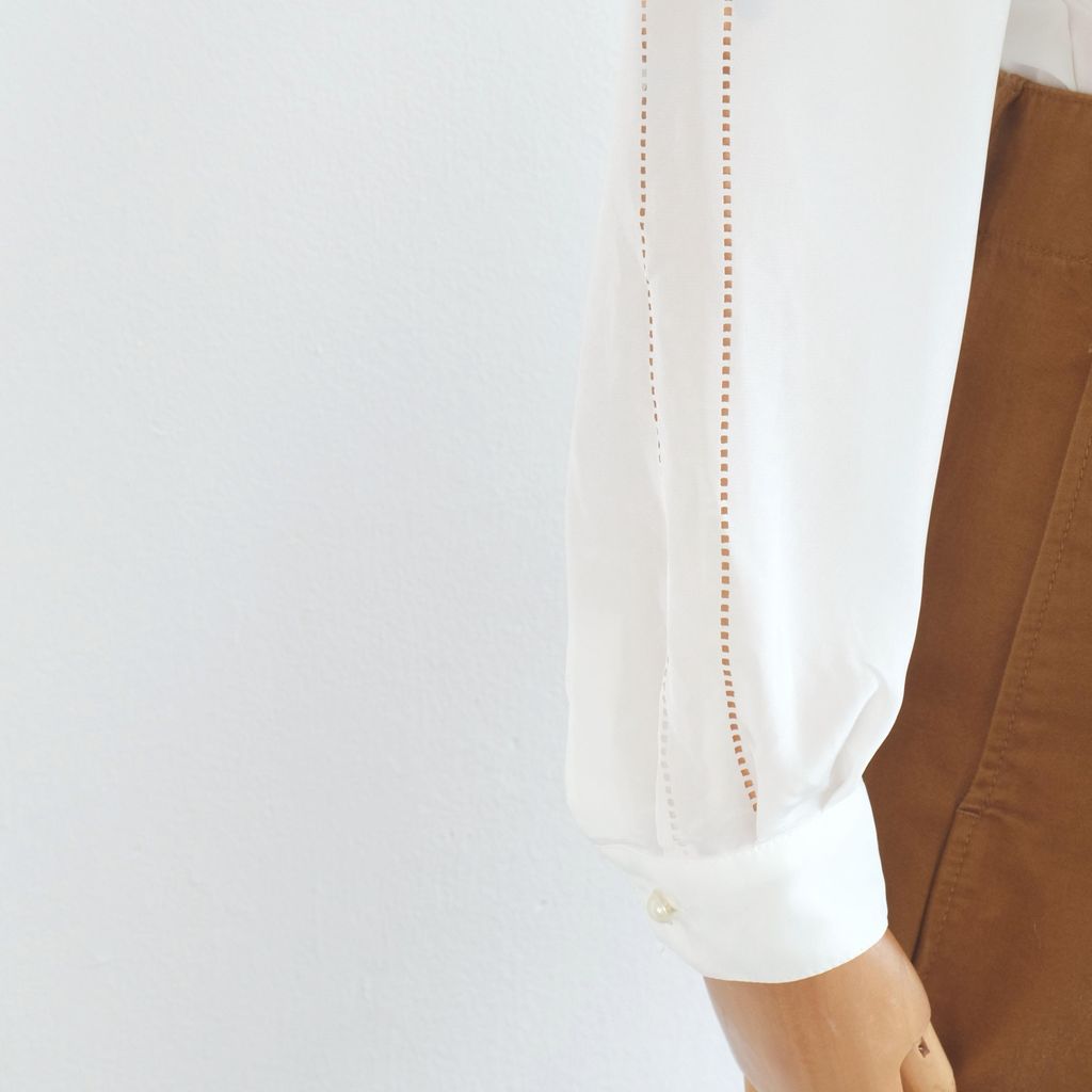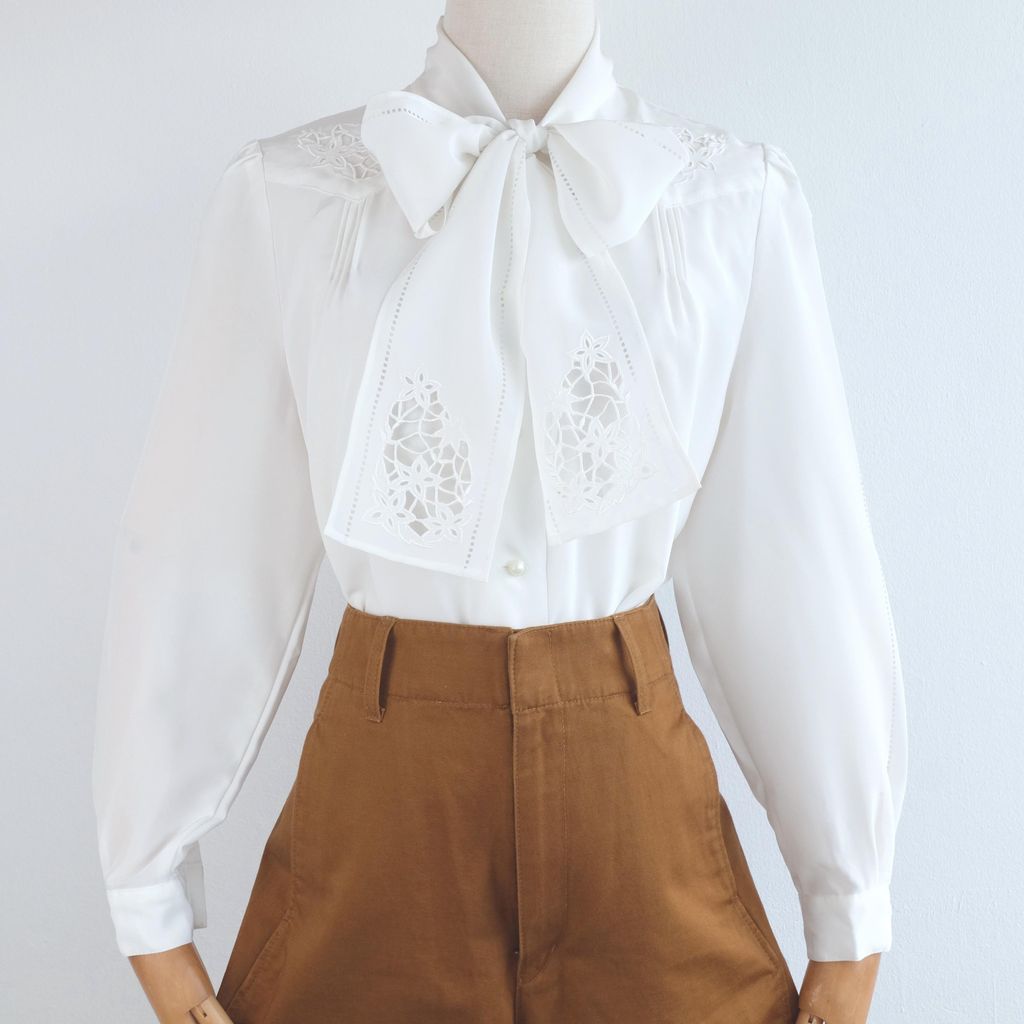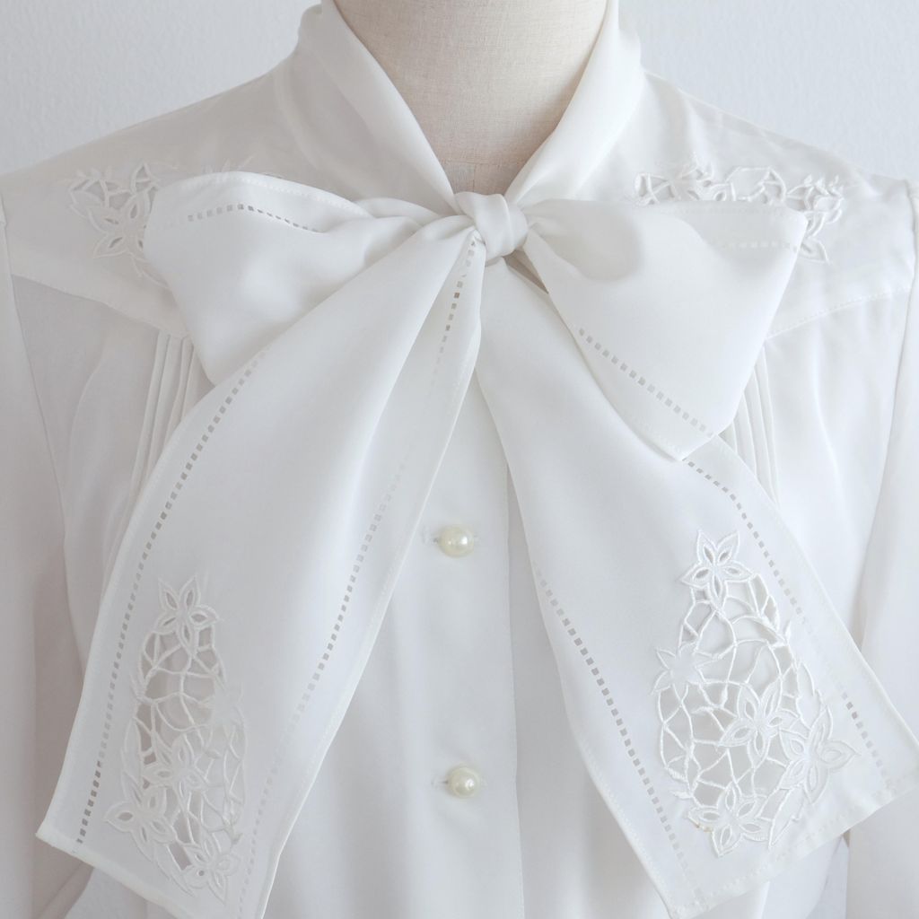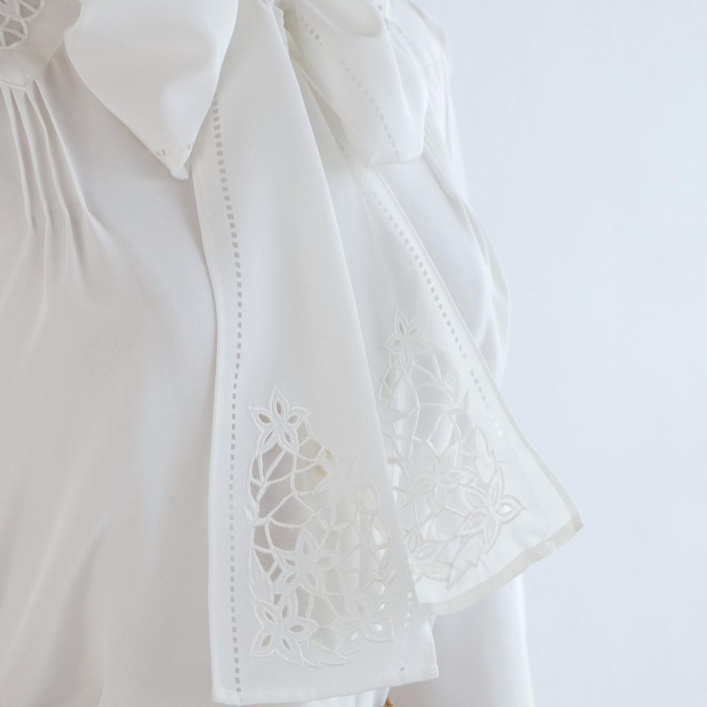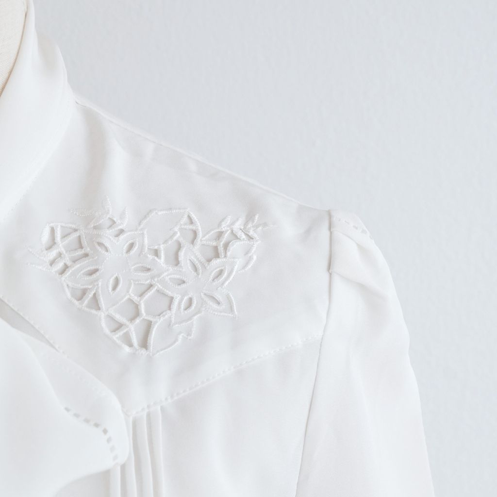 Tie neckline with embroidery details, functional buttons, chiffon fabric, long sleeves. Bottom not included.